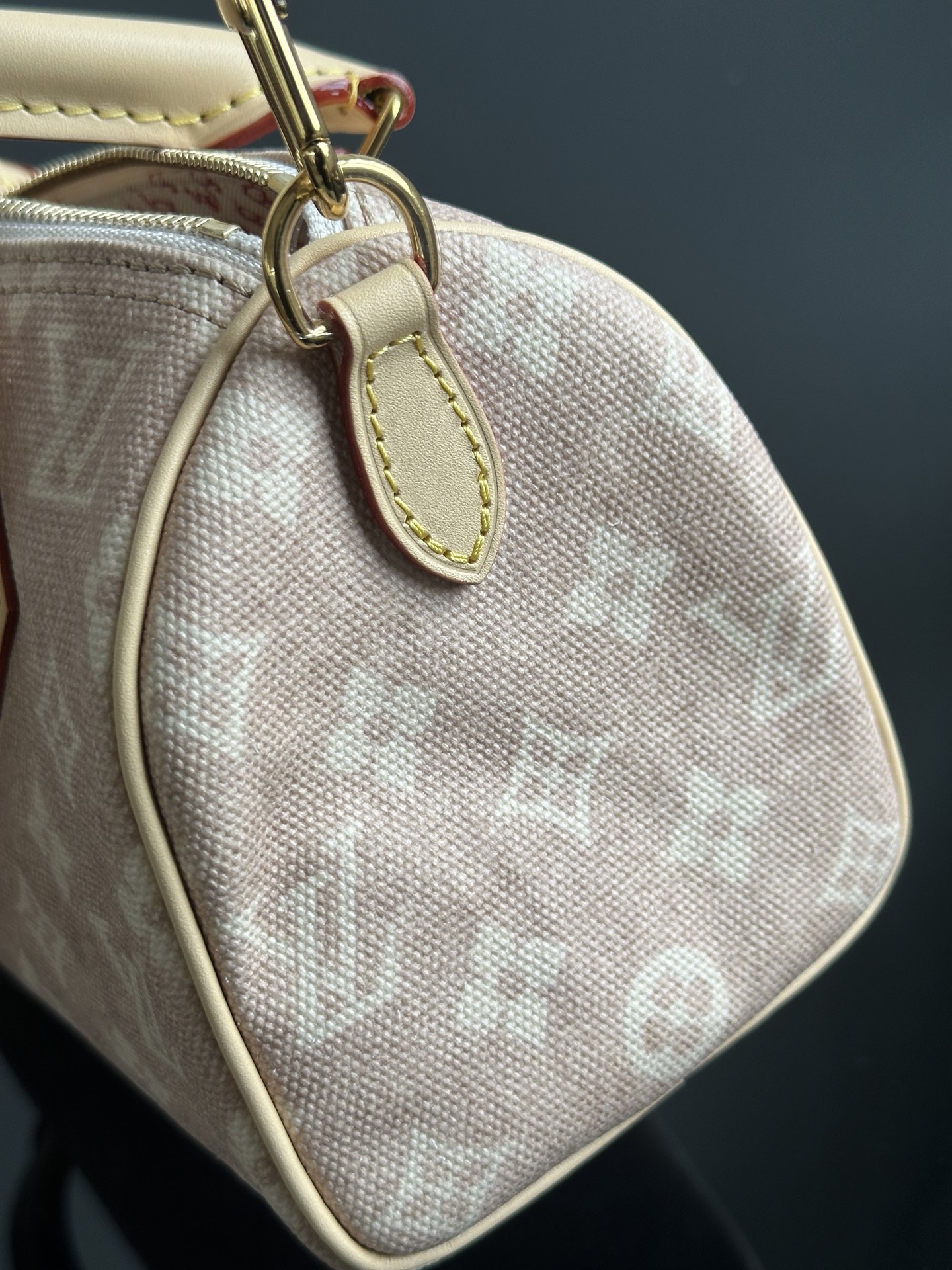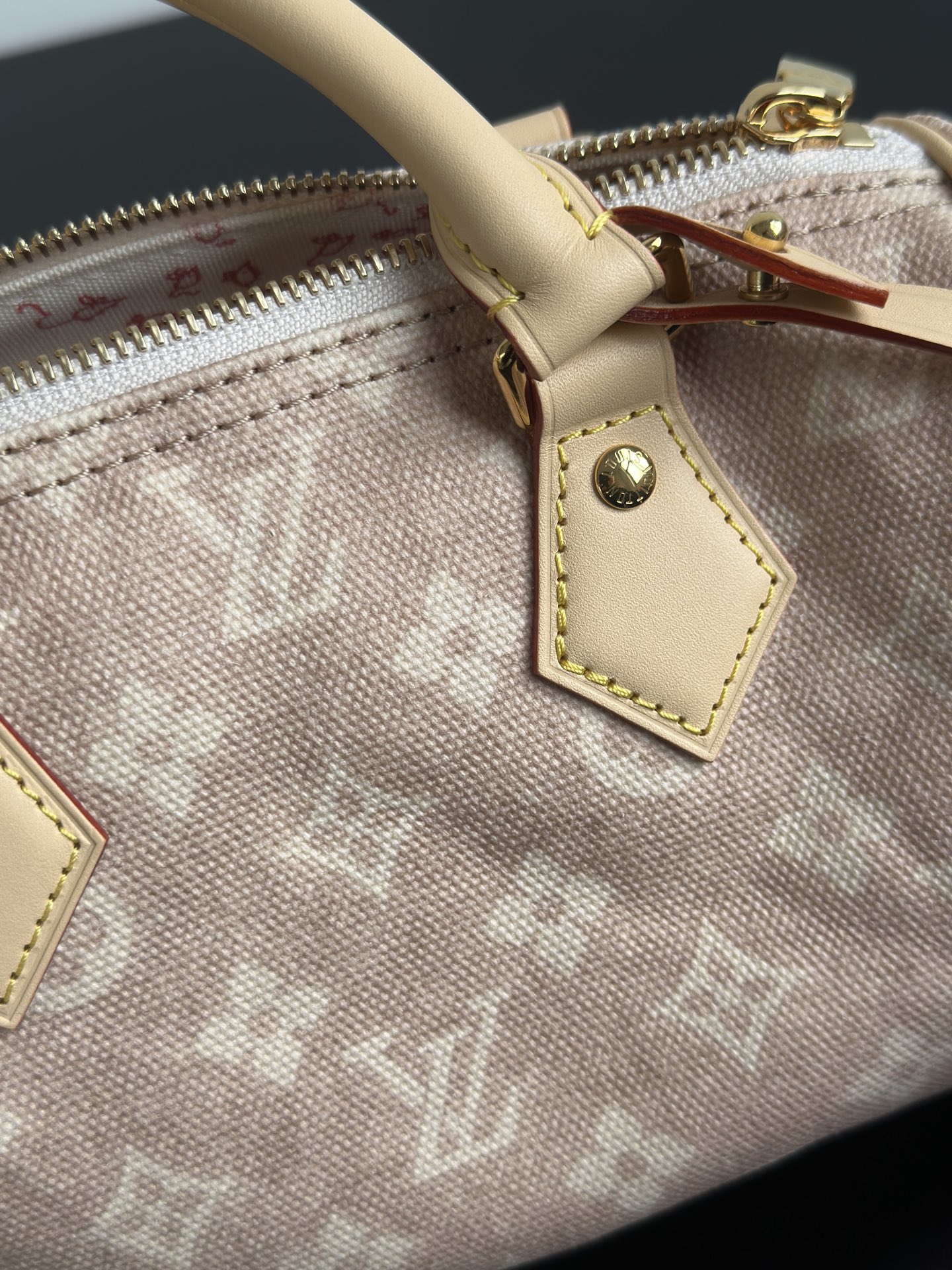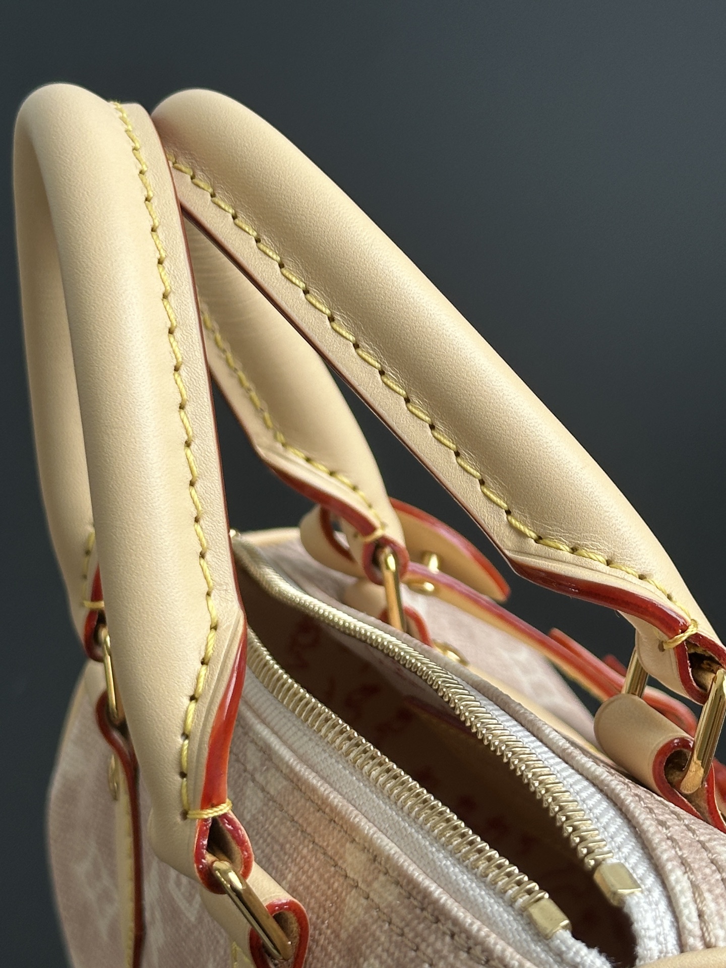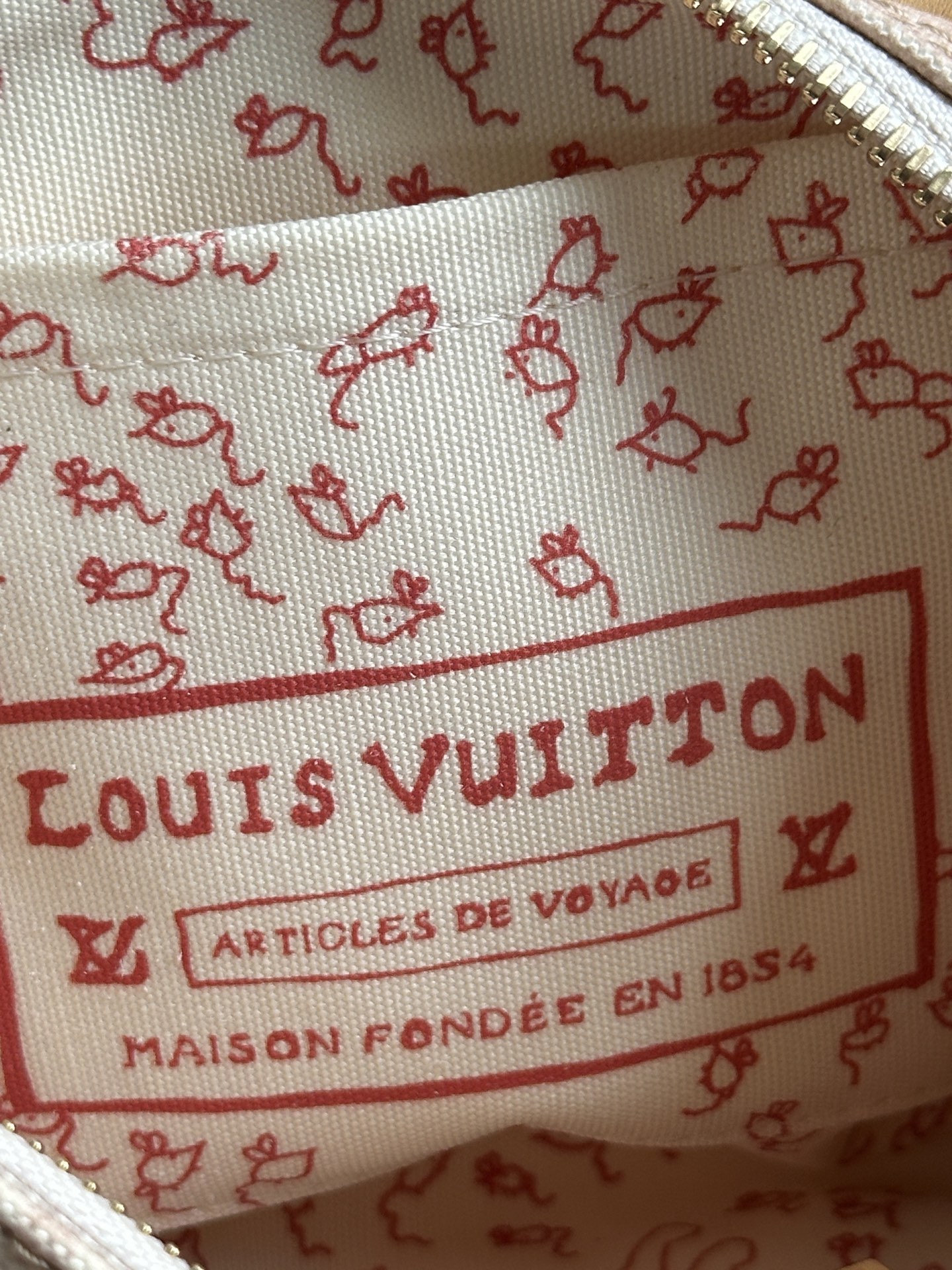 Speedy 20 Bandoulière 手袋取材 Meowgram 帆布,瞩目亮相品牌与 Vogue 前创意总监打造的 LV Travels With Grace Coddington 合作系列。可爱猫咪造型挂饰和皮革手柄丰富细节,挂锁等金属件再添考究笔触。尺寸:13.5 x 12 x 20.5 厘米