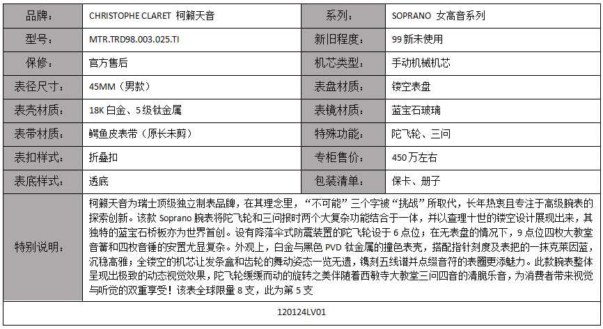 稀缺珍藏【99新未使用】柯籁天音SOPRANO 女高音系列18K白金、5级钛金属陀飞轮、三问手动机械机芯45MM男表MTR.TRD98.003.025.TI 120124LV01