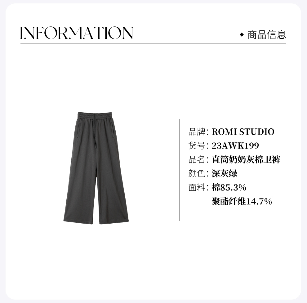 ROMI STUDIO"休闲精致感"、腔调穿搭松紧直筒奶奶灰棉卫裤23AWK199