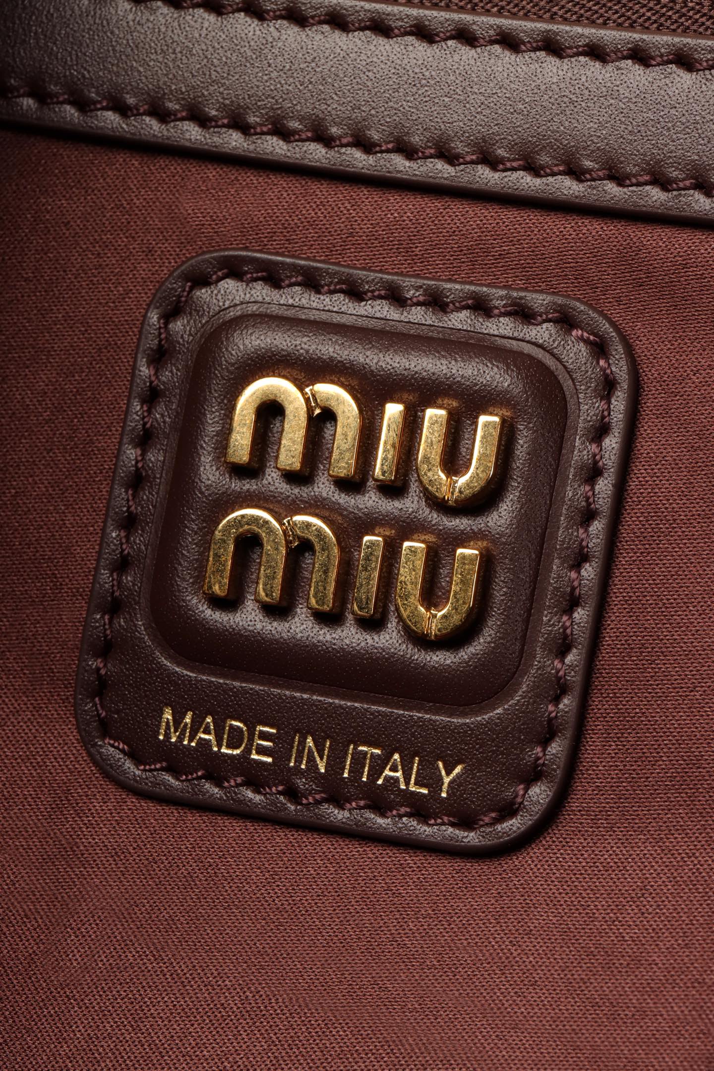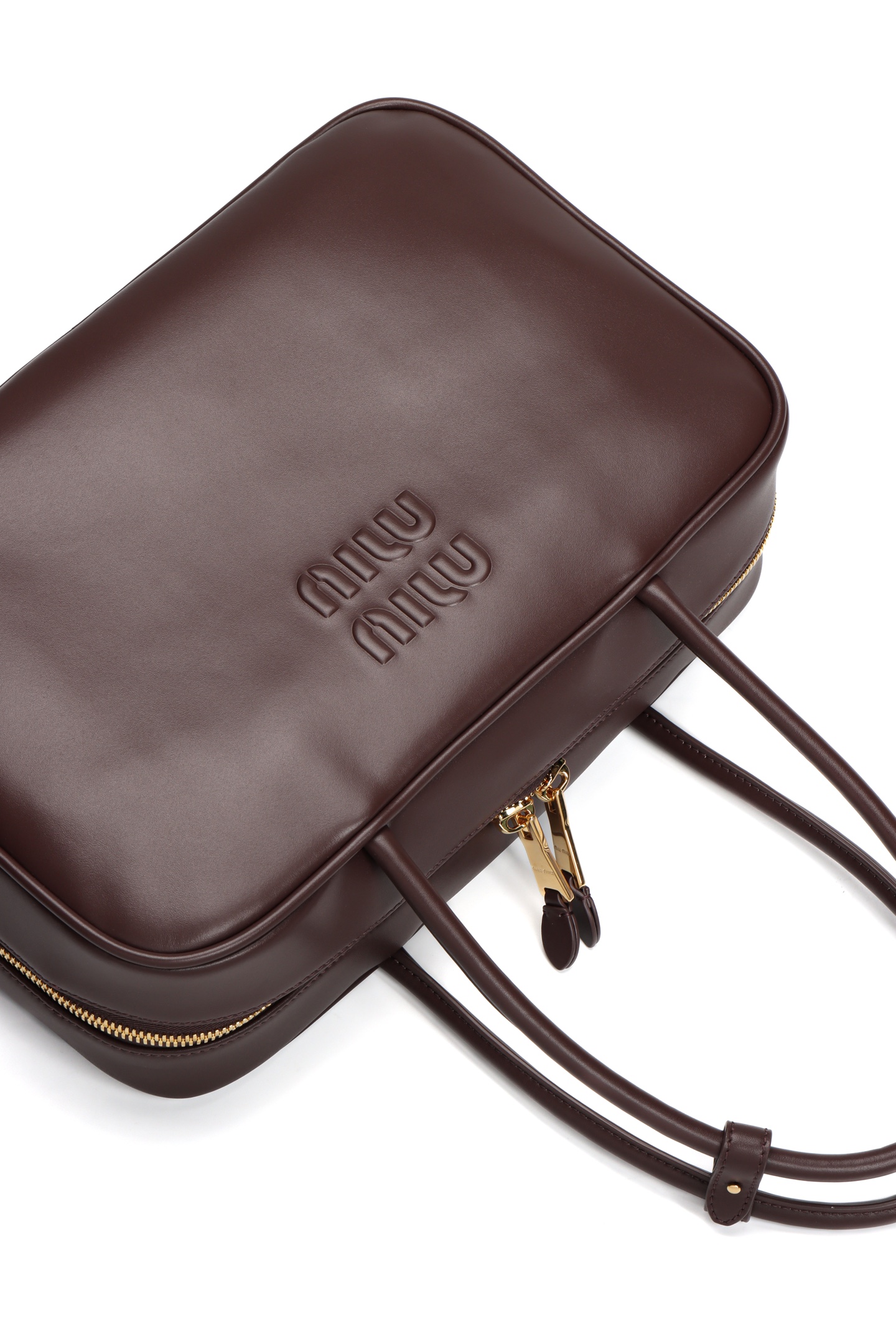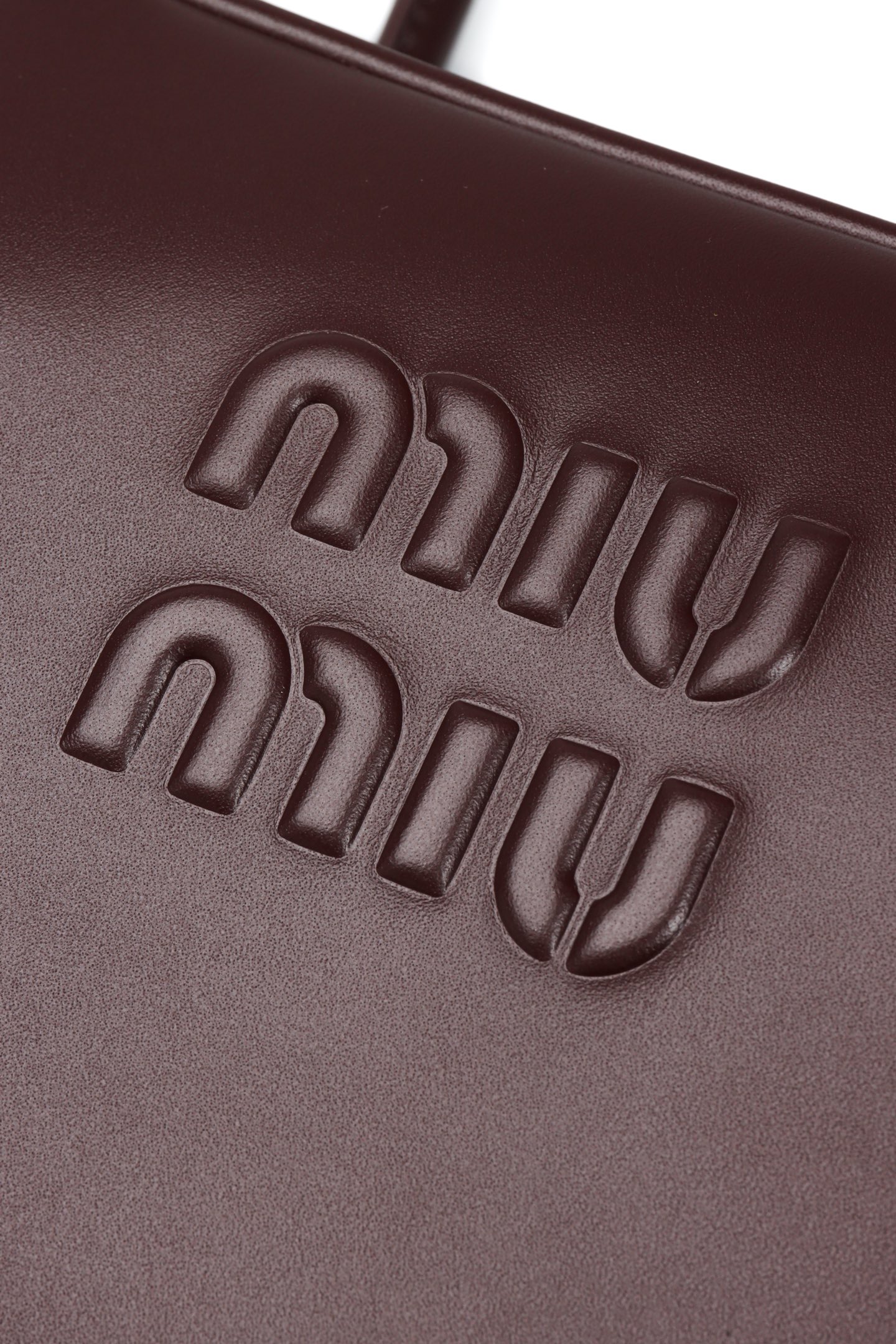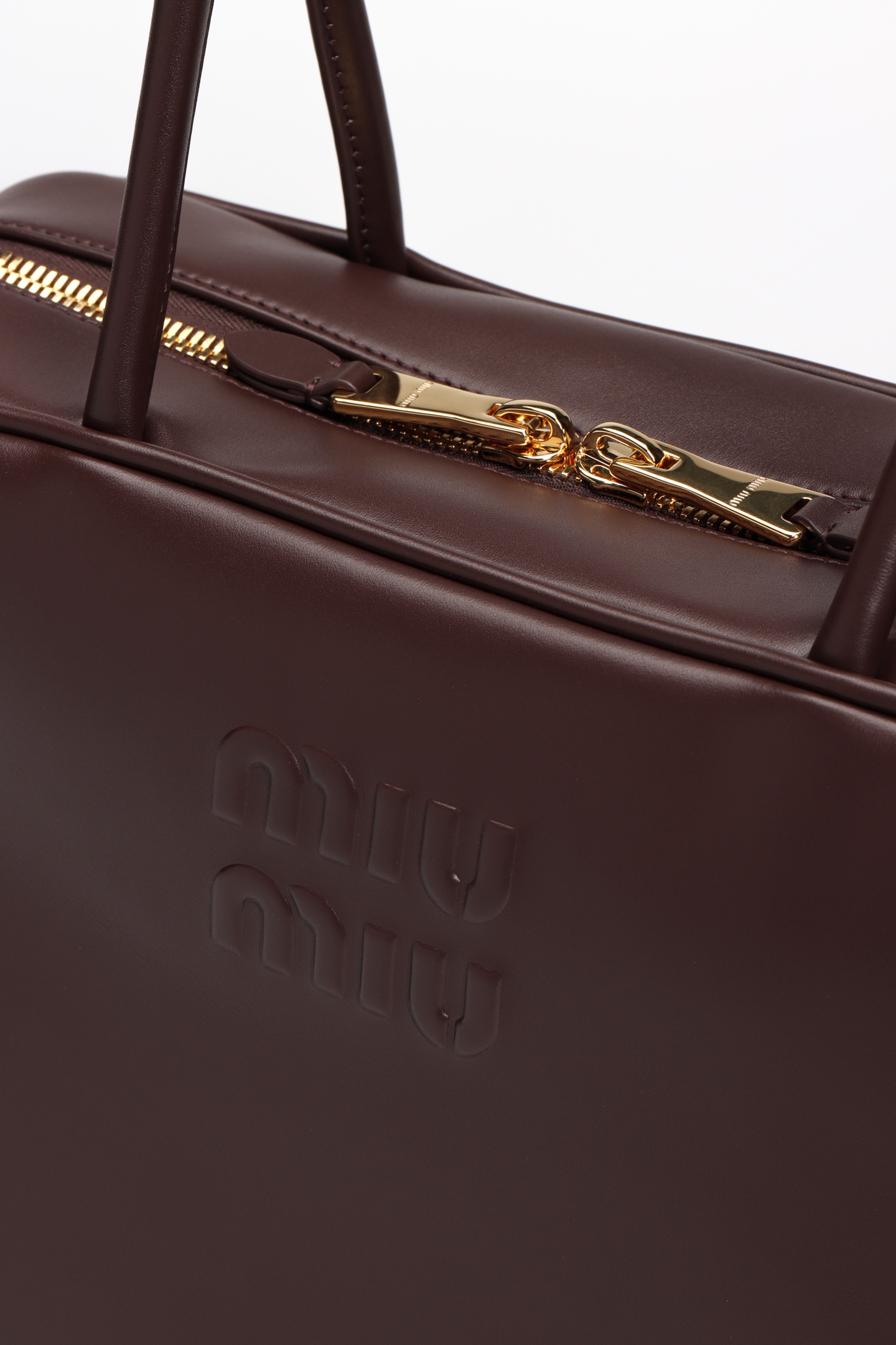 🟫𝐌𝐢𝐮𝐌𝐢𝐮 𝐁𝐞𝐚𝐮&石南木色|细节图 🔔Beau手袋采用柔软光滑皮革,镀金色五金配件等精致细节格外出众,压花字母徽标彰显经典格调。 * 皮革提手,适合用作手提包或单肩包 * 镀金色五金配件 * 正面压花字母徽标 * 拉链包口 * 棉缎衬里,双拉链口袋