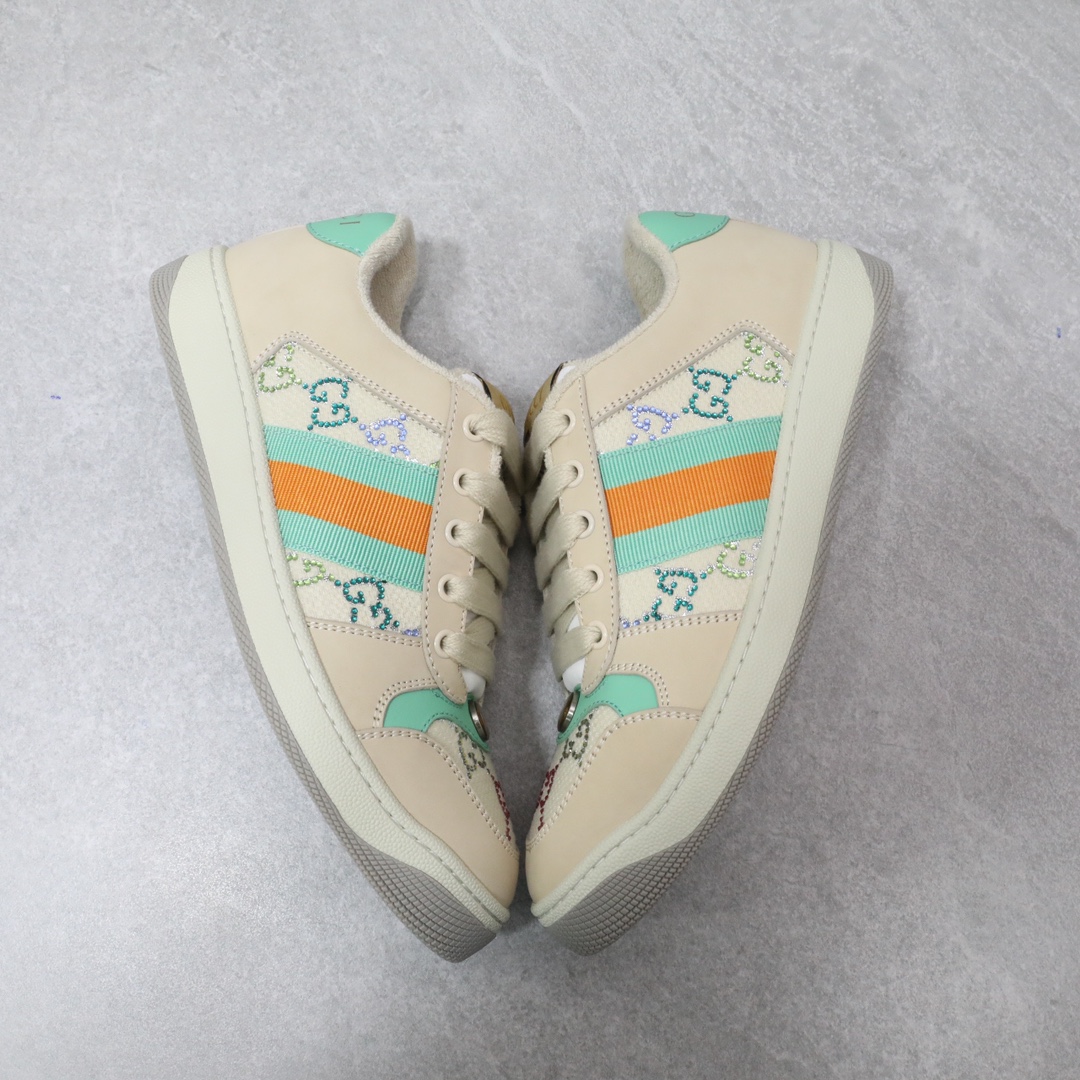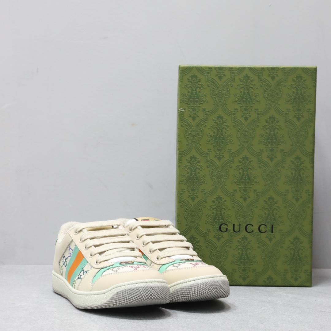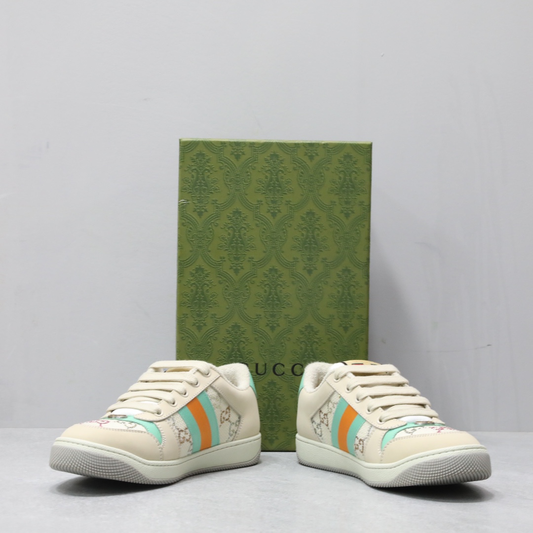 Screener系列运动小脏鞋,全部按zp升级空胶工艺,皮料和大底一次性做旧成型,而非市场货后期做旧,看上去非常廉价的颜色。內里是按照正品一致定制的棉纱混纺毛巾內里,厚度、透气性、手感都和正品一致。正品开模牛皮垫脚,冲压成型,而不是市场普通版本的手工开料。按原版开模的金属双G椭圆形珐琅五金,最新的大底相比之前的版本细节有所调整,我们同样做了升级,独家私模和正品一致的TPR大底无论是软硬度、纹路的线条和清晰度以及穿着舒适度上,都完美还原原版工艺。市场通货的橡胶底不但颜色、纹路、鞋底蜜蜂图案不对,而且完全没有质感。鞋底厚度约为2.5cm。正品一致全套包装 SIZE:35-44