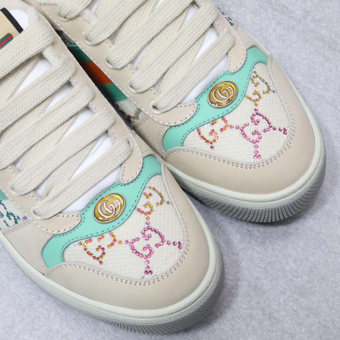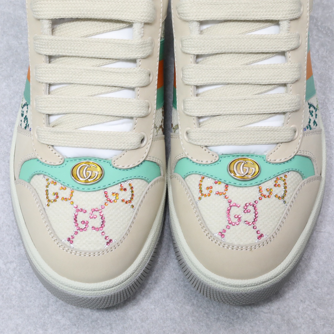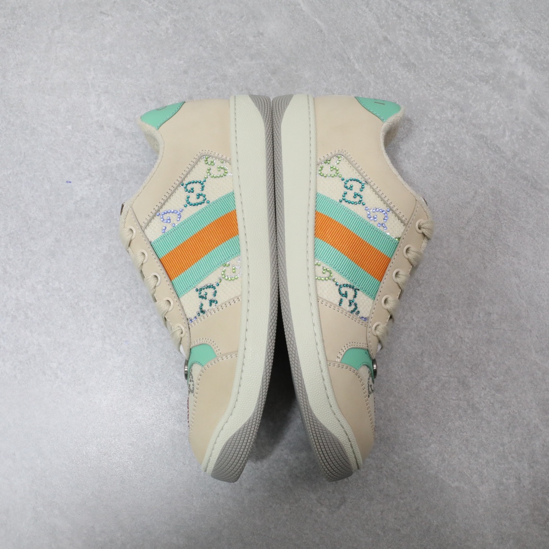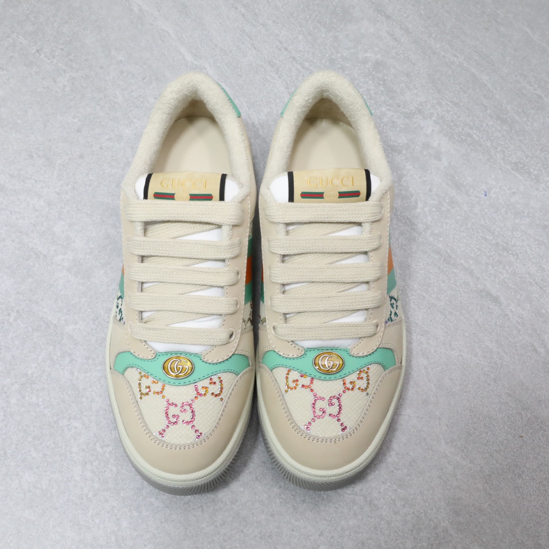 Screener系列运动小脏鞋,全部按zp升级空胶工艺,皮料和大底一次性做旧成型,而非市场货后期做旧,看上去非常廉价的颜色。內里是按照正品一致定制的棉纱混纺毛巾內里,厚度、透气性、手感都和正品一致。正品开模牛皮垫脚,冲压成型,而不是市场普通版本的手工开料。按原版开模的金属双G椭圆形珐琅五金,最新的大底相比之前的版本细节有所调整,我们同样做了升级,独家私模和正品一致的TPR大底无论是软硬度、纹路的线条和清晰度以及穿着舒适度上,都完美还原原版工艺。市场通货的橡胶底不但颜色、纹路、鞋底蜜蜂图案不对,而且完全没有质感。鞋底厚度约为2.5cm。正品一致全套包装 SIZE:35-44