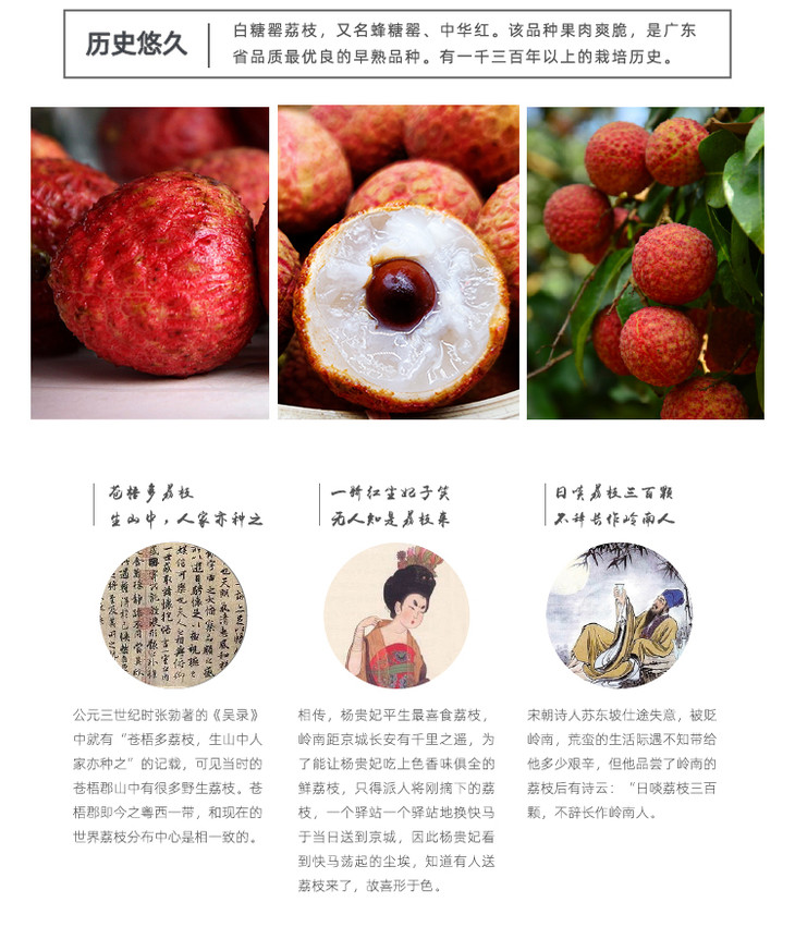 ① 广东荔枝历史悠久,2000多年历史,特别是茂名地区占全世界的1/5的产量