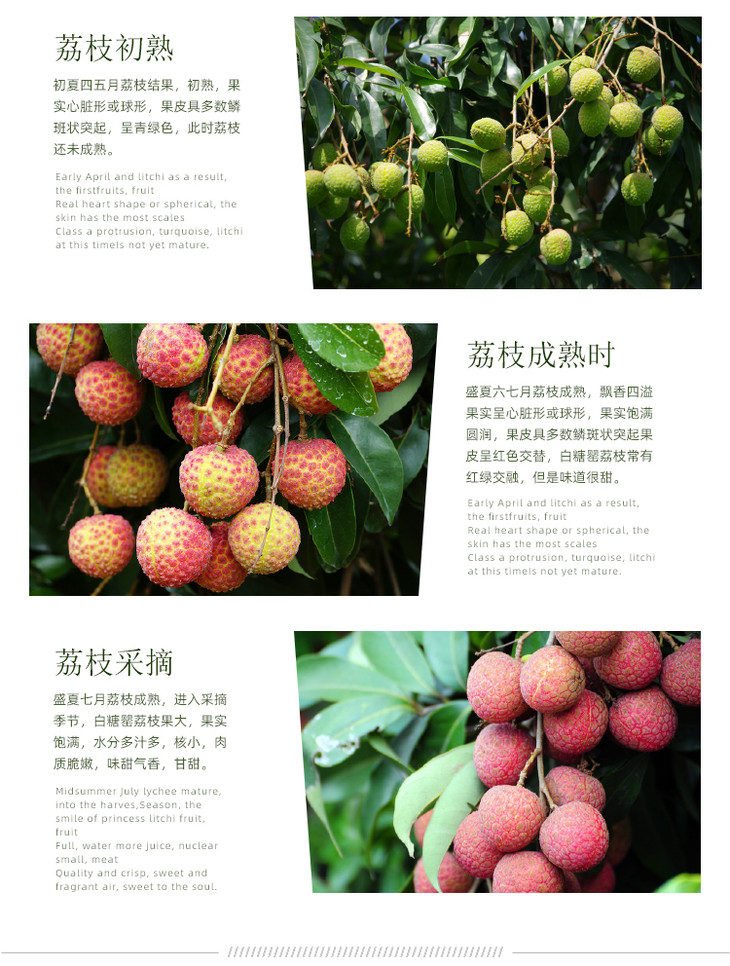 ② 我们做的荔枝从广东湛江早熟的白糖罂到茂名的妃子笑和白糖罂,都是精品果,已经操作了7年时间