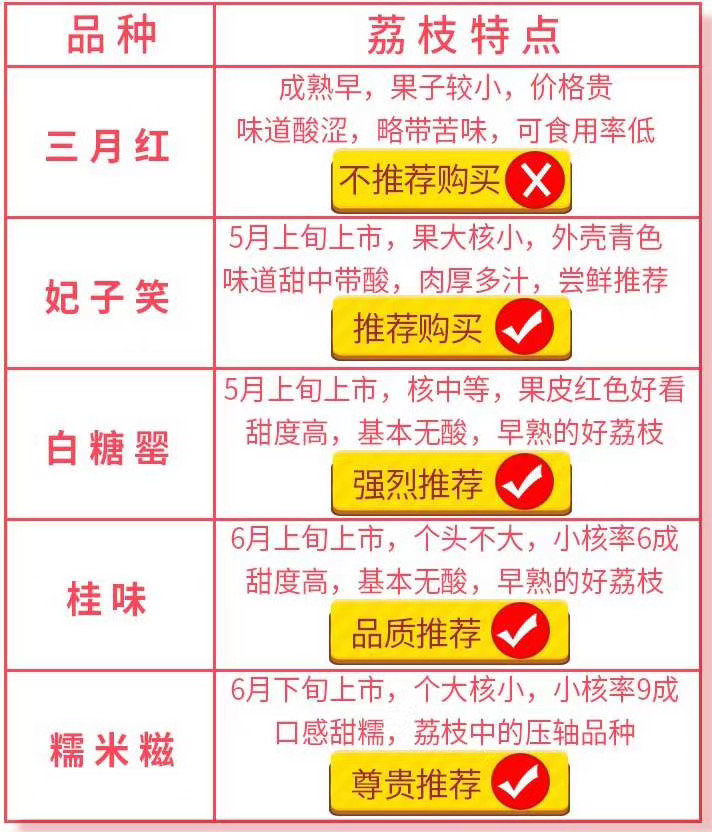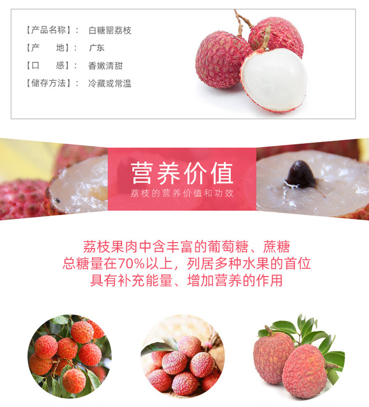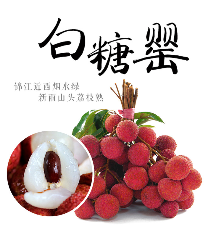A:白糖罂荔枝纯甜爽脆,个头相对妃子笑稍小,因今年产地干旱,荔枝大部分也比往年上小一些,但是口感上会更甜哦。