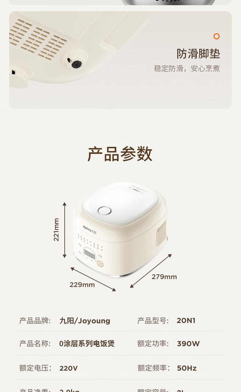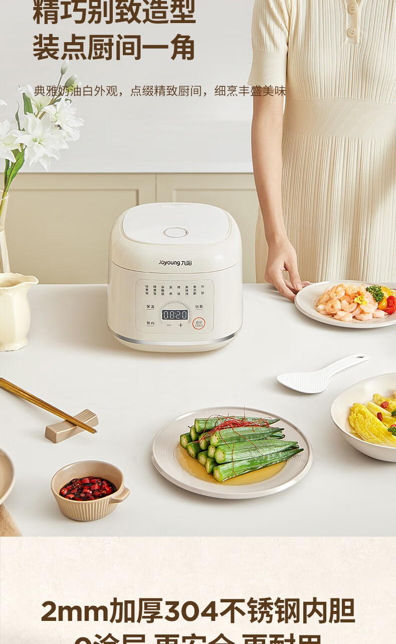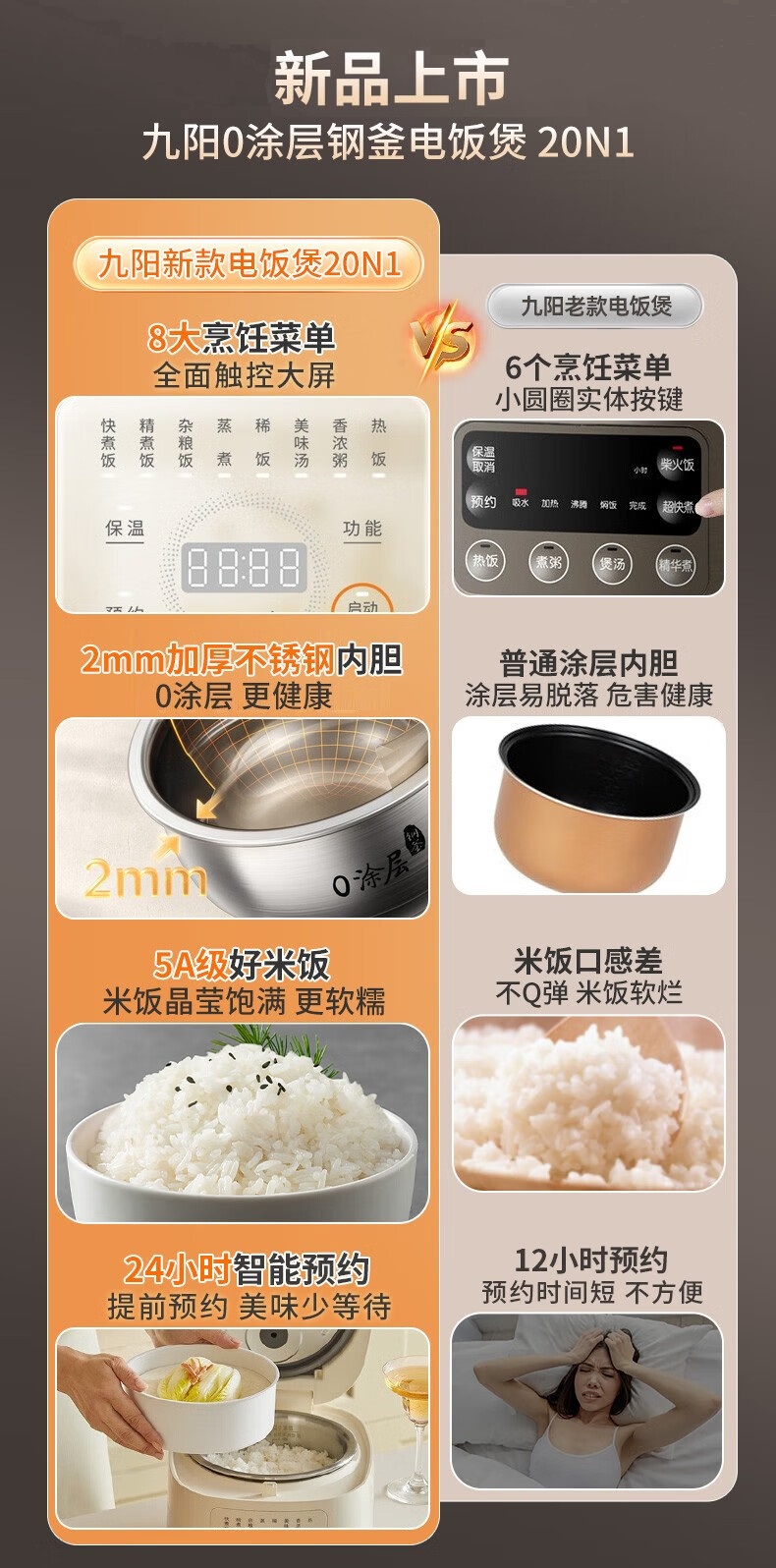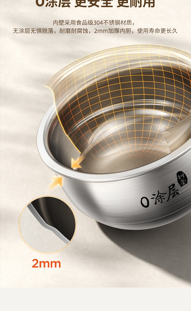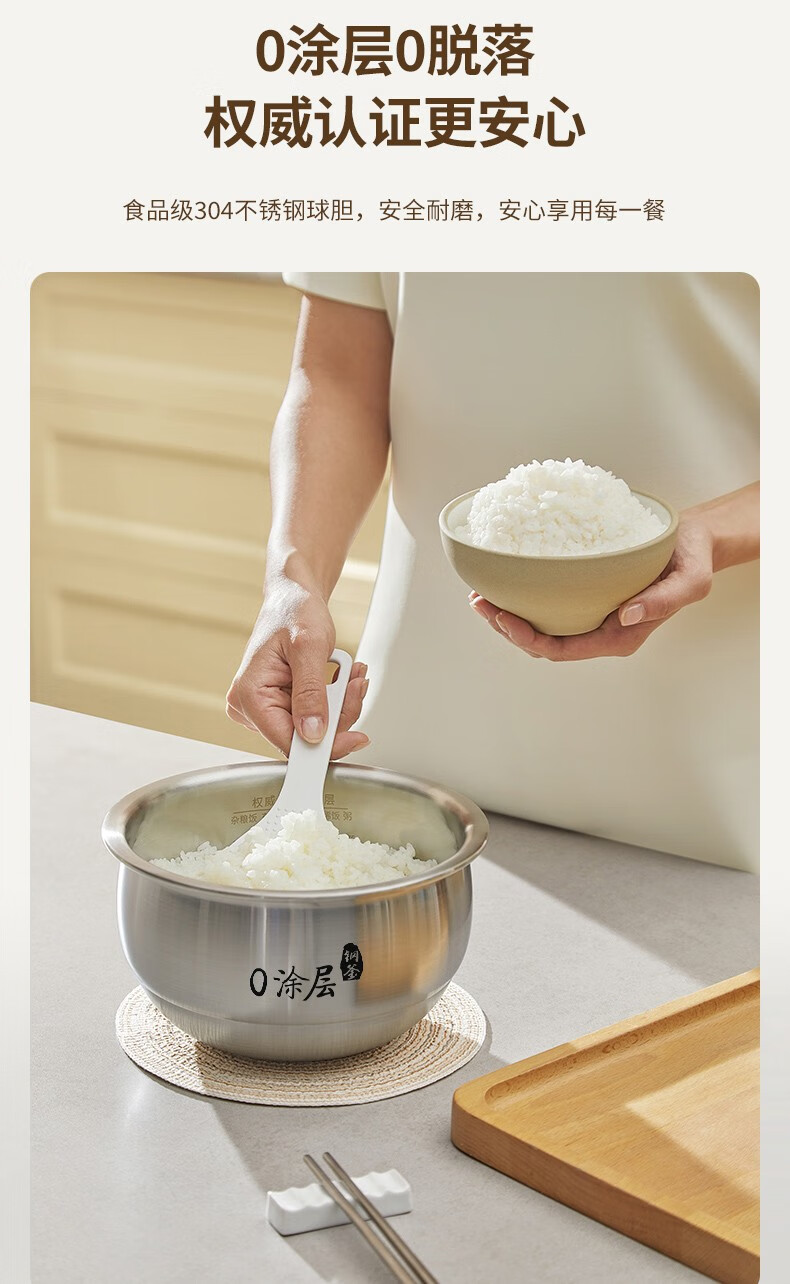九阳0涂层电饭煲家用2L升304不锈钢球形内胆智能预约多功能电饭锅