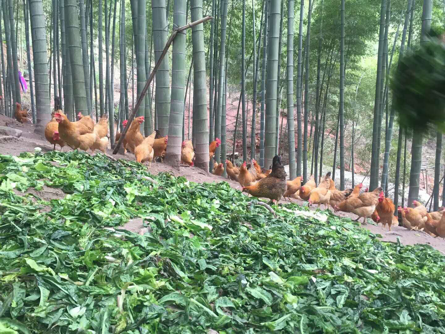 土鸡散养在竹林中: