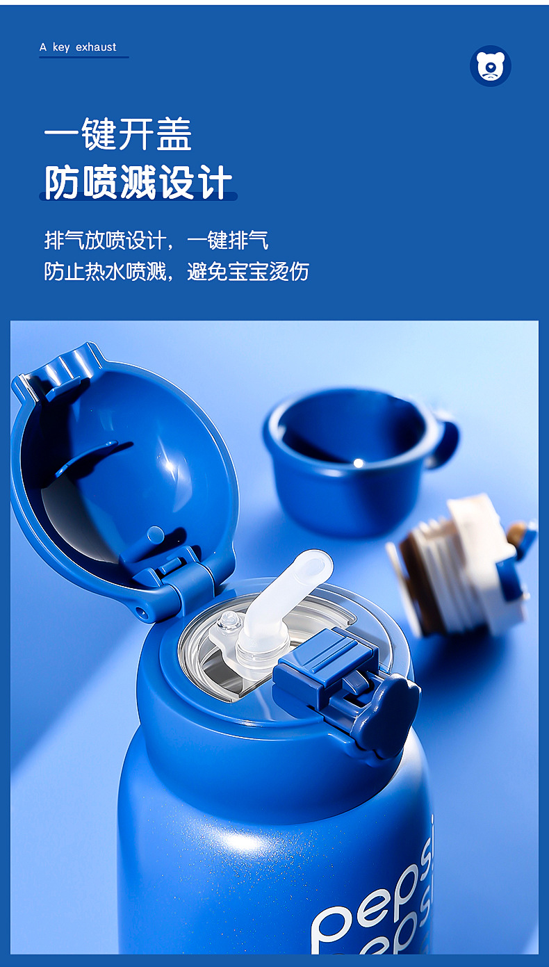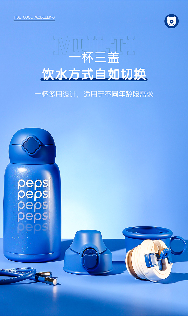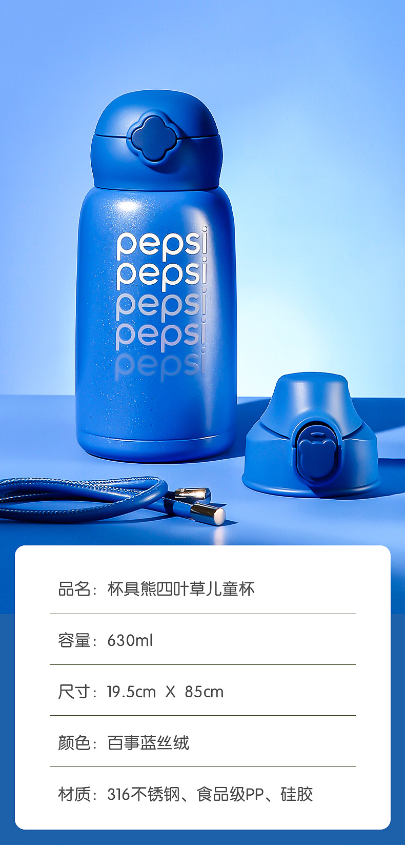 【官方防伪】杯具熊四叶草儿童保温杯-百事可乐蓝丝绒三盖皮套水杯630ml