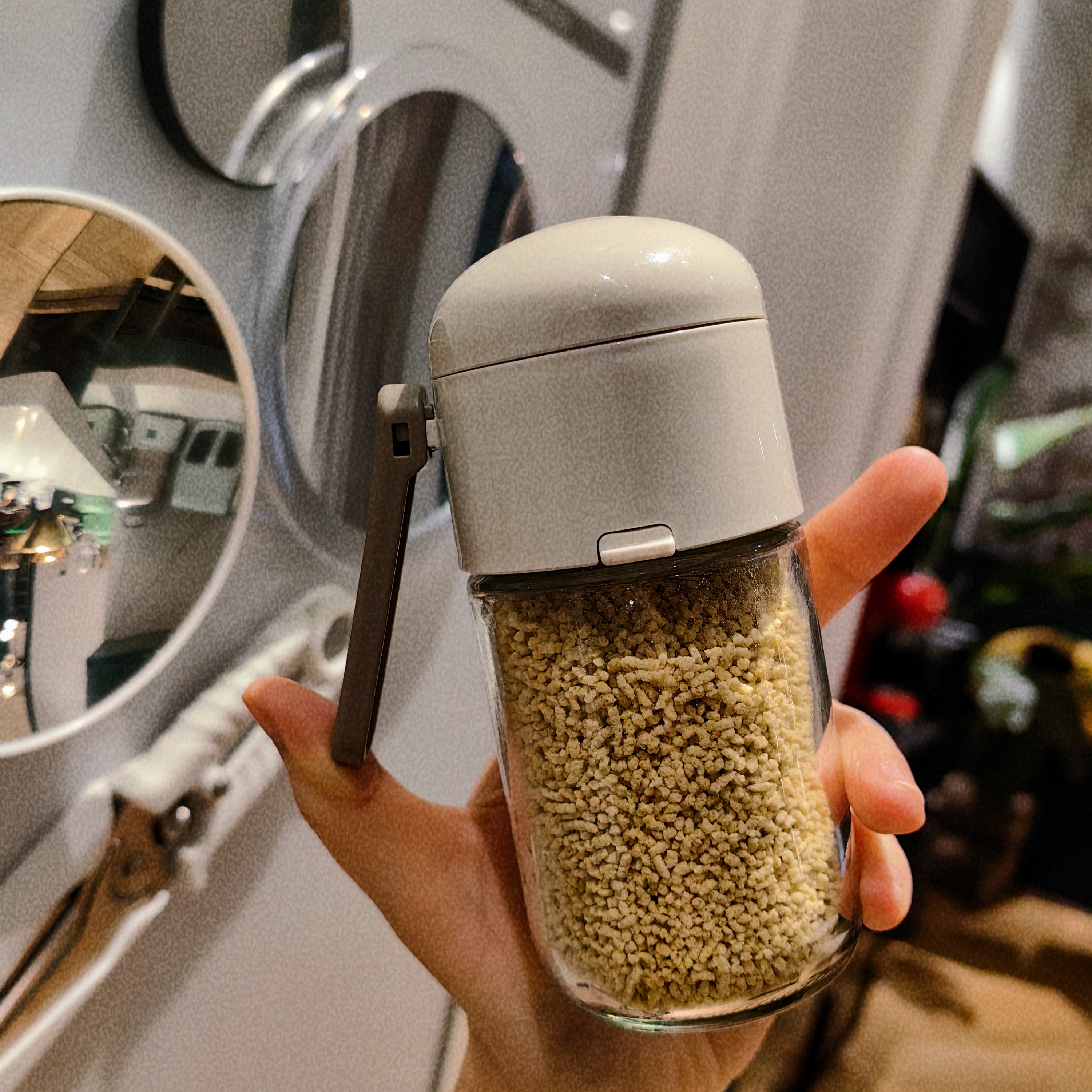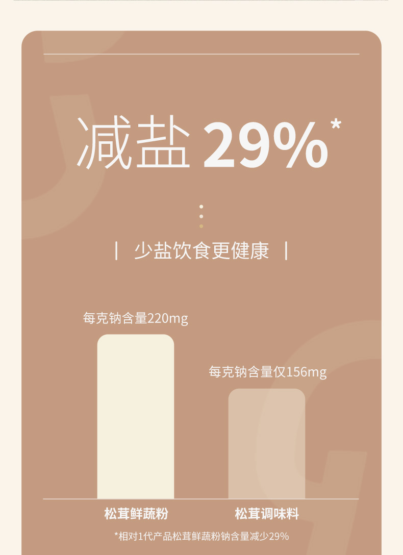 这款是整整研发了5年才上市的松茸鲜鲜蔬粉,看上去跟鸡精差不多,鲜味跟鸡精比有过之而无不及。鲜蔬粉的鲜味主要来源于松茸,大家都知道松茸被誉为“万菌之王”,富含18种氨基酸、14种人体必需微量元素、49种活性营养物质,更有双链松茸多糖、松茸多肽和松茸醇,食用松茸对身体非常好。除了松茸外,还加入了香菇、草菇、杏鲍菇,几种不同的菇类带来丰富的鲜美口感!为了让鲜味更加有层次感,鲜蔬粉里还特别加了海苔、玉米、红萝卜、苹果。通过将这11种健康食材放入净水池中清洗、去污,再高温灭箘,炉内烤制烘干,磨碎成粉,才使松茸鲜蔬粉既鲜美又营养!