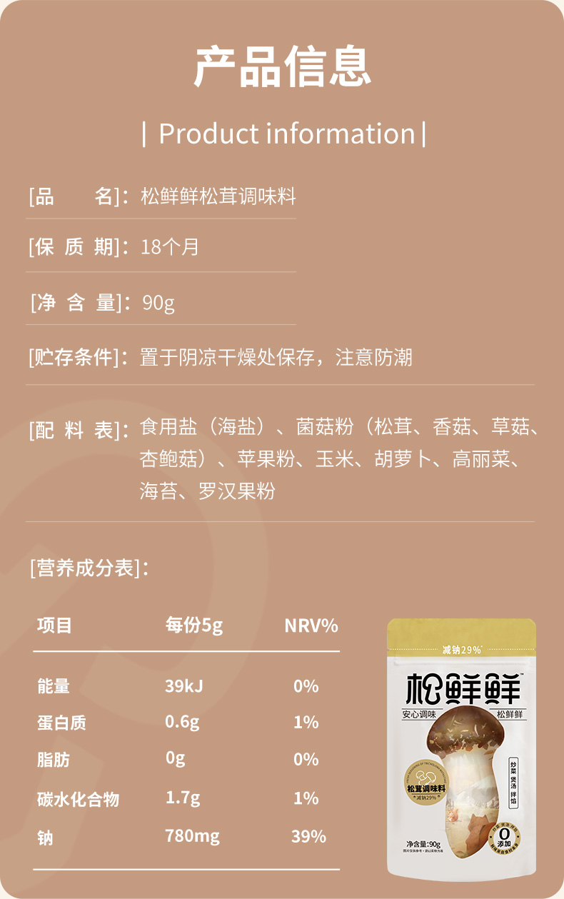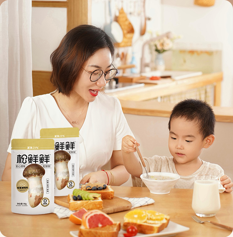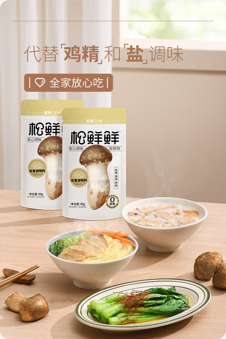 因为考虑到无添加的调料做大包装容易潮,所以品牌方把松茸鲜蔬粉做成90克一包,非常小巧,用完再拆包,很新鲜。只要一勺,美食就会散发出天然的味道,煲汤必备!