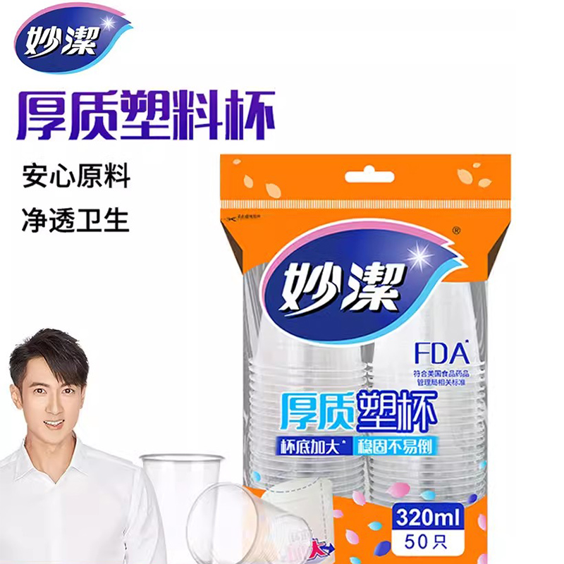 妙洁一次性杯子厚质透明 320ml大号50只/袋