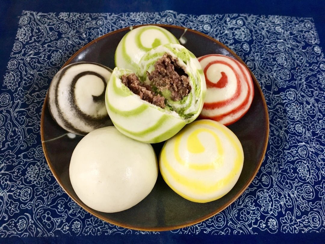 豆包两种馅,白黄绿是桂花红糖红豆馅,黑红是白芸豆馅