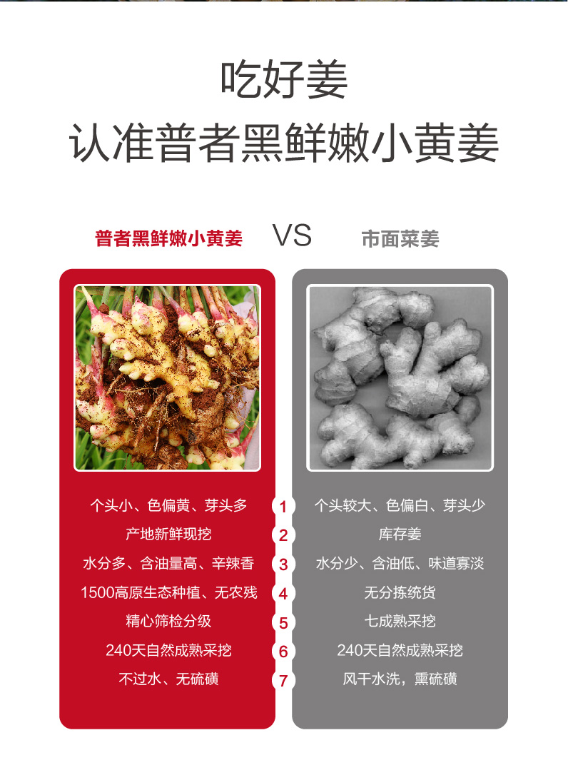 5、市面上的姜基本都是无筛检的统货,普者黑鲜嫩小黄姜坚持人工筛选,严苛品控,产地直发。