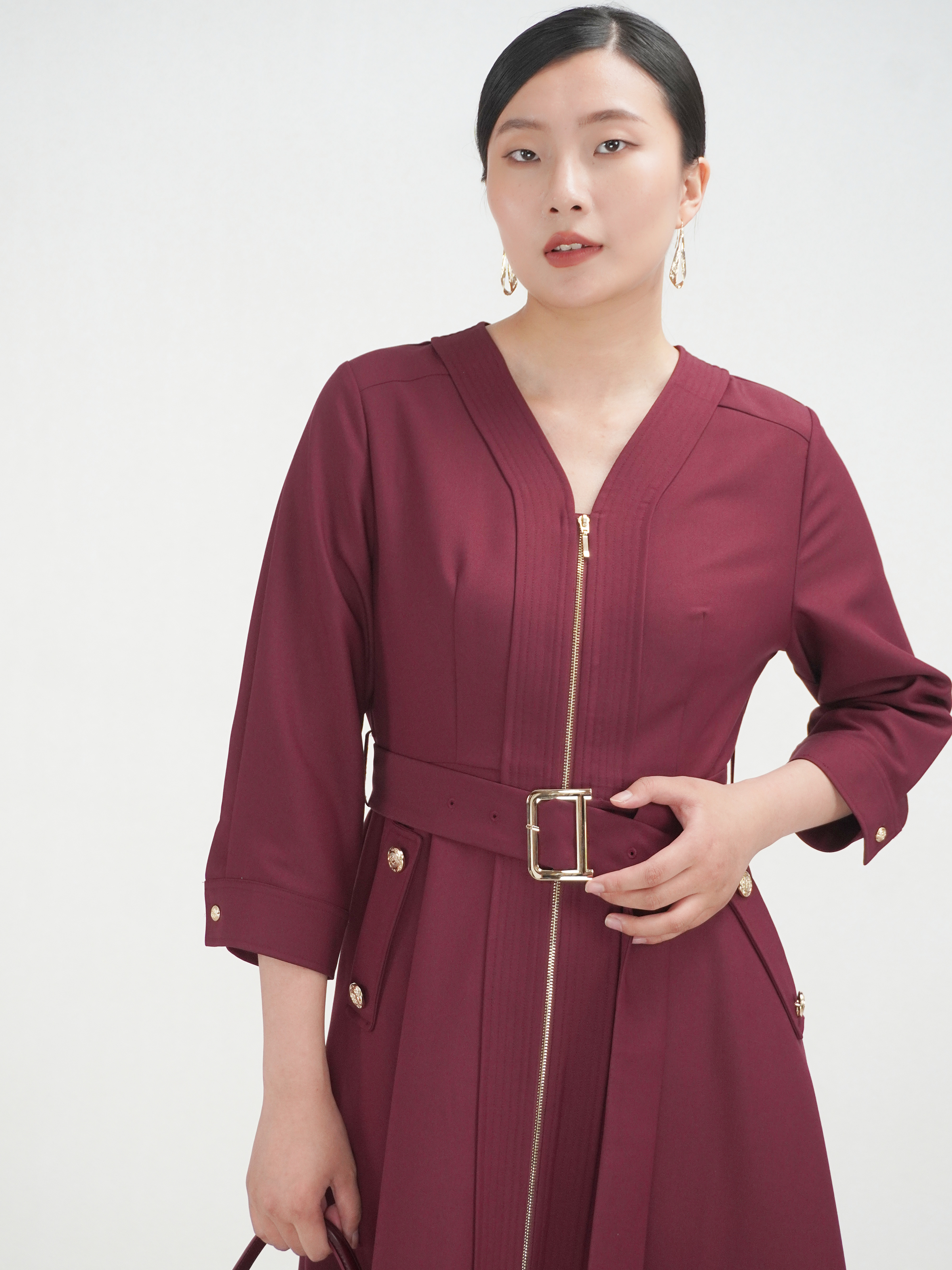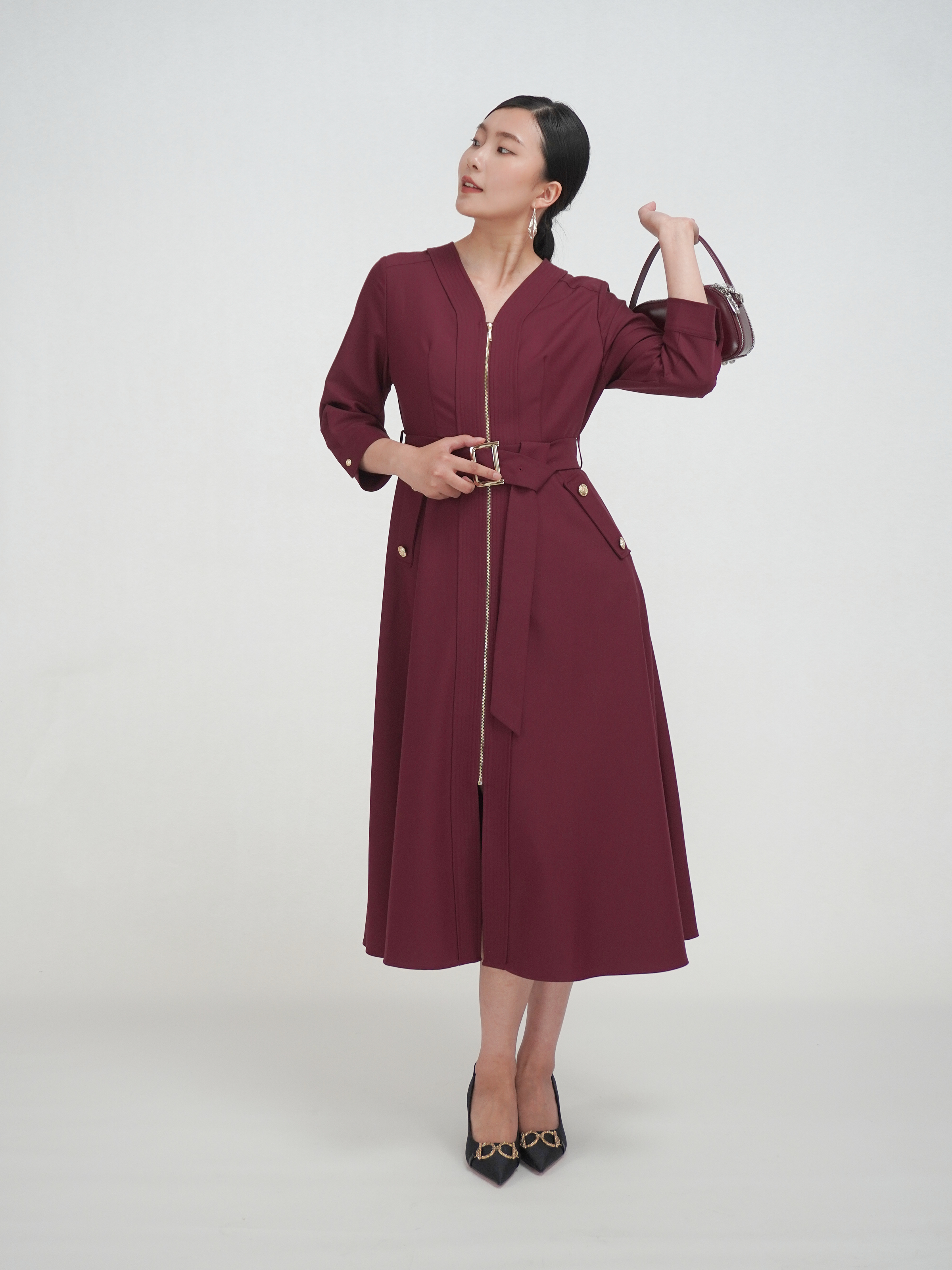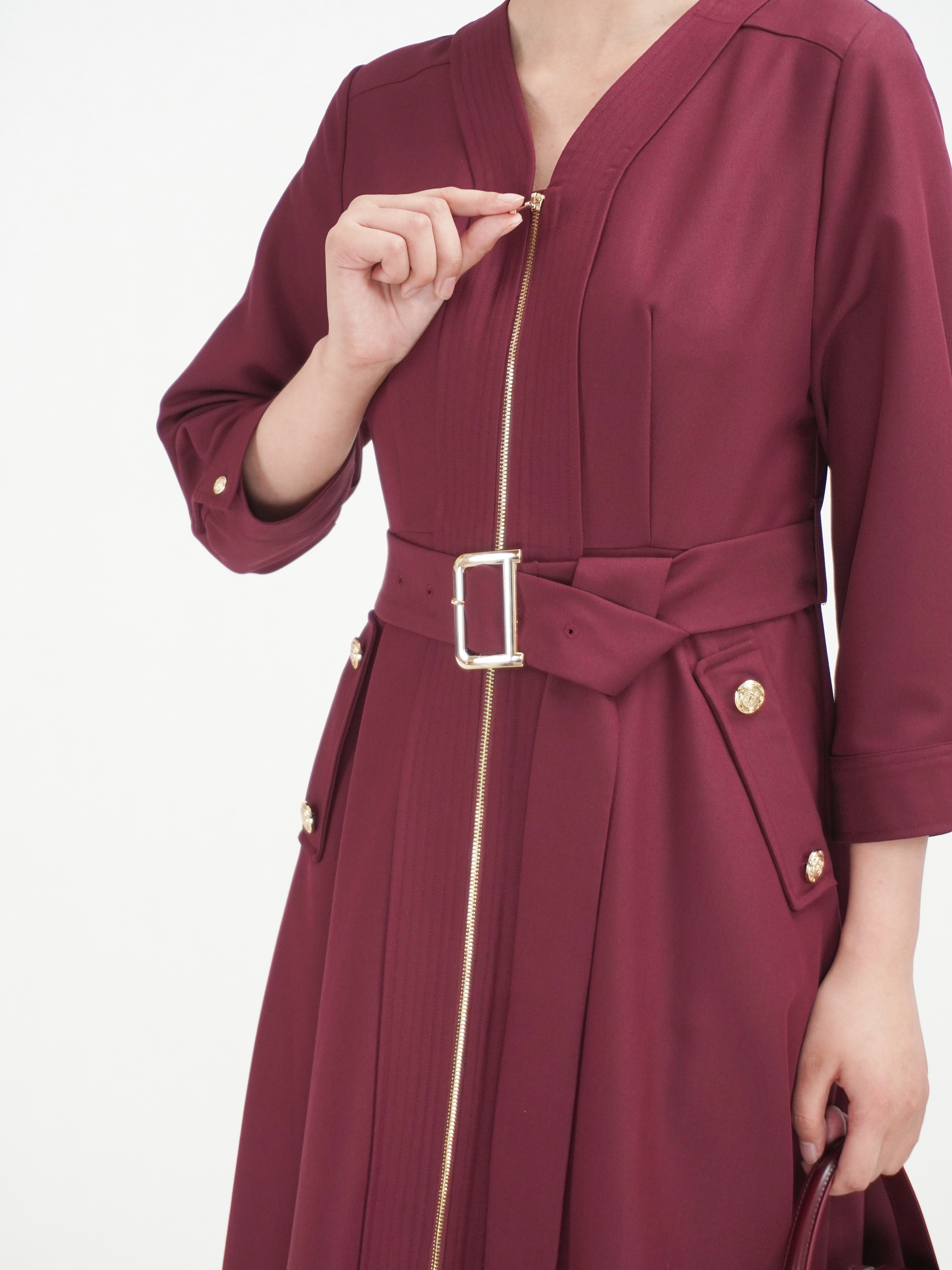 SZ3S56_魏紫色_连衣裙_秋季_V领金属拉链门襟腰带收腰七分袖_高级女装_BERNIEELEN 伯妮斯茵