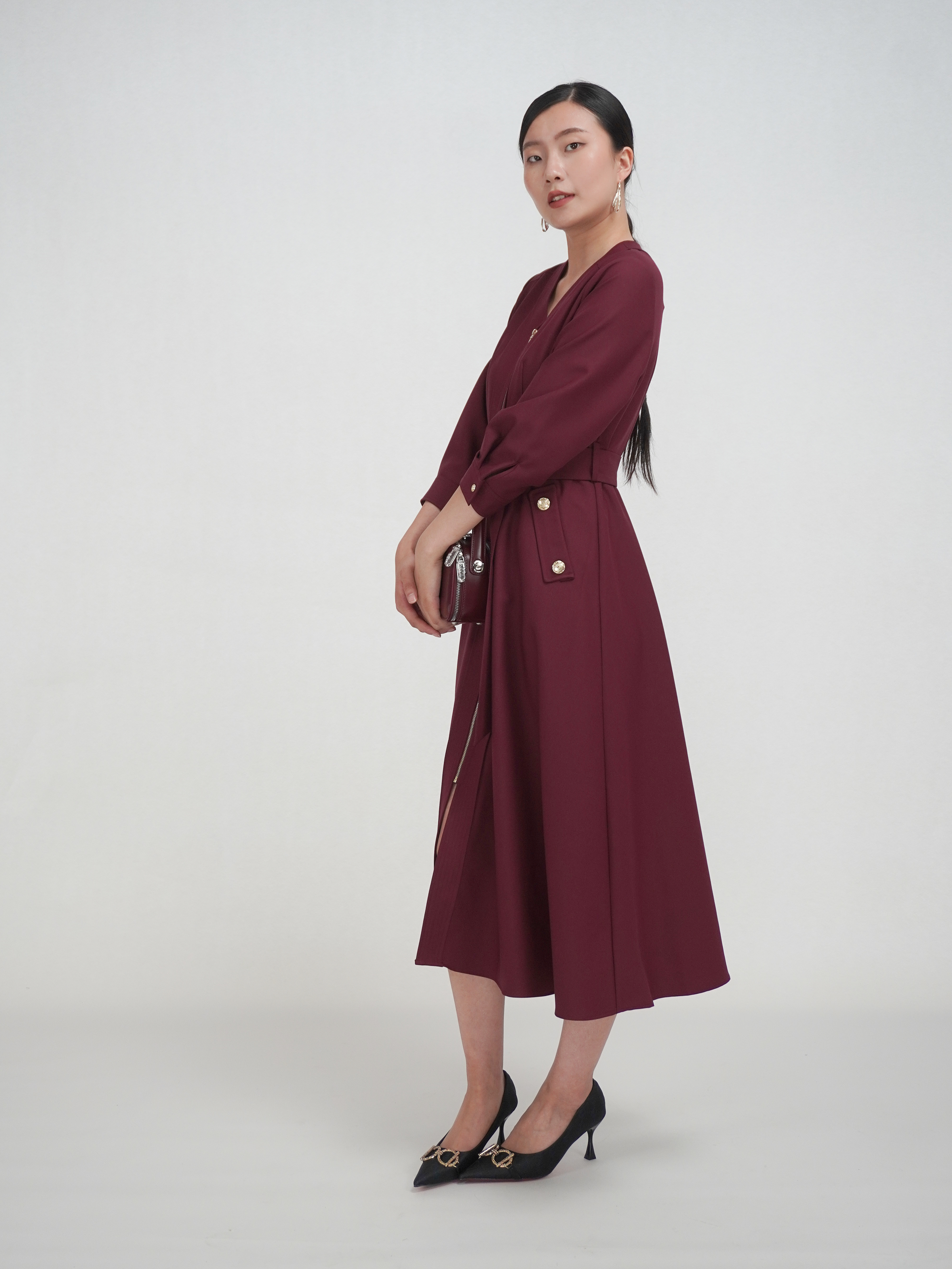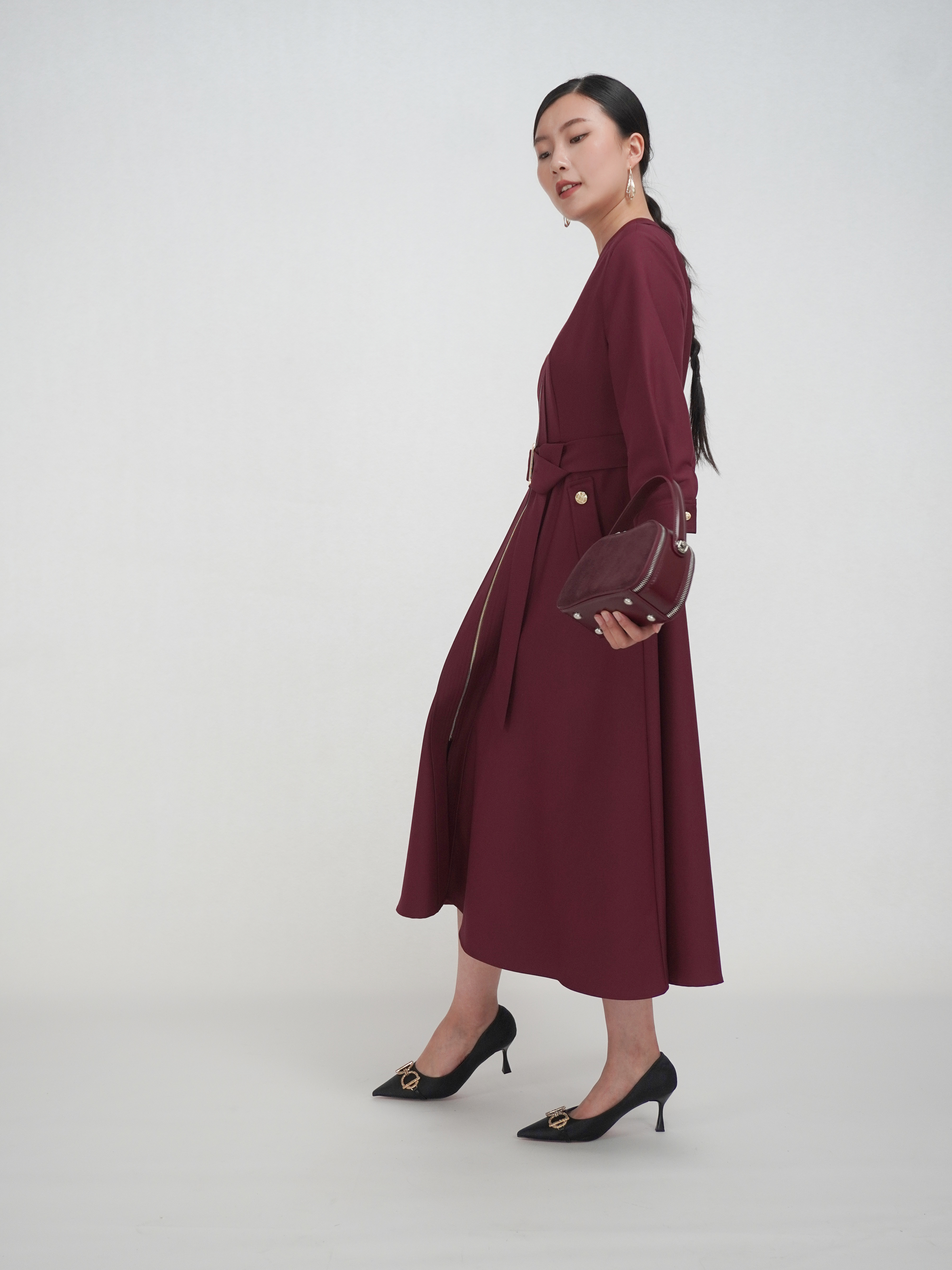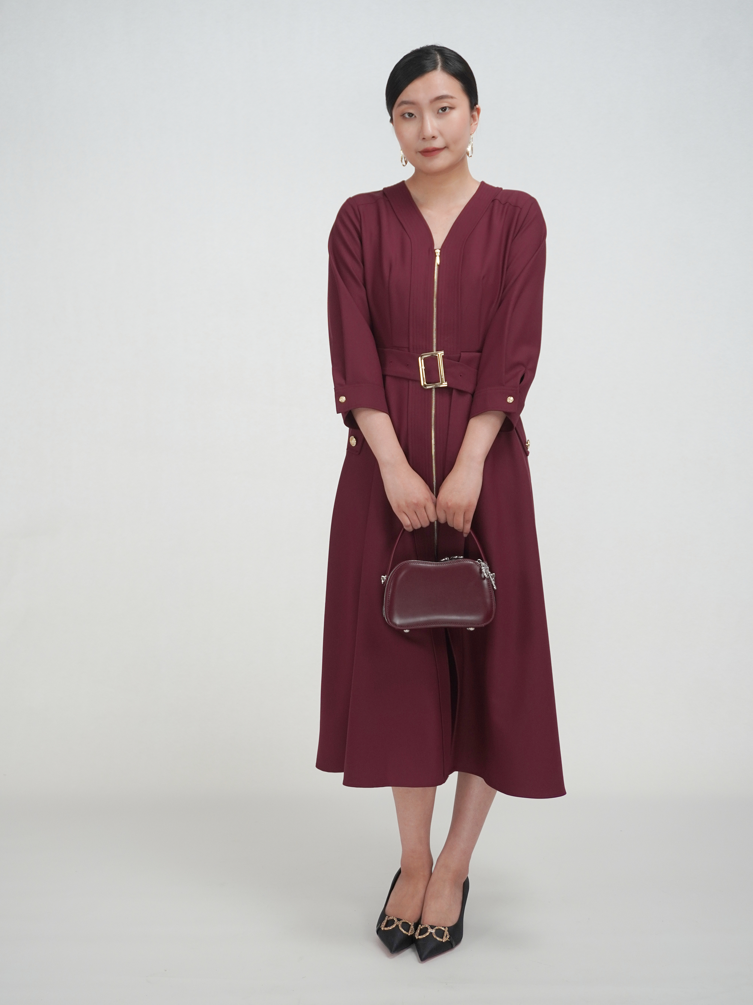 SZ3S56_魏紫色_连衣裙_秋季_V领金属拉链门襟腰带收腰七分袖_高级女装_BERNIEELEN 伯妮斯茵