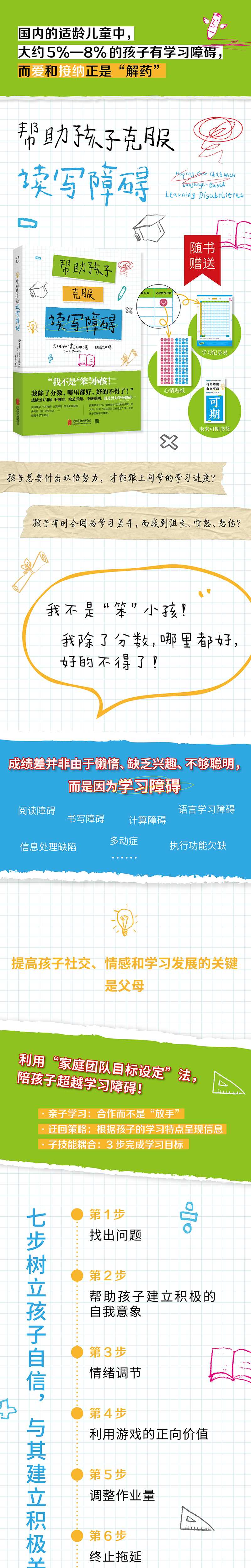 ◎教育服务公司创始人30多年教育经验总结,亚马逊评分4.7,众多教育学专家联袂推荐。◎;我不是lsquo;笨rsquo;小孩!我除了分数,哪里都好,好的不得了!◎国内的适龄儿童中,大约5%8%的孩子有学习障碍,而爱和接纳正是;解药。◎成绩差并非由于懒惰、缺乏兴趣、不够聪明,而是因为学习障碍。◎阅读障碍、书写障碍、计算障碍、语言学习障碍、信息处理障碍缺陷、多动症近10种学习障碍全面剖析,精准识别孩子学习问题的根本原因。◎日常情境 校园学习,孩子学习、生活中的高发问题全覆盖。◎提高孩子社交、情感和学习发展的关键,是父母。利用;家庭团队目标设定法,陪孩子超越学习障碍。◎随书附赠学习纪录表1张,心情贴纸1张,书签1枚。
