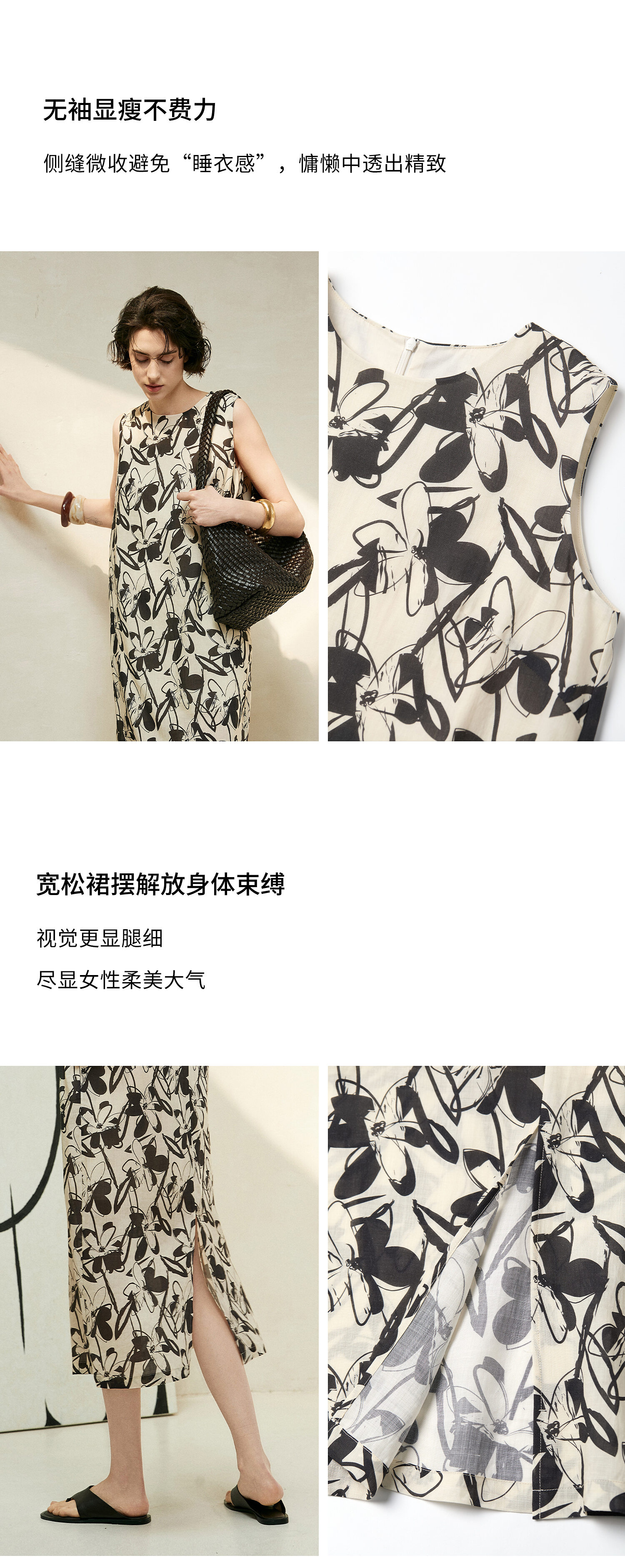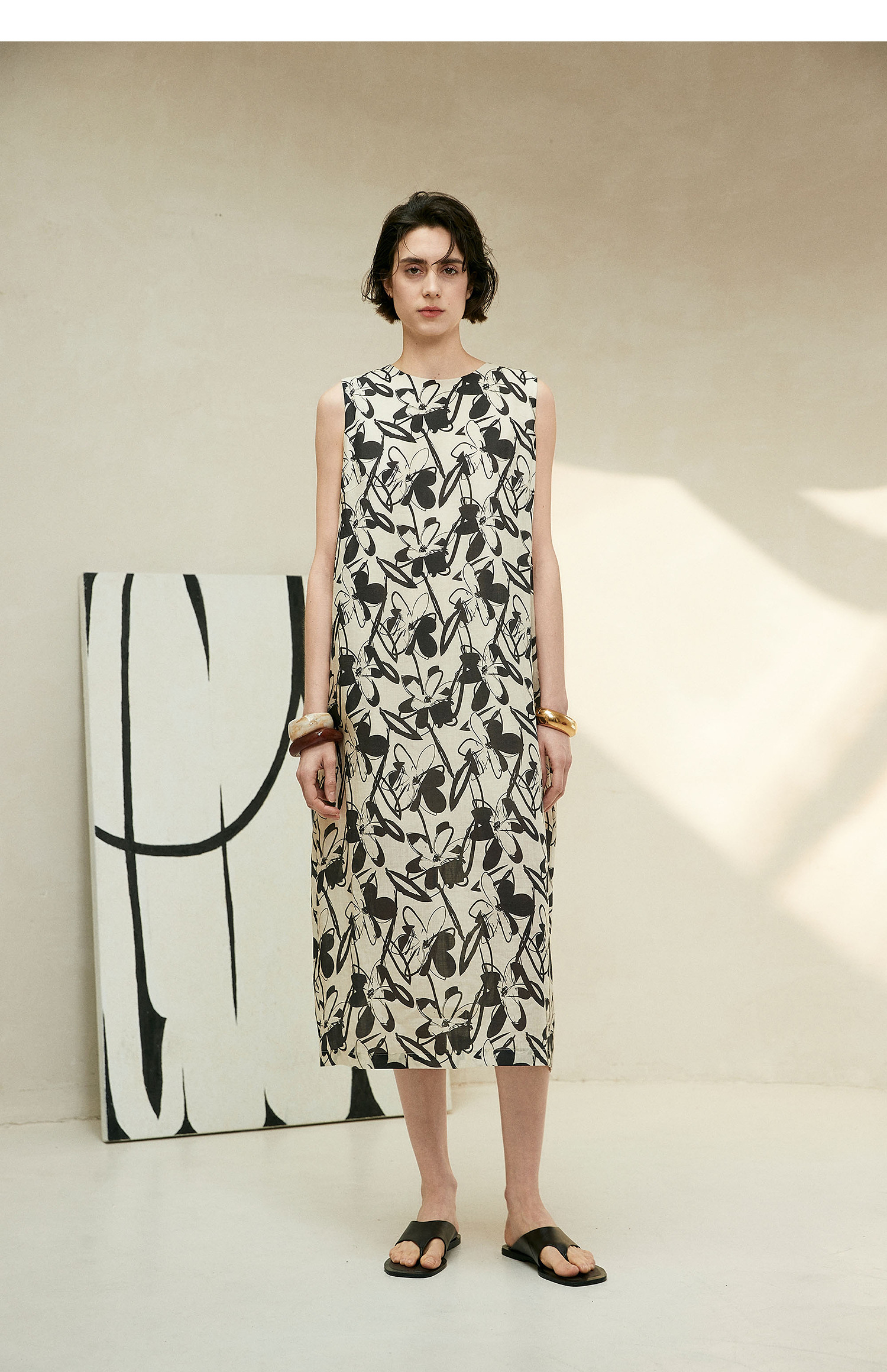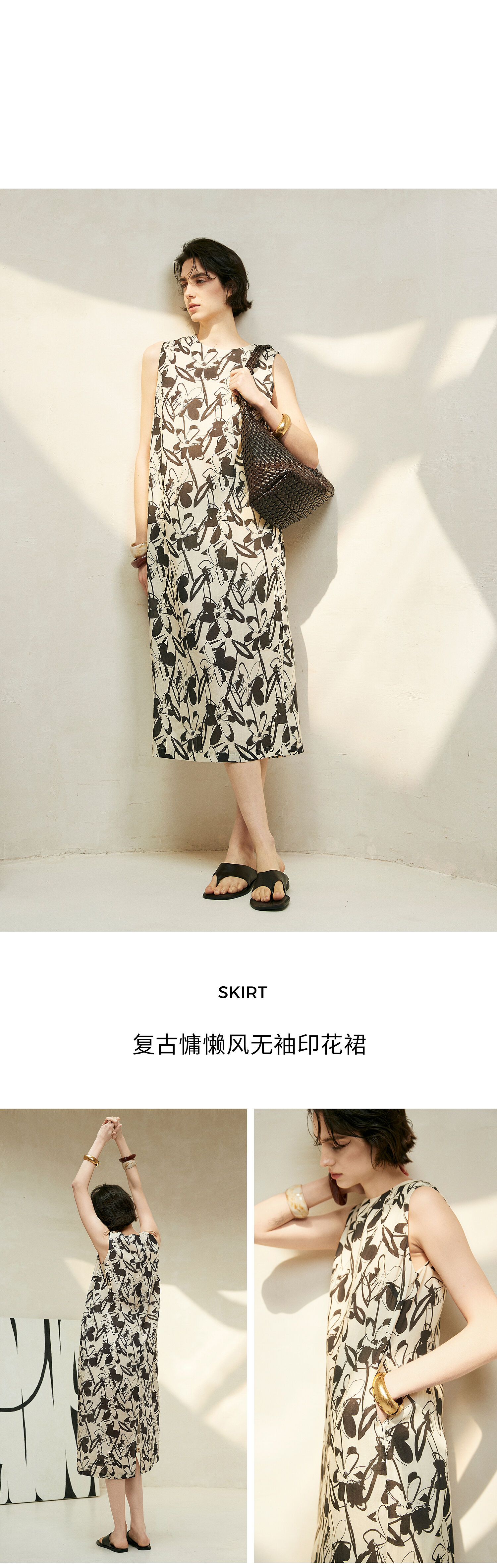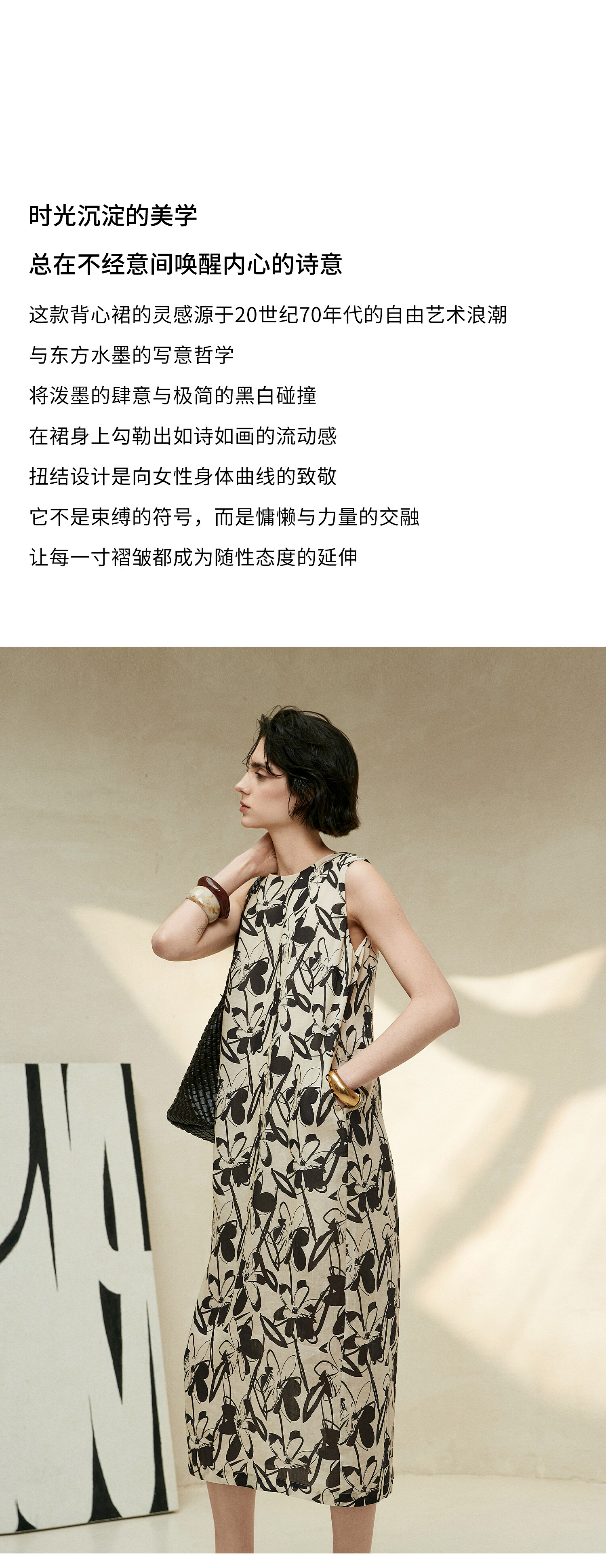 棉仓363616001-初棉复古慵懒风无袖扭结印花背心裙25春夏