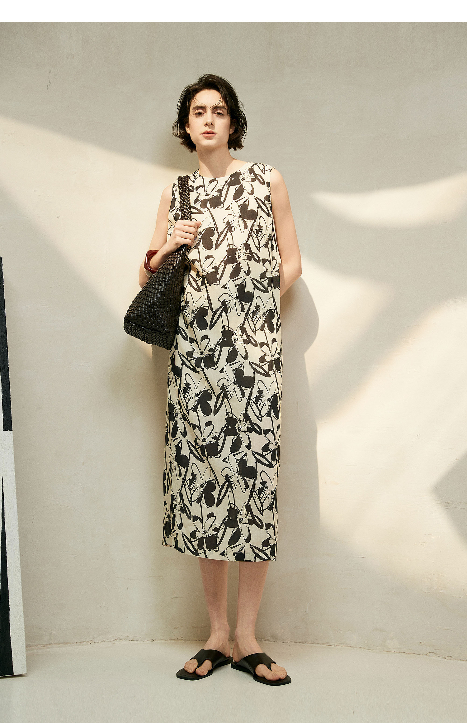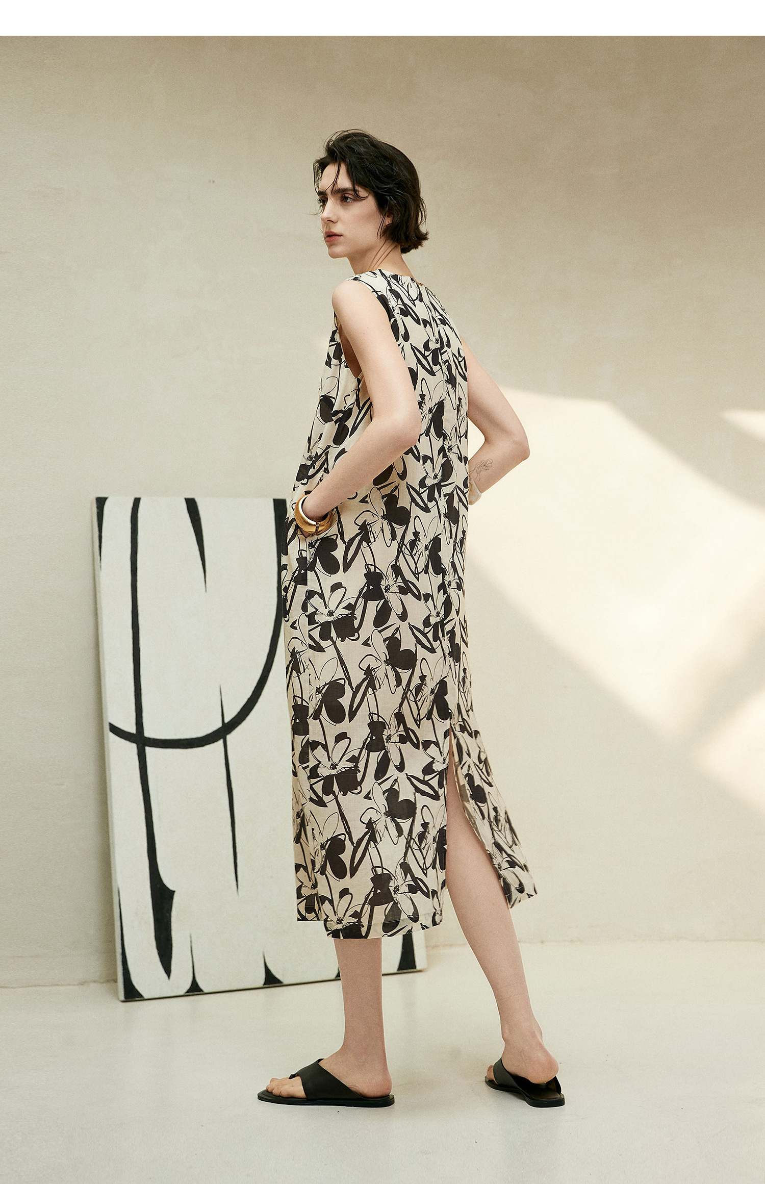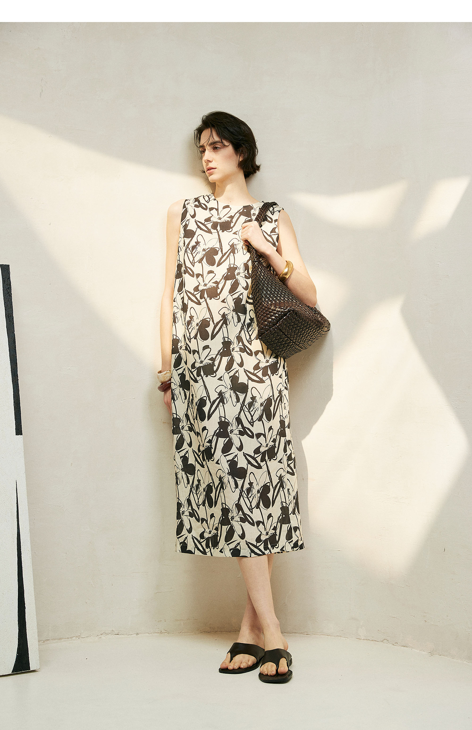 棉仓363616001-初棉复古慵懒风无袖扭结印花背心裙25春夏