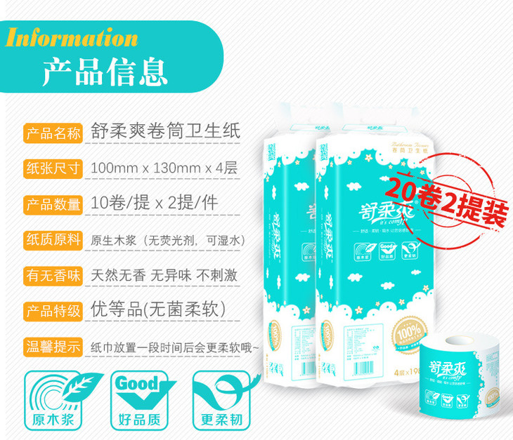【卷纸】舒柔爽卷纸2提20卷家用卷筒纸家庭厕纸拉式卫生纸木浆厕用纸