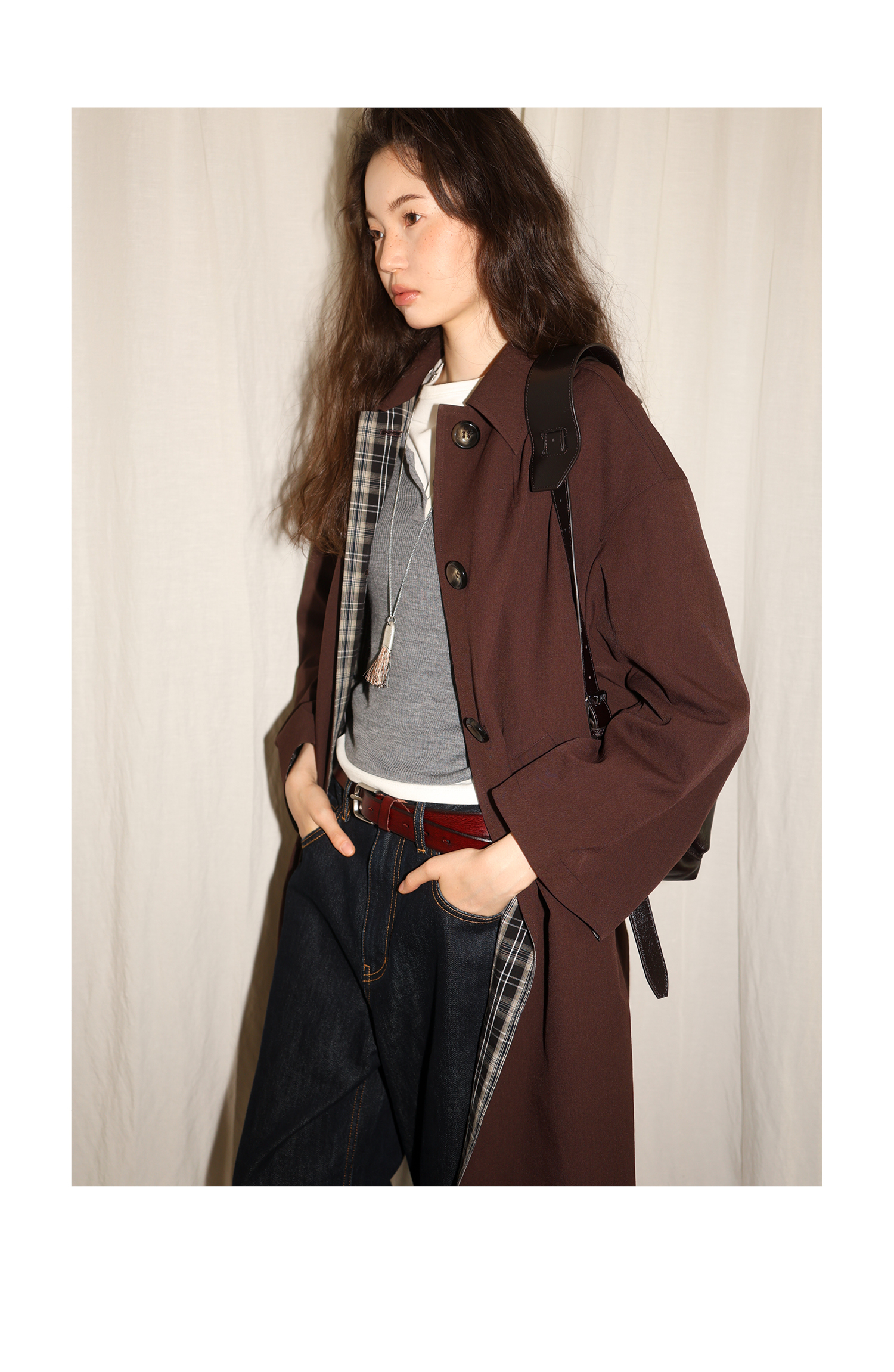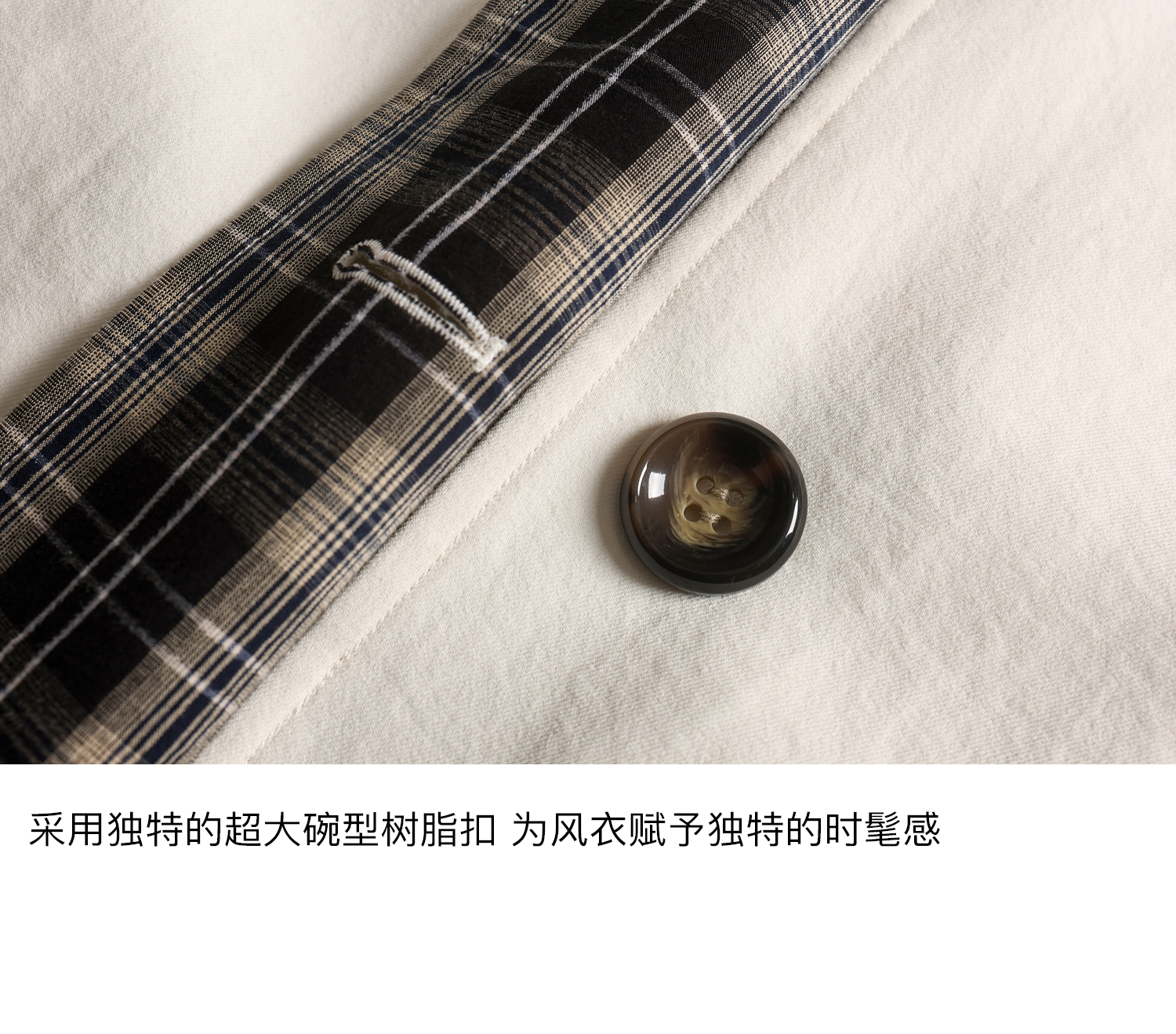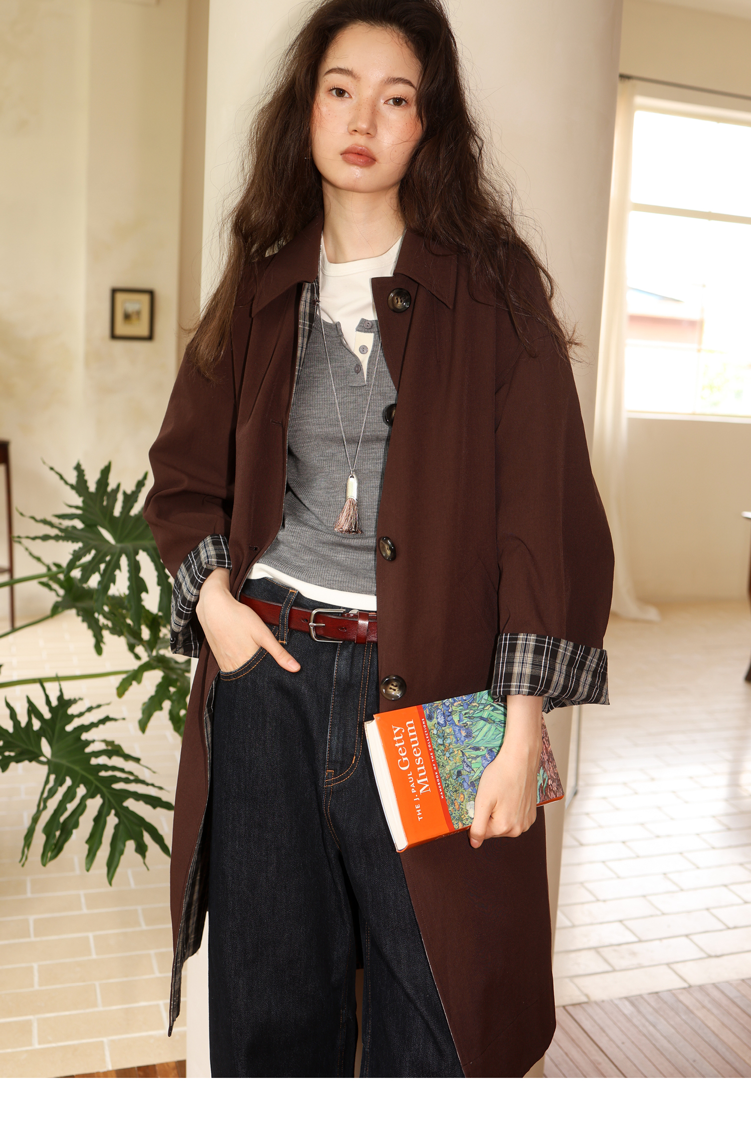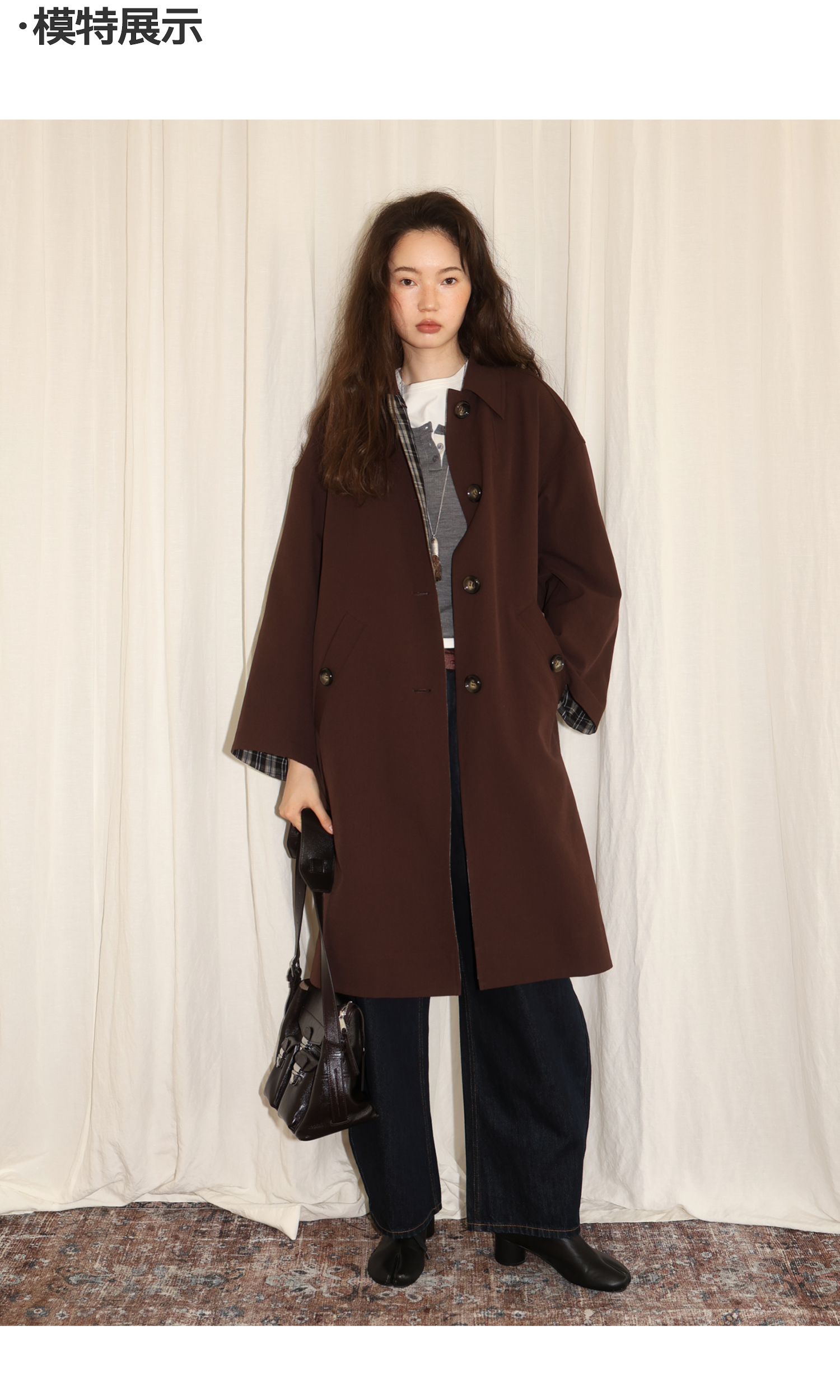 【8/6新品】素舶中空纱廓形中长款风衣 格纹翻领外套