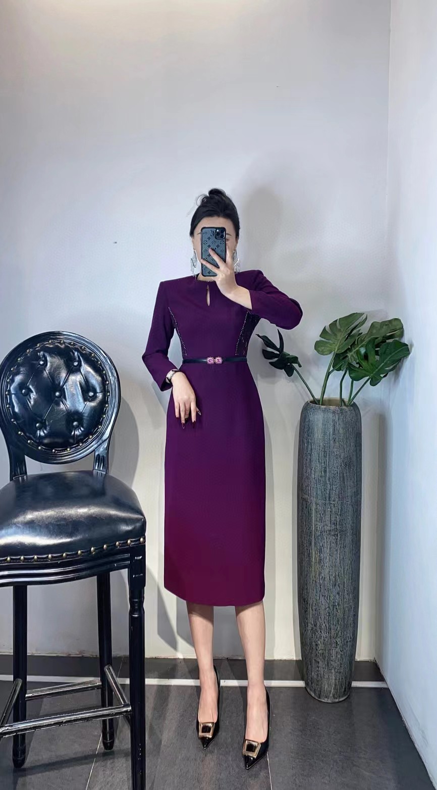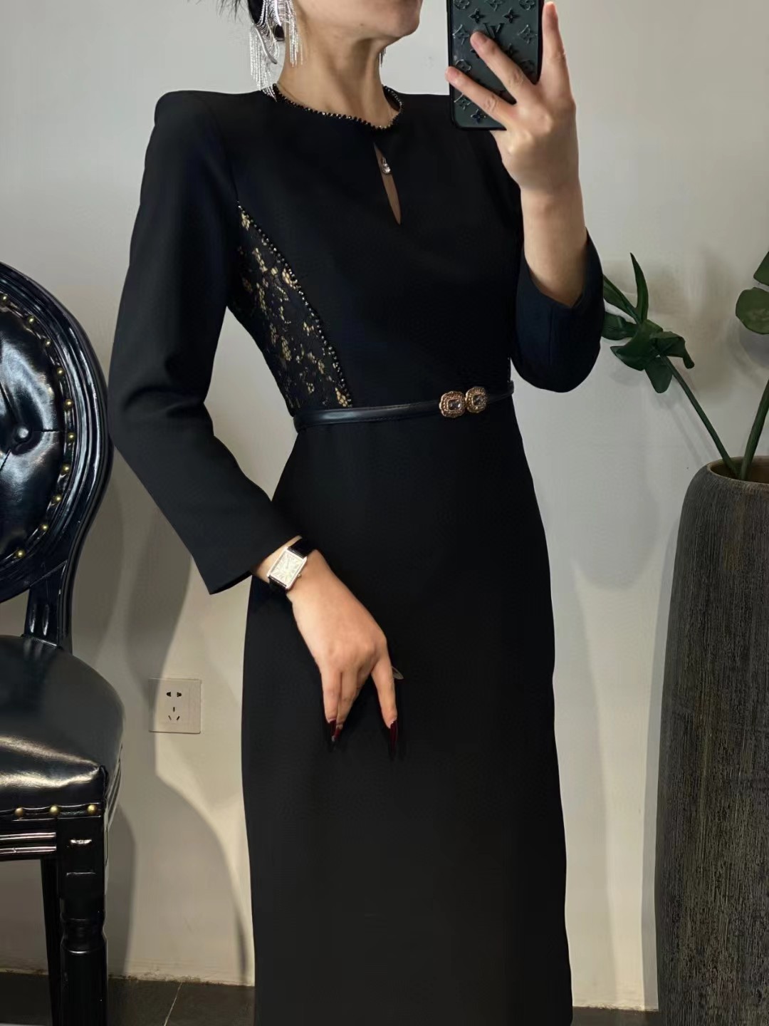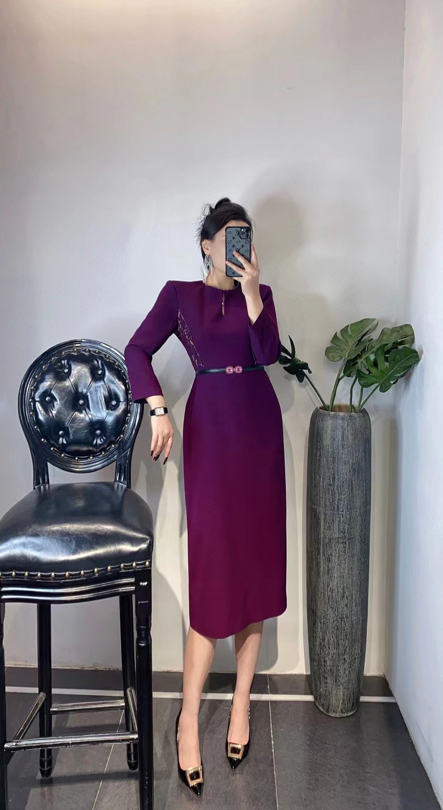 HJ1S91_齐紫色 / 漆黑色_连衣裙_春夏_轻奢圆领小镂空腰侧网纱拼接腰带显瘦通勤气质中长裙_高级女装_BERNIEELEN 伯妮斯茵