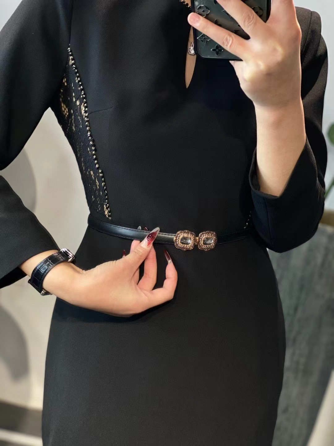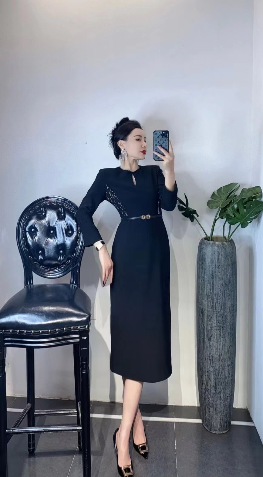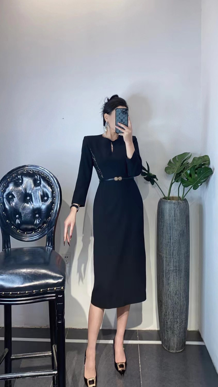 HJ1S91_齐紫色 / 漆黑色_连衣裙_春夏_轻奢圆领小镂空腰侧网纱拼接腰带显瘦通勤气质中长裙_高级女装_BERNIEELEN 伯妮斯茵