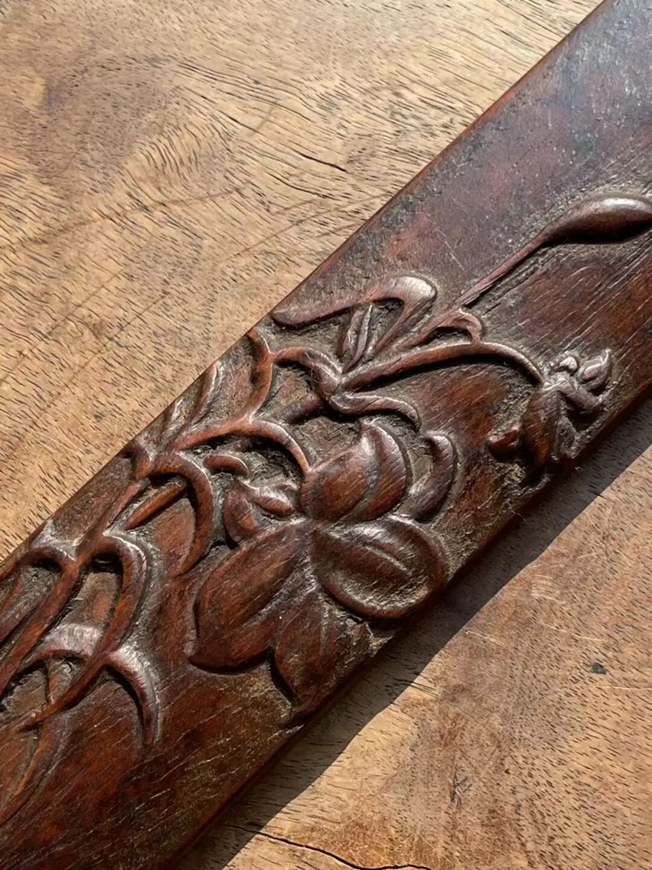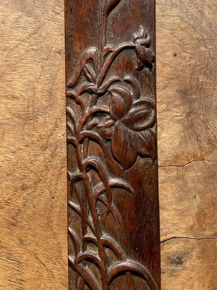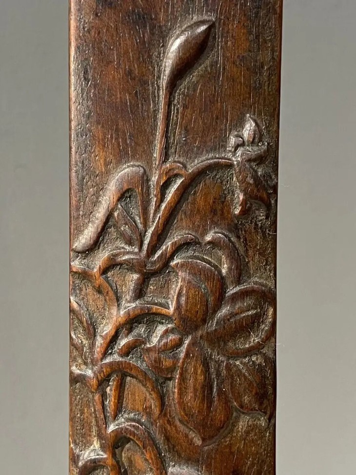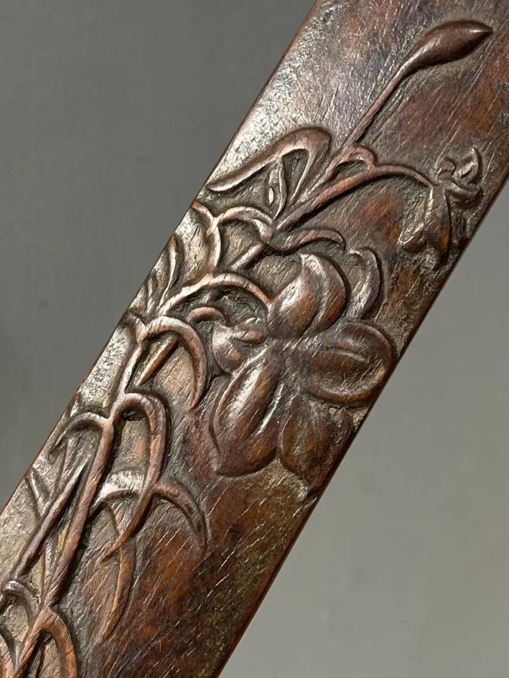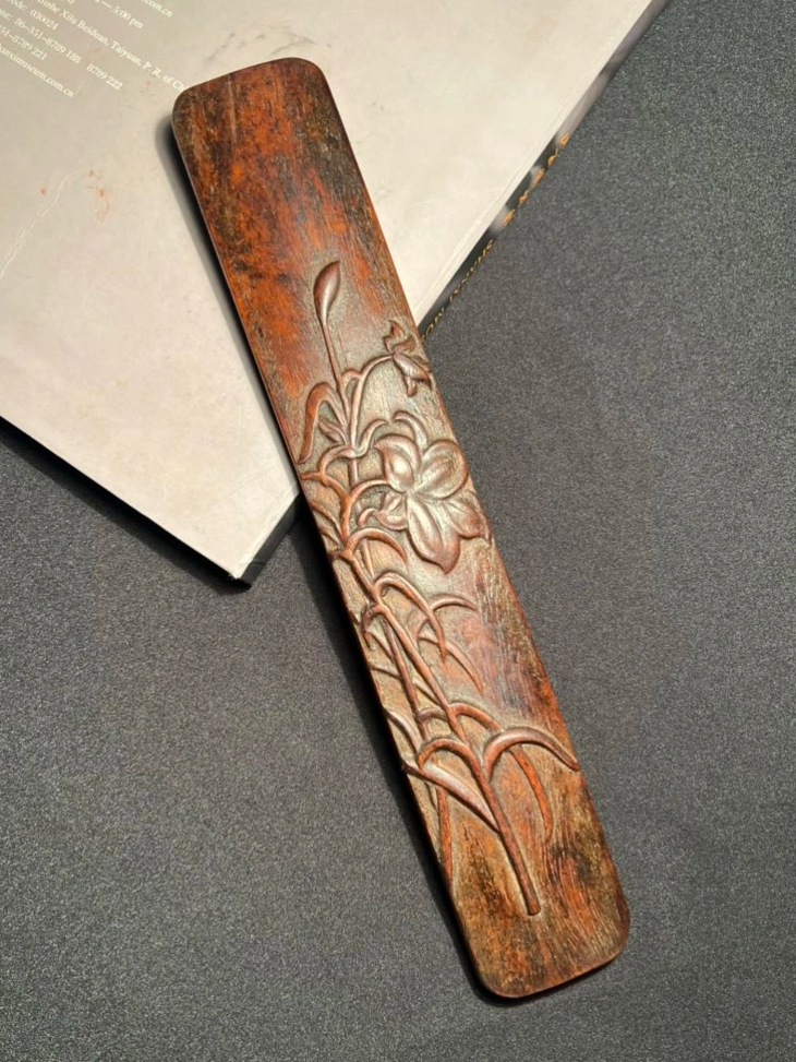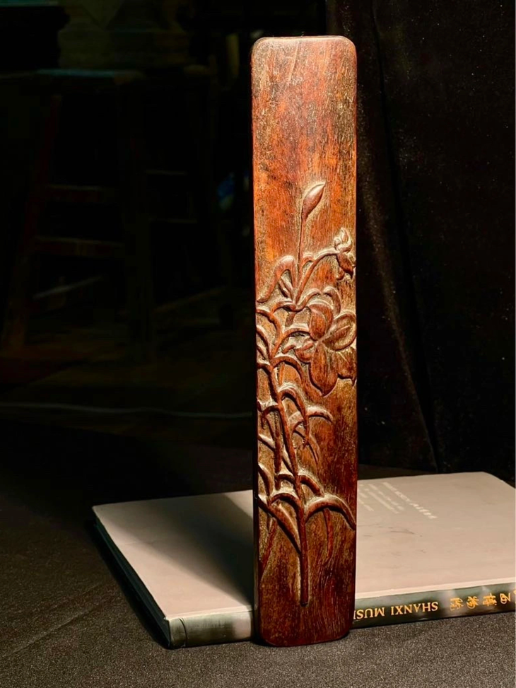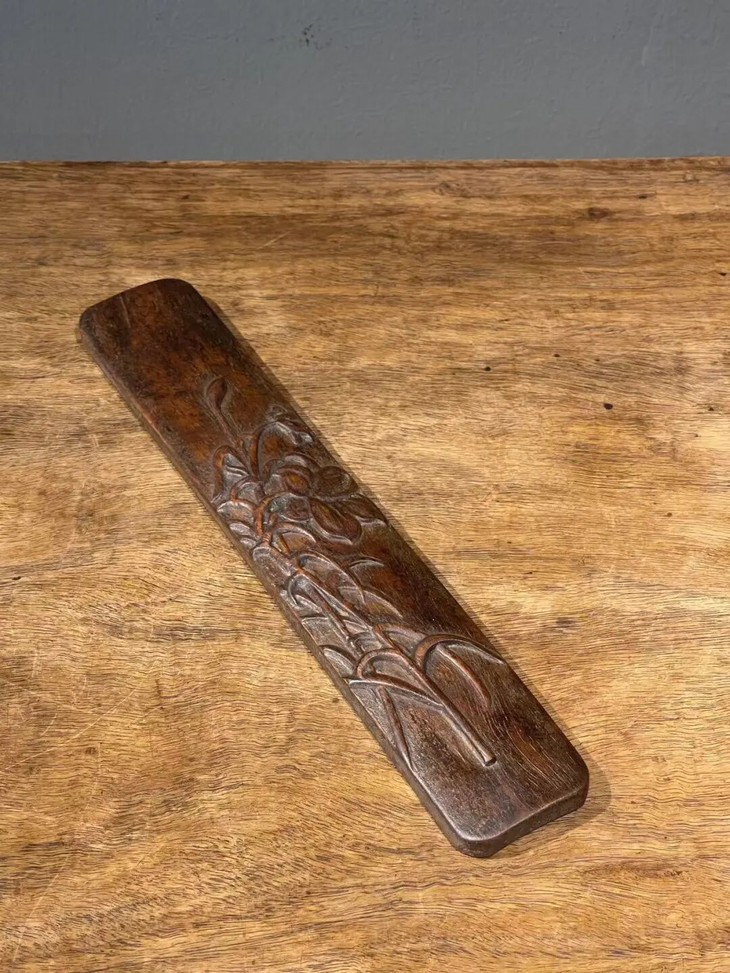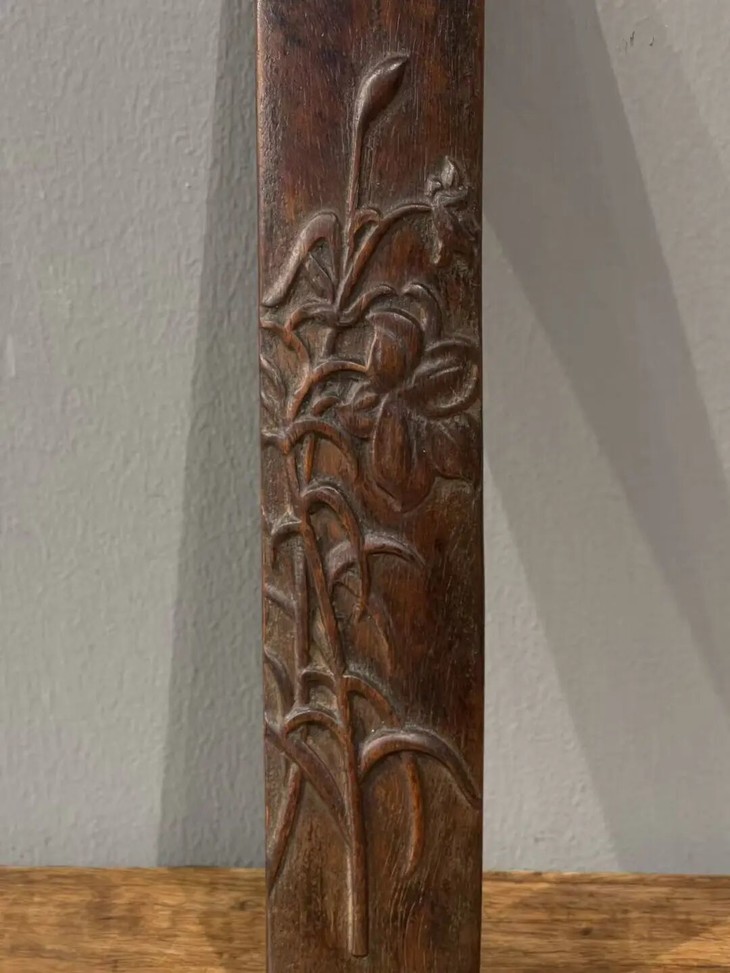 这是一件以质地坚硬、天然木纹理凊晰华丽的海南黄花梨整木琢磨而成的深浮雕花卉纹文房臂搁,以整块海南黄花梨琢墨成厚壁半圆弧,弧面减地浮雕深刻百合花卉纹,曲线弧度优美,减地浮雕构图优雅、雕琢细腻,老黄花梨木色泽柔美,天然纹理清晰华丽、质地坚硬比重高,包浆温润。是一费工费料之老文房臂搁,或可用为茶則。