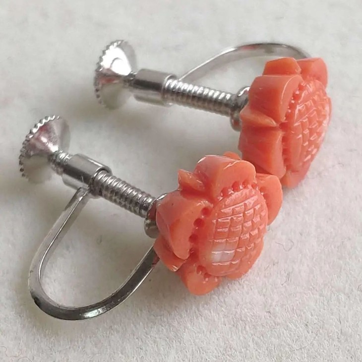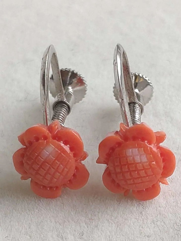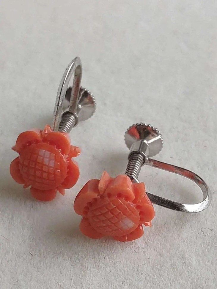 天然红珊瑚雕花银耳钉一对,日本1970年代