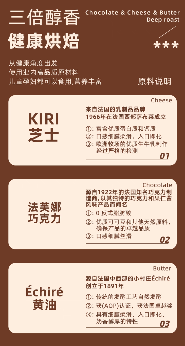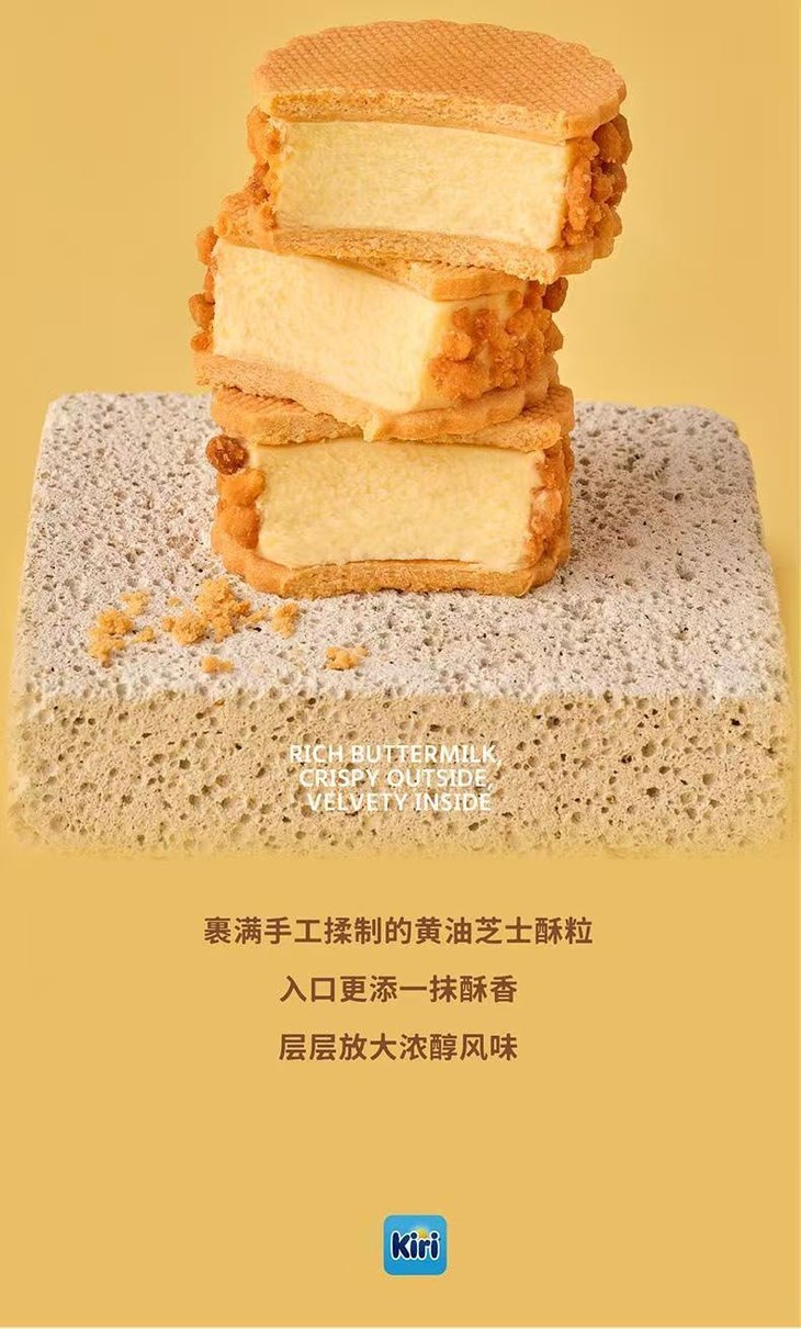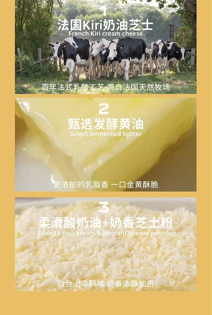 芝士白脱饼干的核心原料用的是法国Kiri奶油芝士,以百年法式乳酪工艺发酵而成,富含蛋白质与钙,口感细腻柔滑,入口即化;黄油选用法国中西部Echire村庄的百年品牌,1891年创立至今坚持传统发酵工艺,不仅斩获AOP认证与法国卓越奖,更有着奶香醇厚、细腻绵软的特质,为饼干注入浓郁乳脂香;巧克力味还特别添加法国法芙娜巧克力,作为1922年创立的知名品牌,它严选优质可可豆与天然原料制作,0反式脂肪酸,口感丝滑醇厚,与芝士、黄油风味完美融合;再搭配柔滑酸奶油与奶香芝士粉,多重乳脂风味层层叠加,让每一口都浓醇加倍,且全程不加一滴水,纯粹还原食材本身的本真味道。