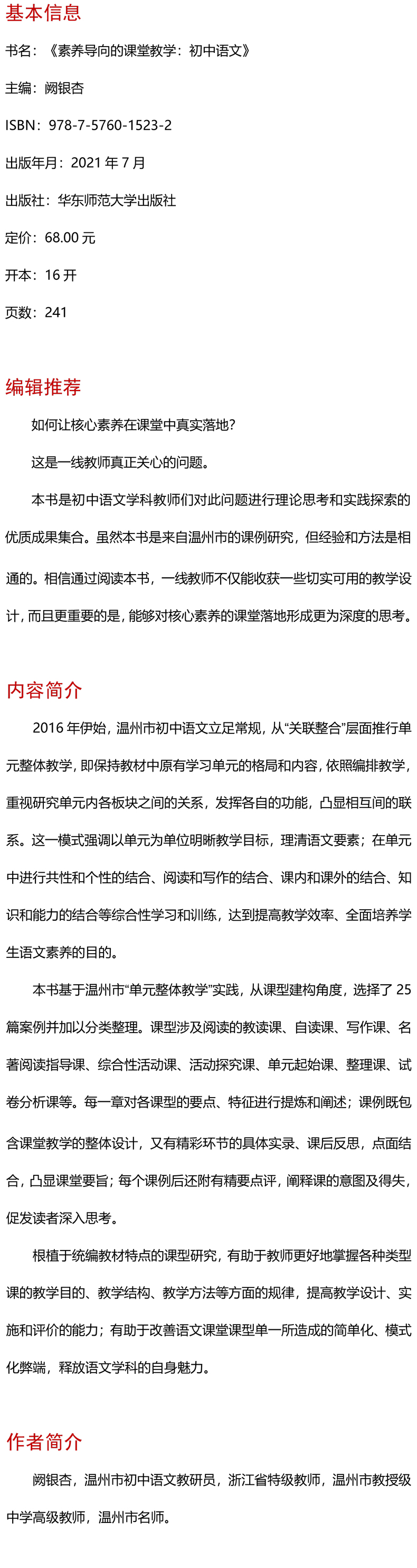 素养导向的课堂教学 初中语文 核心素养导向下的课堂教学丛书 中学语文课教学研究 名著阅读 写作教学