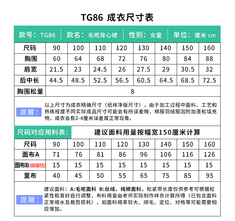 裁缝学苑TG86 毛呢背心裙纸样儿童服装女童样衣服童装打版裁剪图