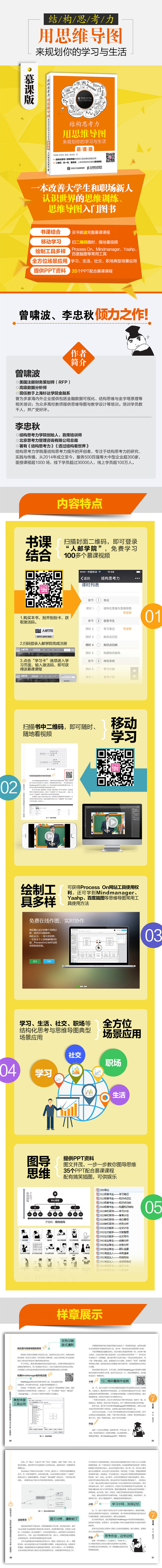 《结构思考力 用思维导图来规划你的学习与生活 慕课版》以培养学生掌握使用结构化的思考方法来分析与解决问题为主要目的,介绍了包括思维导图在内的一系列帮助自身进行结构思考的工具与模型。 《结构思考力 用思维导图来规划你的学习与生活 慕课版》突出应用,分为学习篇、生活篇、社交篇与职场篇共四篇十一章内容。每一章节所讨论的问题均为大学生在求学期间接触到的各类典型案例。读者通过在不同场景案例下使用结构思维来分析和解决问题,可以全面掌握结构思维在不同层面、不同场合下的应用。 《结构思考力 用思维导图来规划你的学习与生活 慕课版》内容全面,语言轻松,不仅适合各个专业的高等院校师生学习结构化思维,也可以为那些希望提高自身结构思维能力的相关人员提供参考。