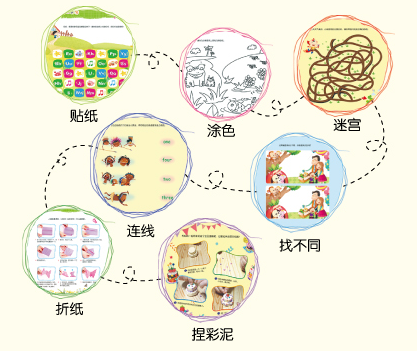每首歌之后都有一个和主题相关的游戏:贴纸、涂色、迷宫、连线、找不同等等都是孩子的大爱!爸爸妈妈和孩子一起玩,让亲子时光更加丰富多彩!