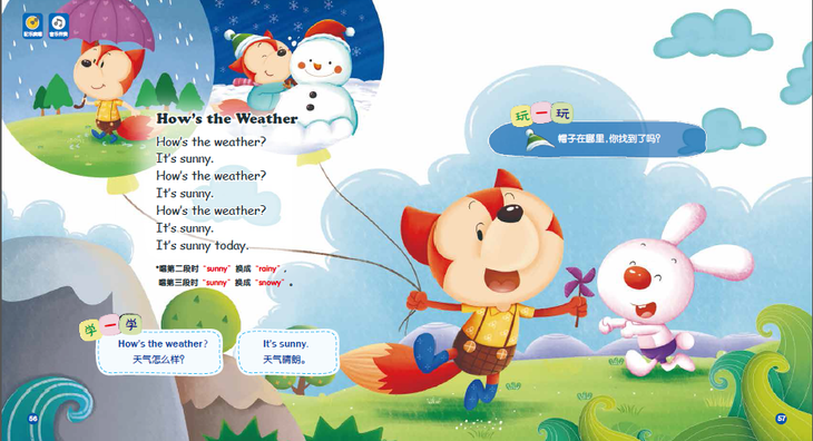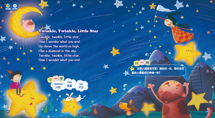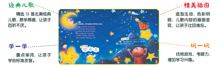 每首儿歌两个对页,第一个对页用精美的插图呈现儿歌内容,设置了好玩的找物游戏,并提炼出2-10个常用单词。
