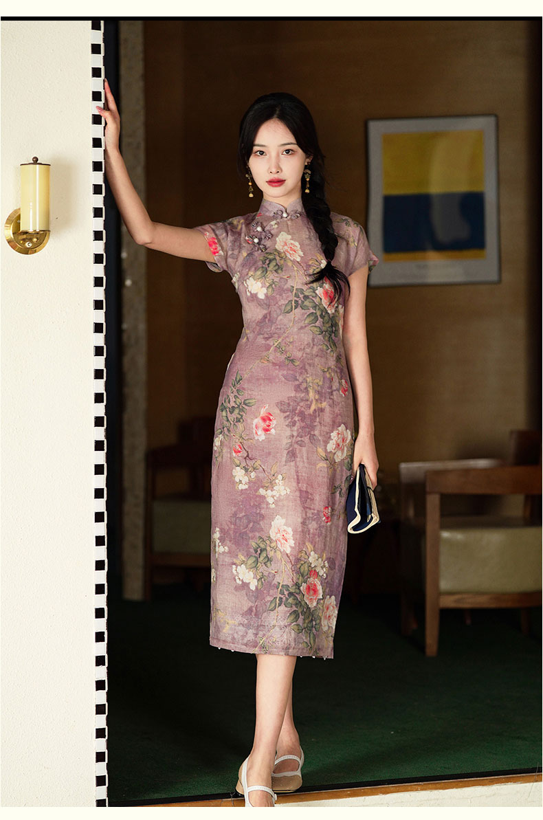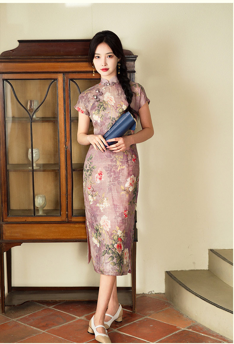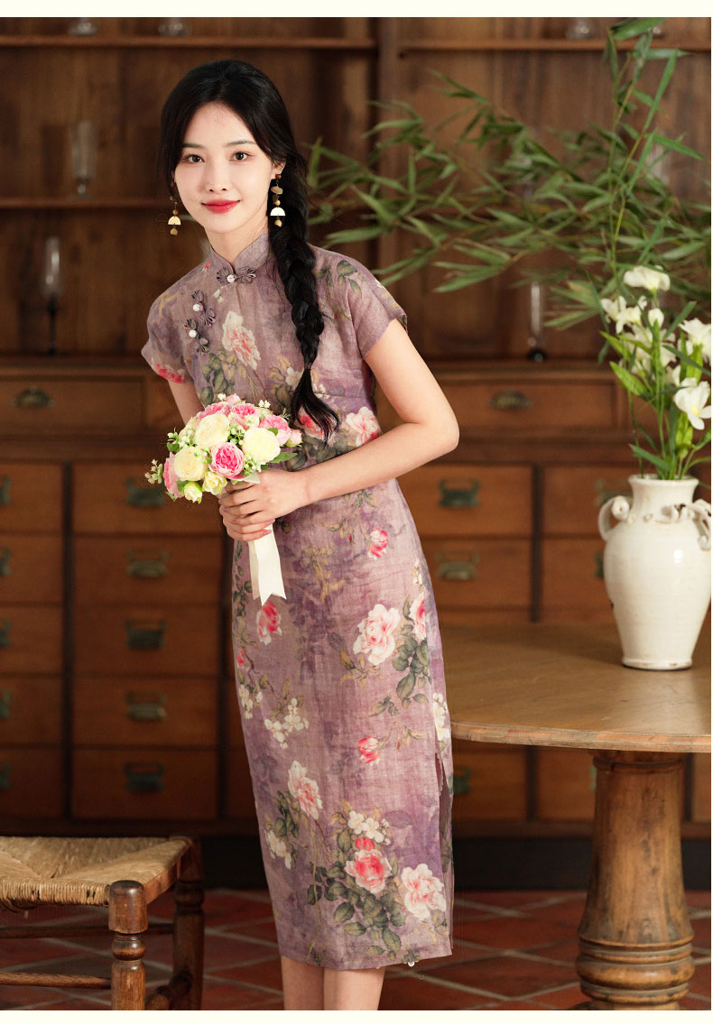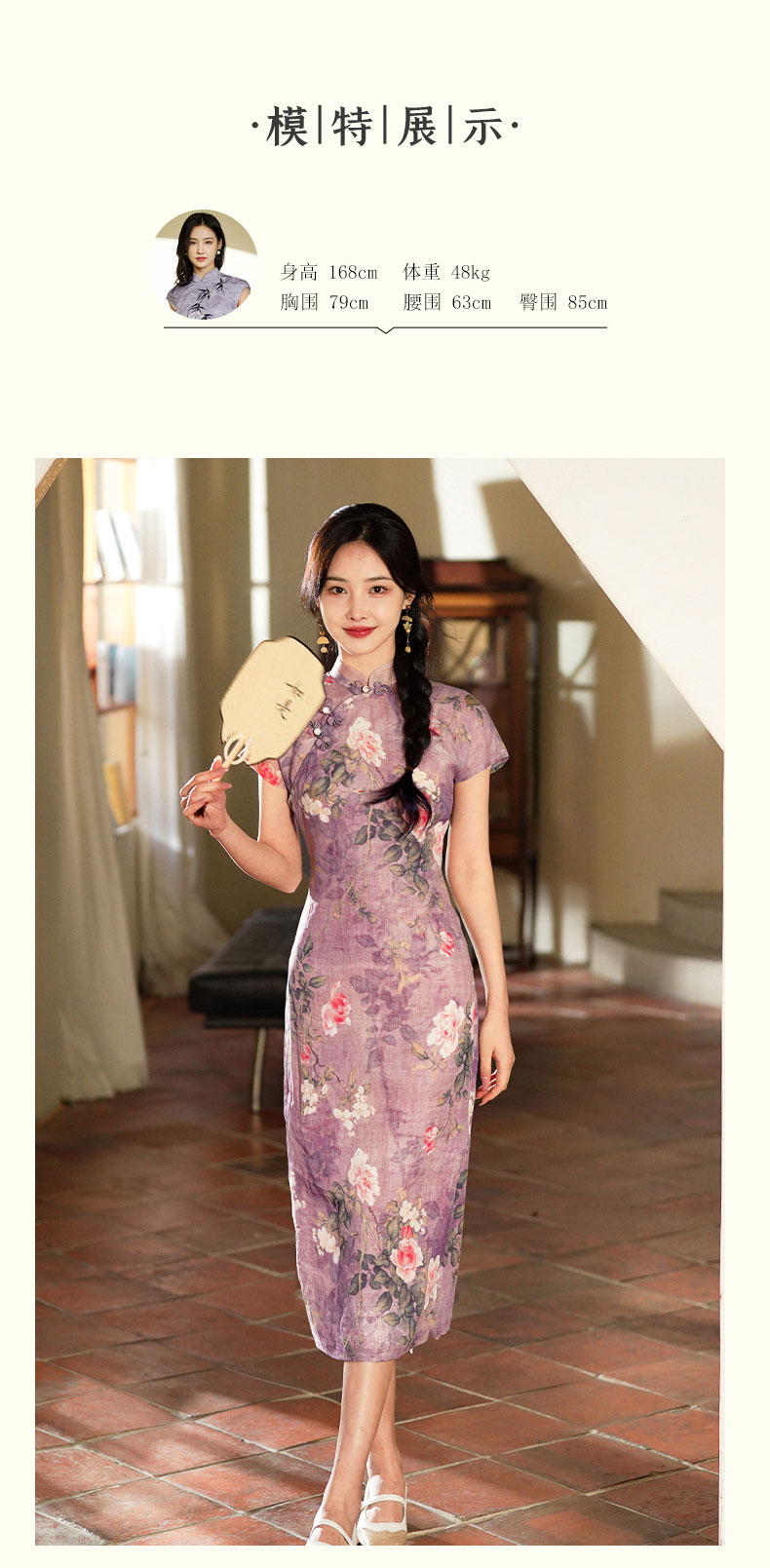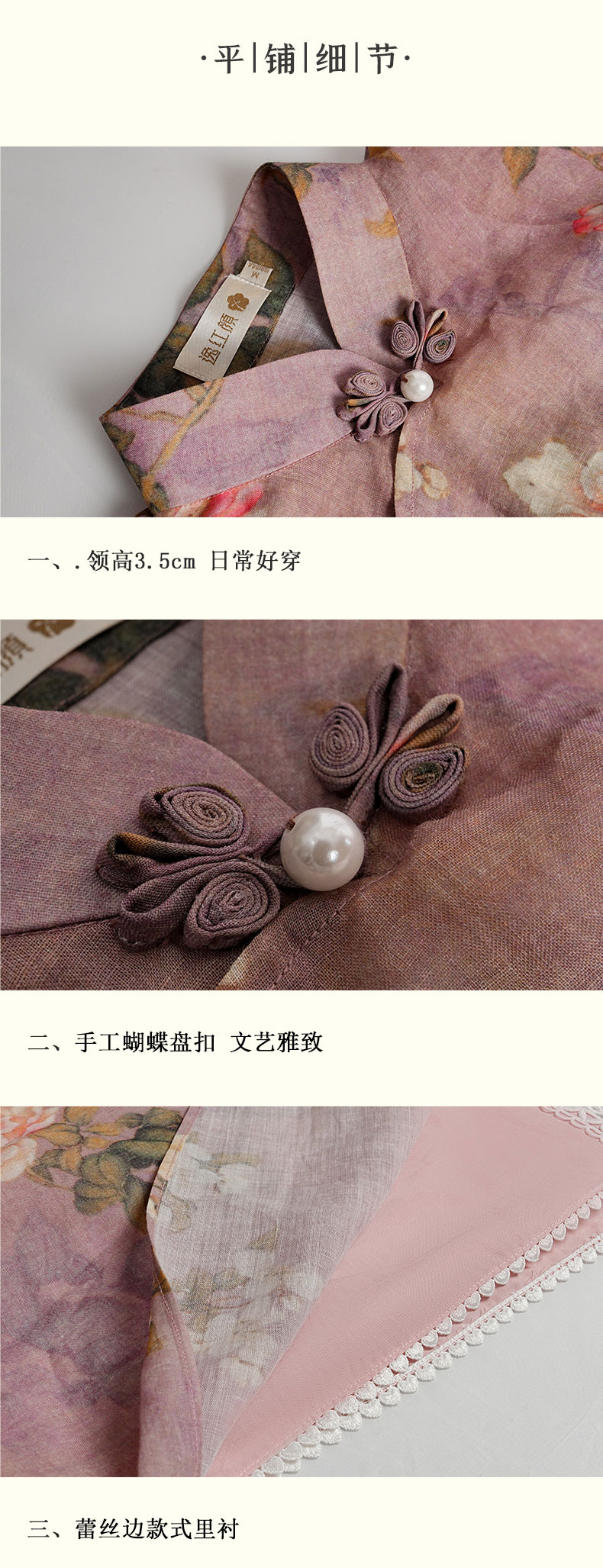 上海逸红颜徽鸣2025年夏季新款苎麻牡丹印花两件套改良旗袍连衣裙