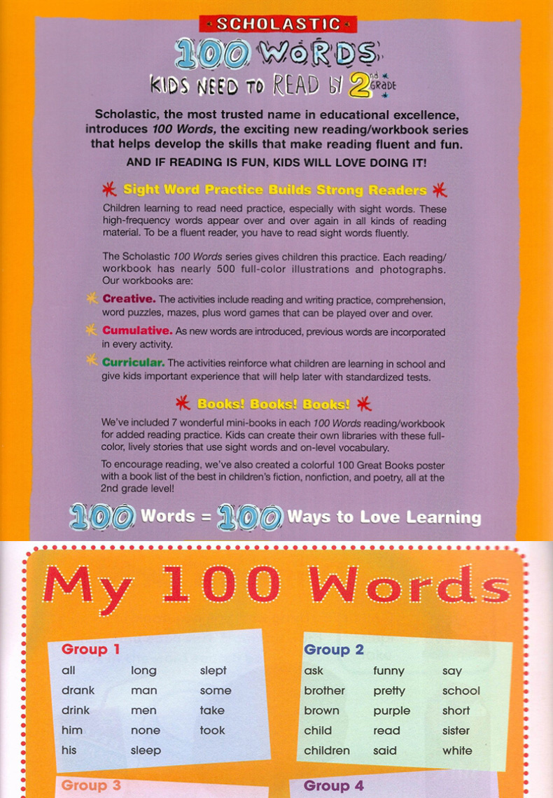 The Scholastic100 Words series gives children thispractice. Each reading/workbook has nearly 500 full-color illustrations and photographs. Our workbooks are: