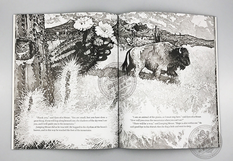 铅笔一直是个传统的绘画工具,The Story of Jumping Mouse《跳跳鼠的故事》以铅笔表现出广阔的视野,仔细地运用它表达出立体的信息,加上简单易懂的文字,讲述了魔法青蛙给小老鼠勇气,让他在旅途上克服困难,帮助朋友,实现梦想的故事。本书深受小读者们的喜爱。