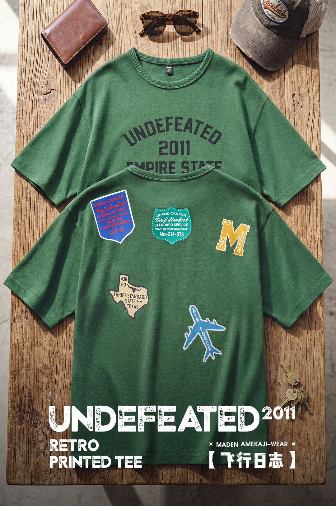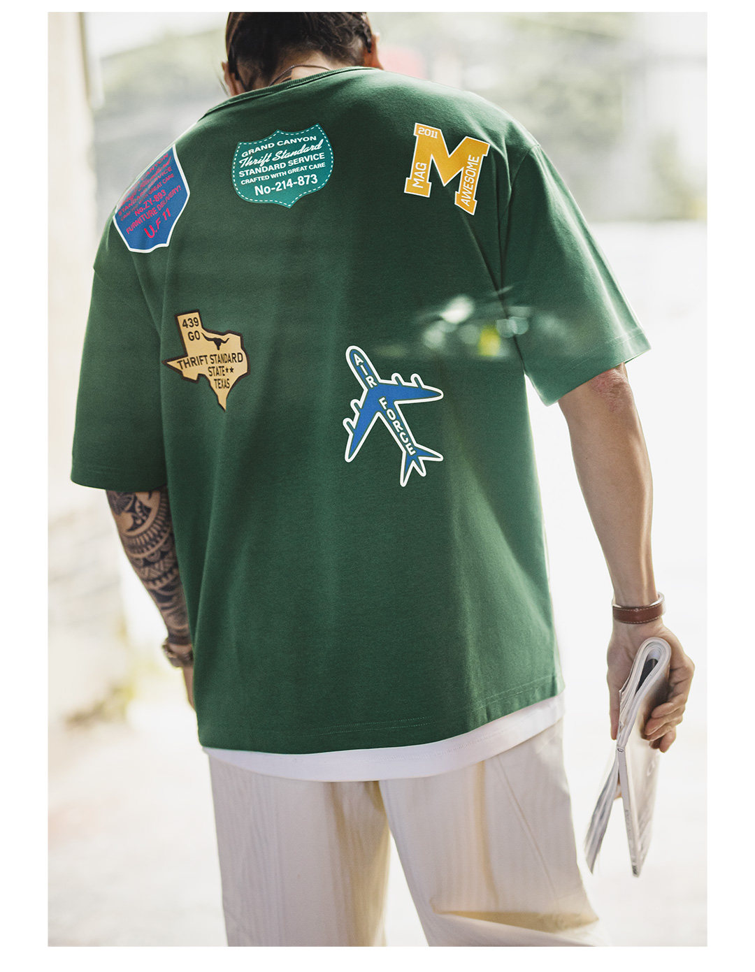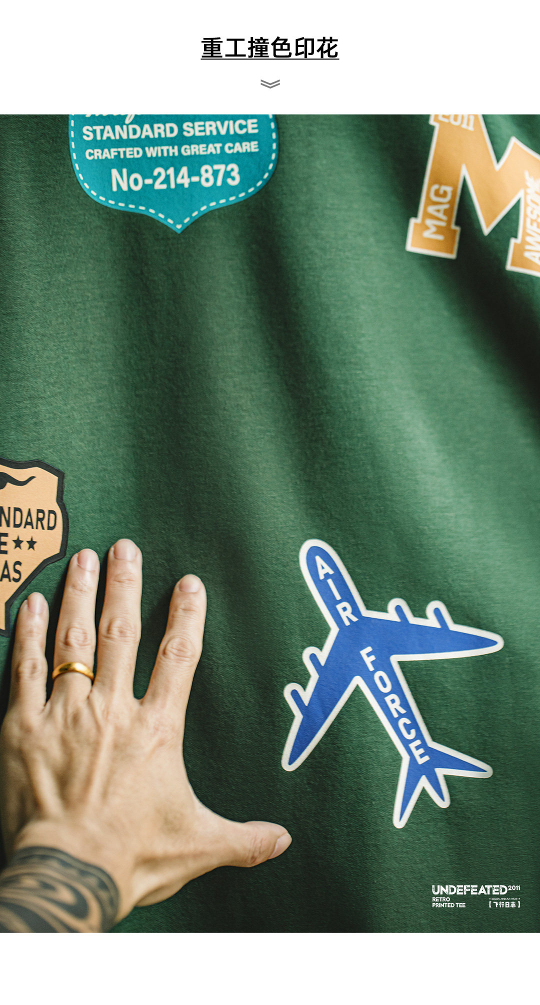 马登工装美式章仔印花T恤绿色小众圆领正肩设计感短袖上衣男款夏