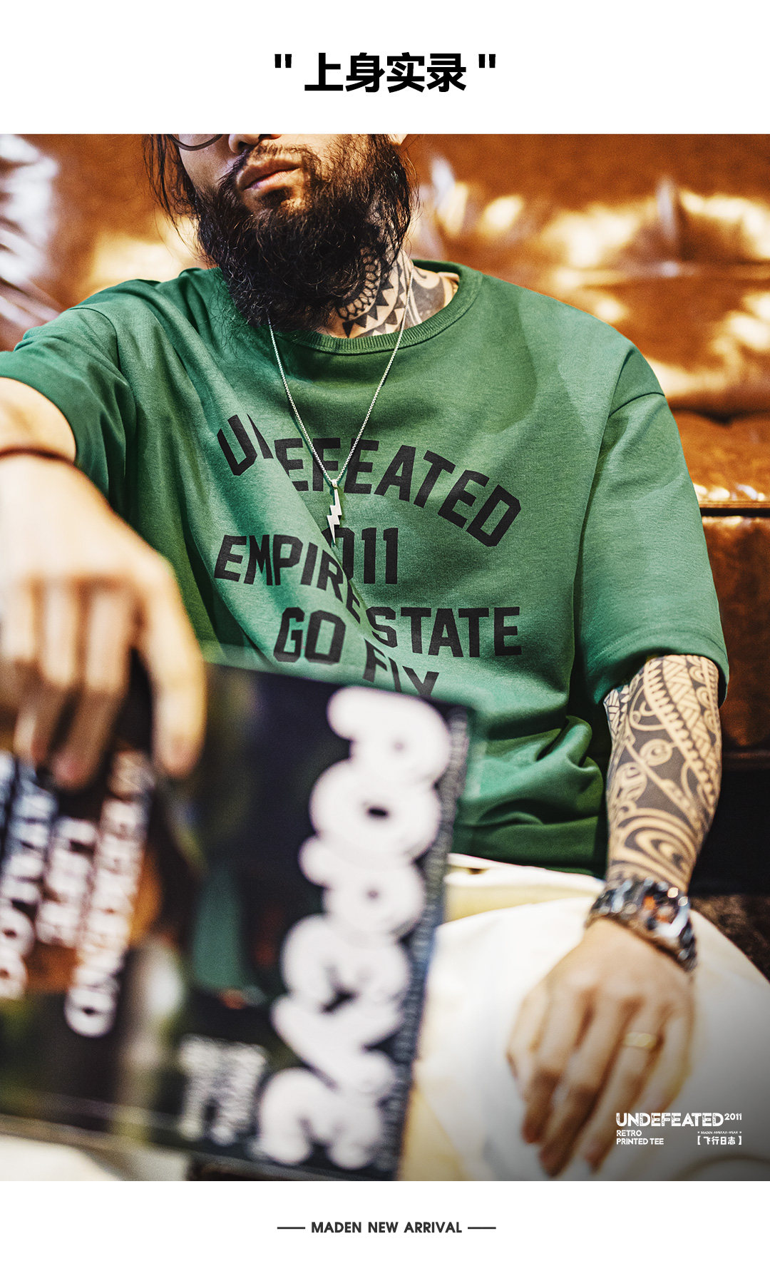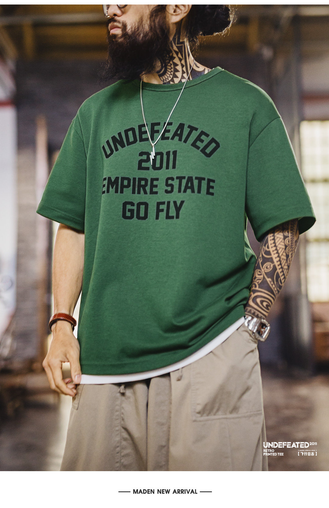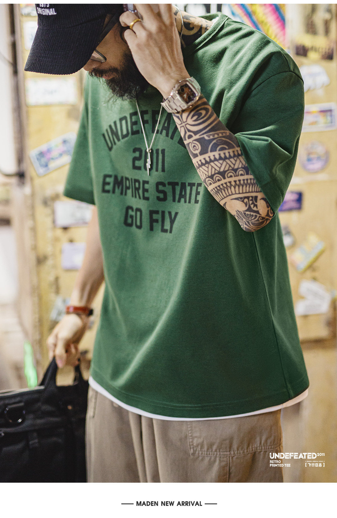 马登工装美式章仔印花T恤绿色小众圆领正肩设计感短袖上衣男款夏