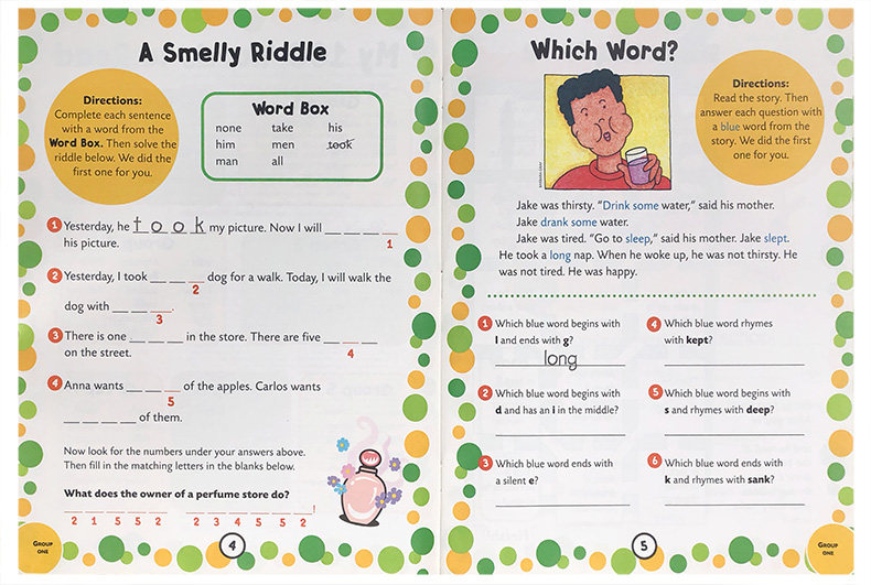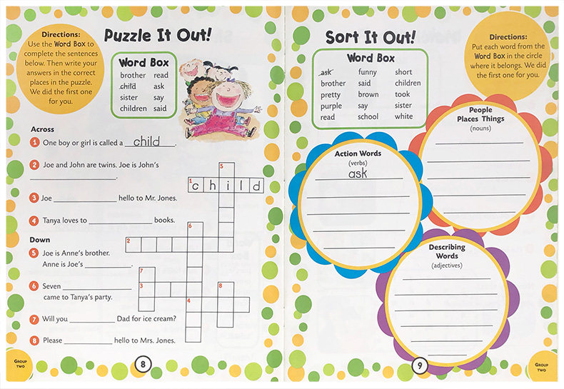 1.全面系统:练习册把SightWord用常见句型的形式展示,然后以游戏练习的方式和孩子互动。这样可以学习了一个常见句型+某一主题的相关词汇。这对拓展主题词,用替换主题词的方式来巩固某个日常句型非常有帮助。
