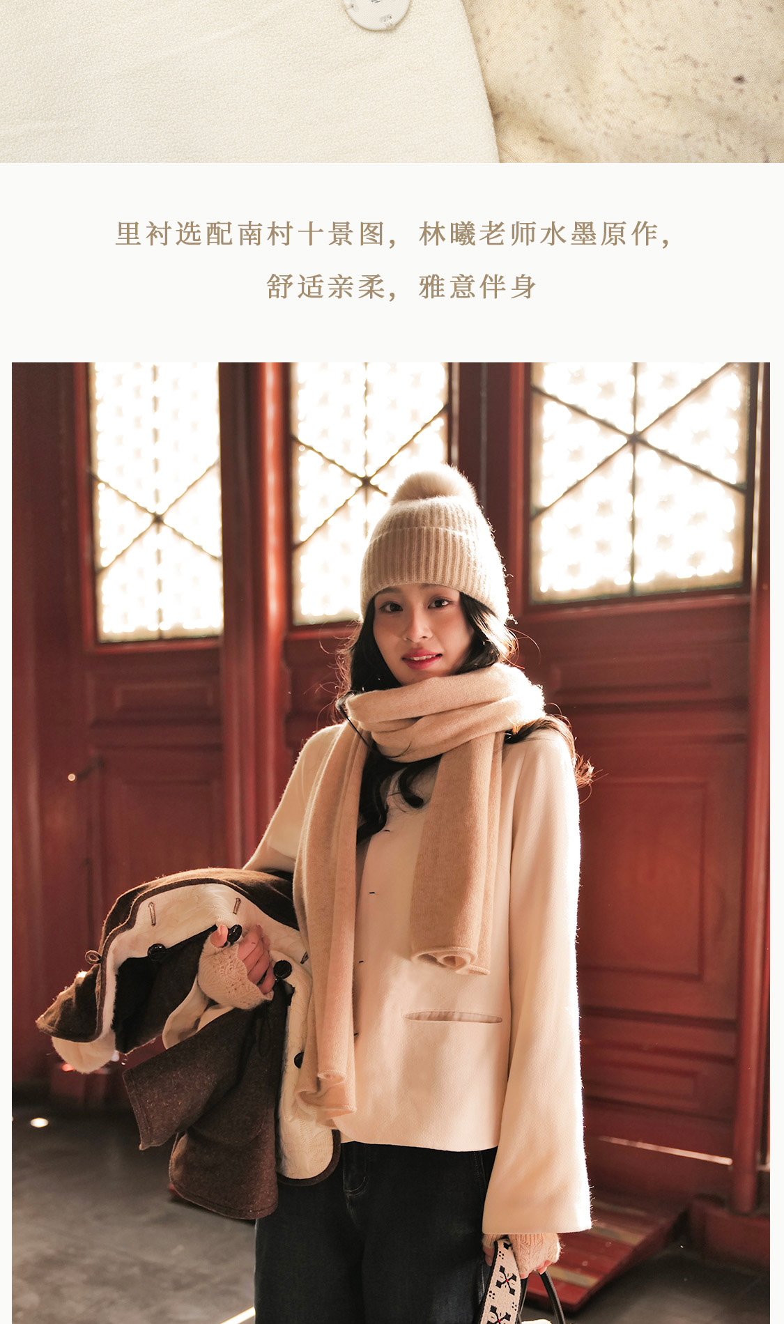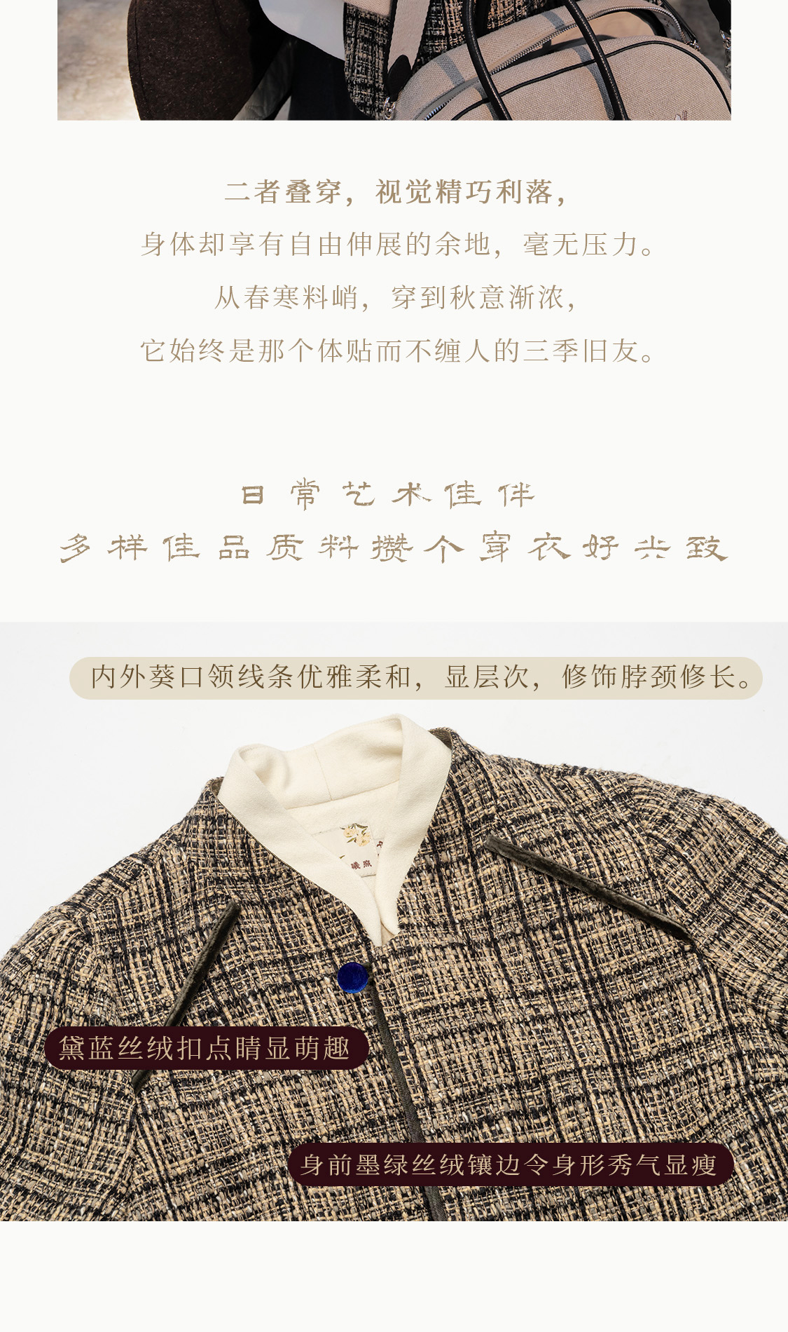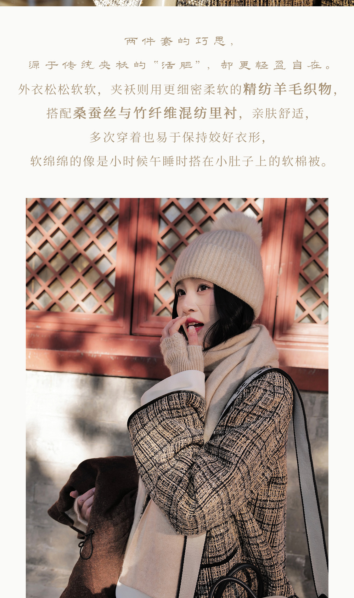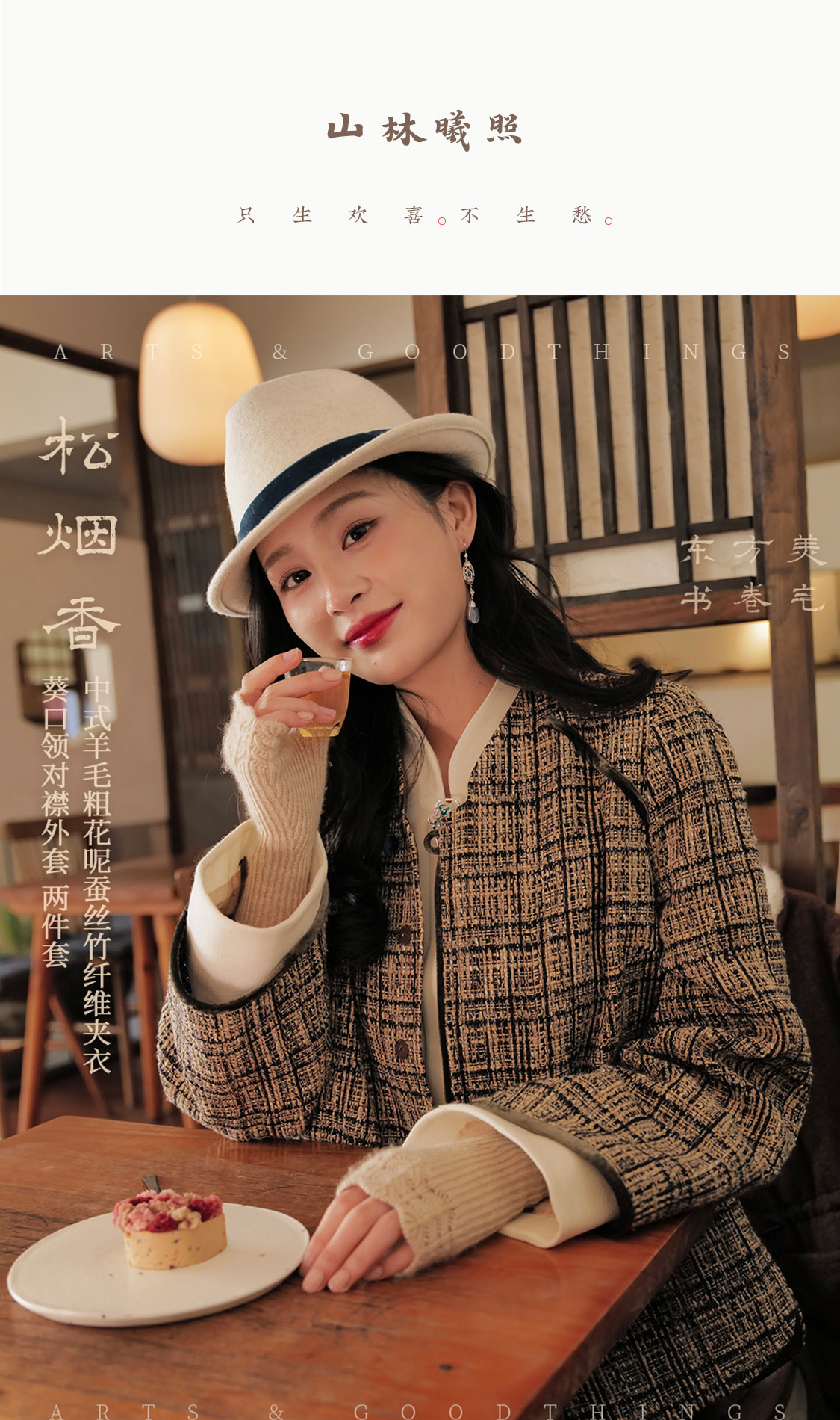 松烟香 中式羊毛粗花呢蚕丝竹纤维夹衣葵口领对襟外套 两件套