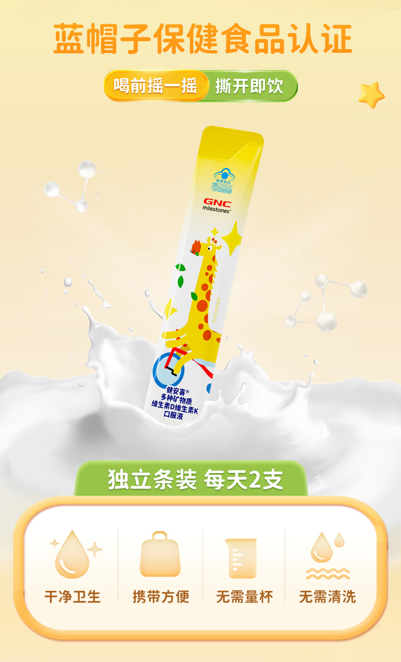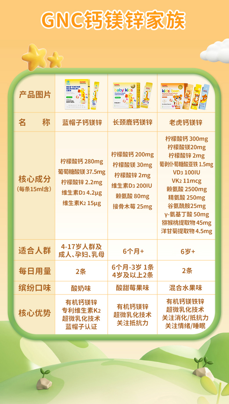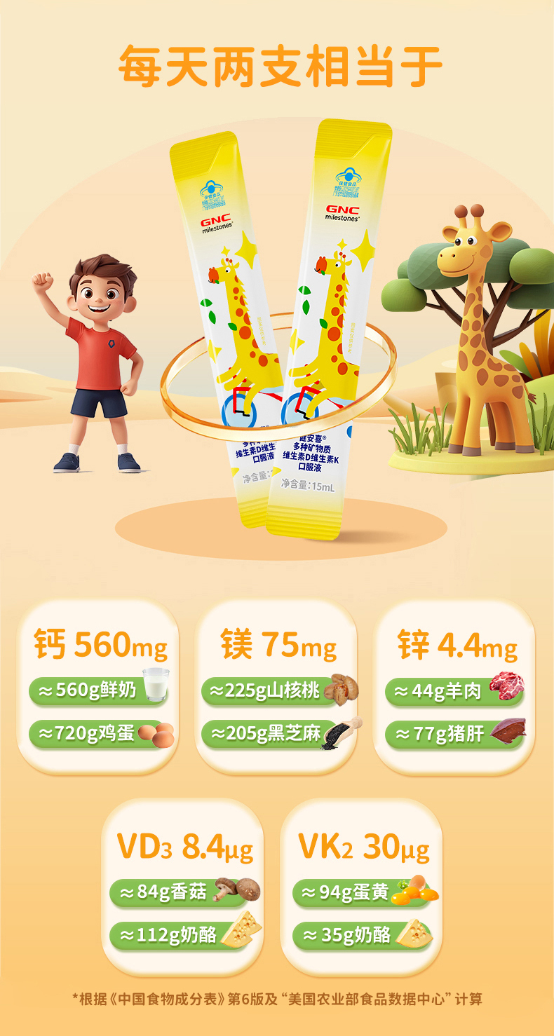 GNC健安喜 儿童液体钙镁锌条矿物质多维生素D3K2钙镁锌口服液成长