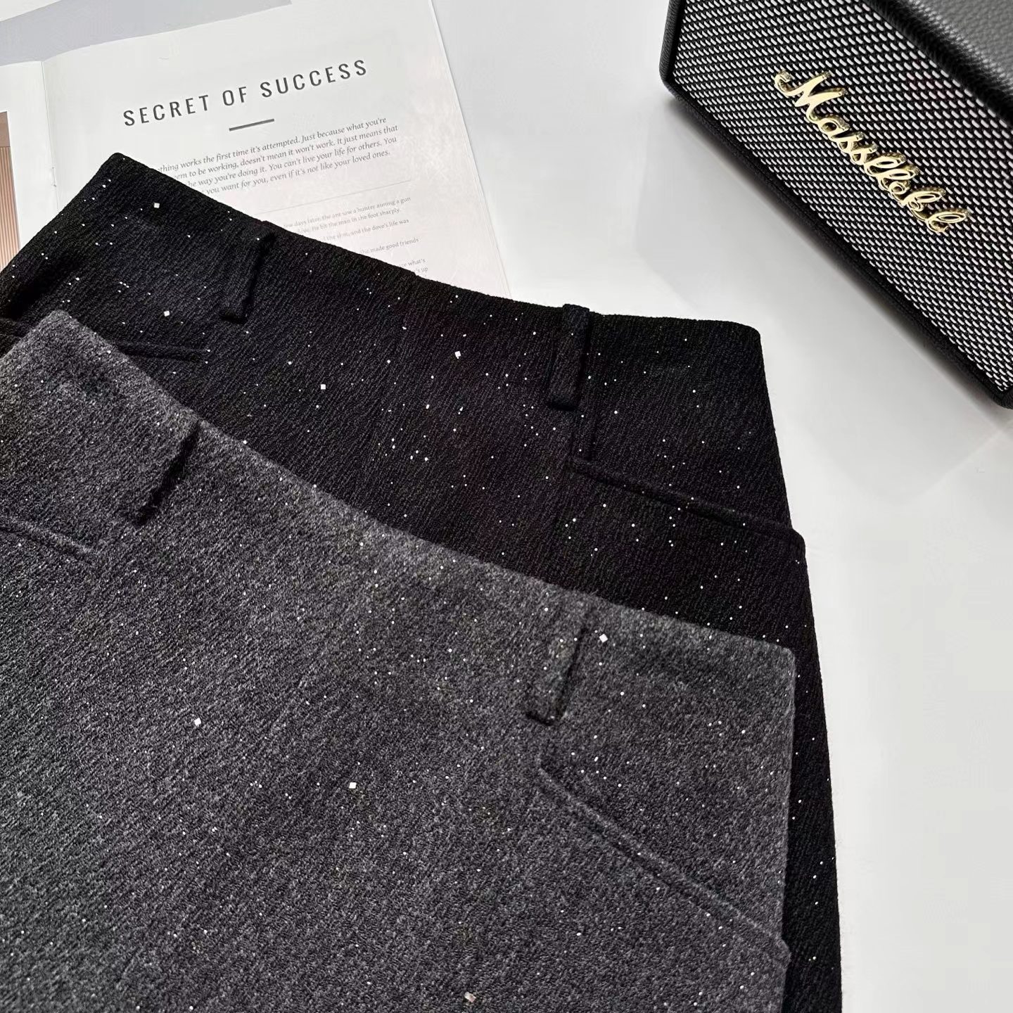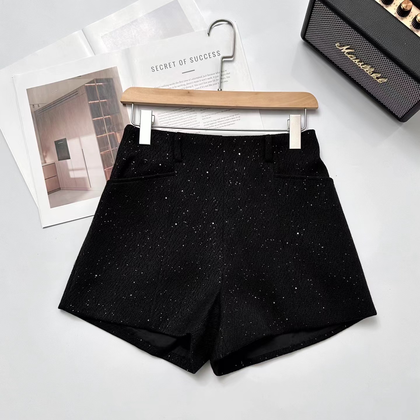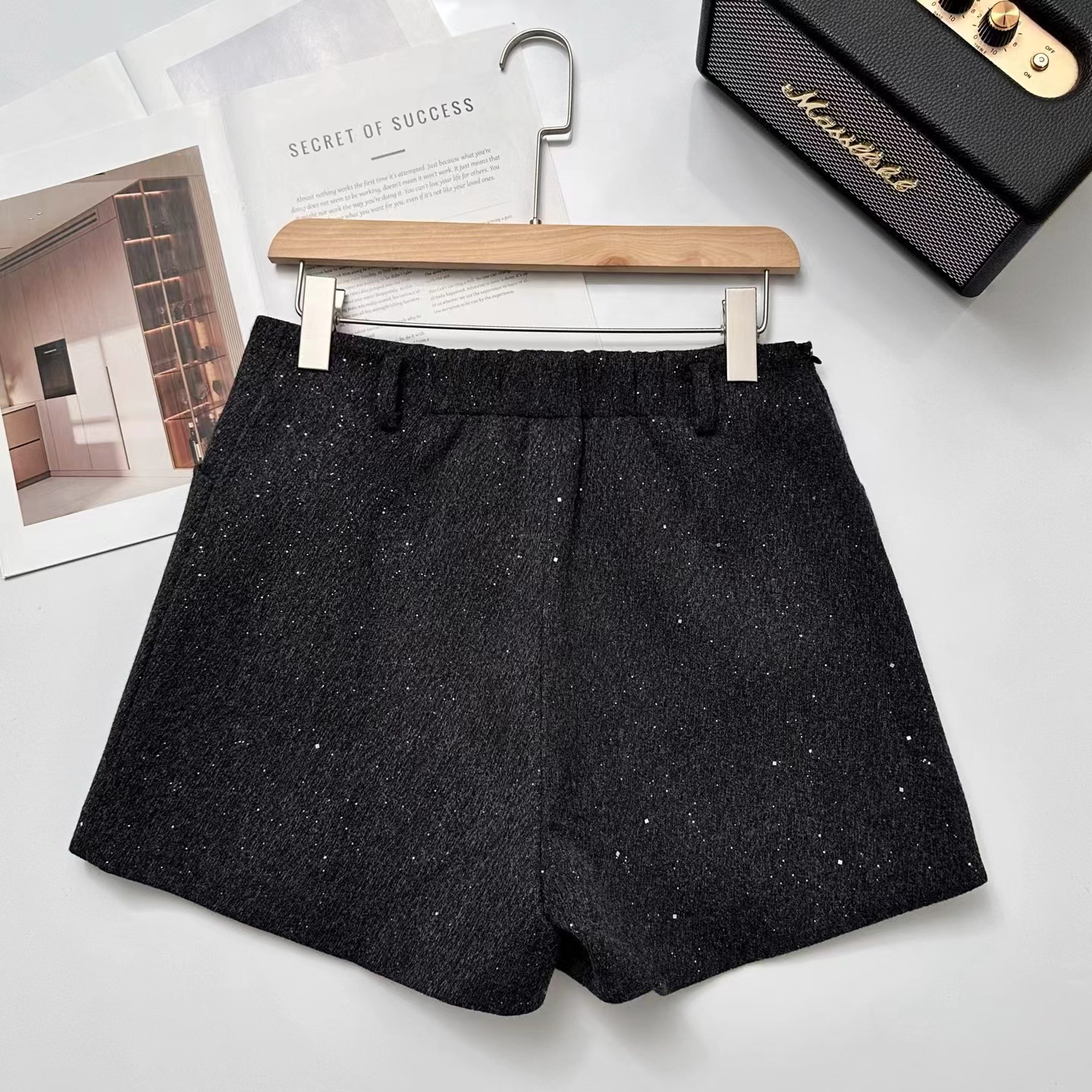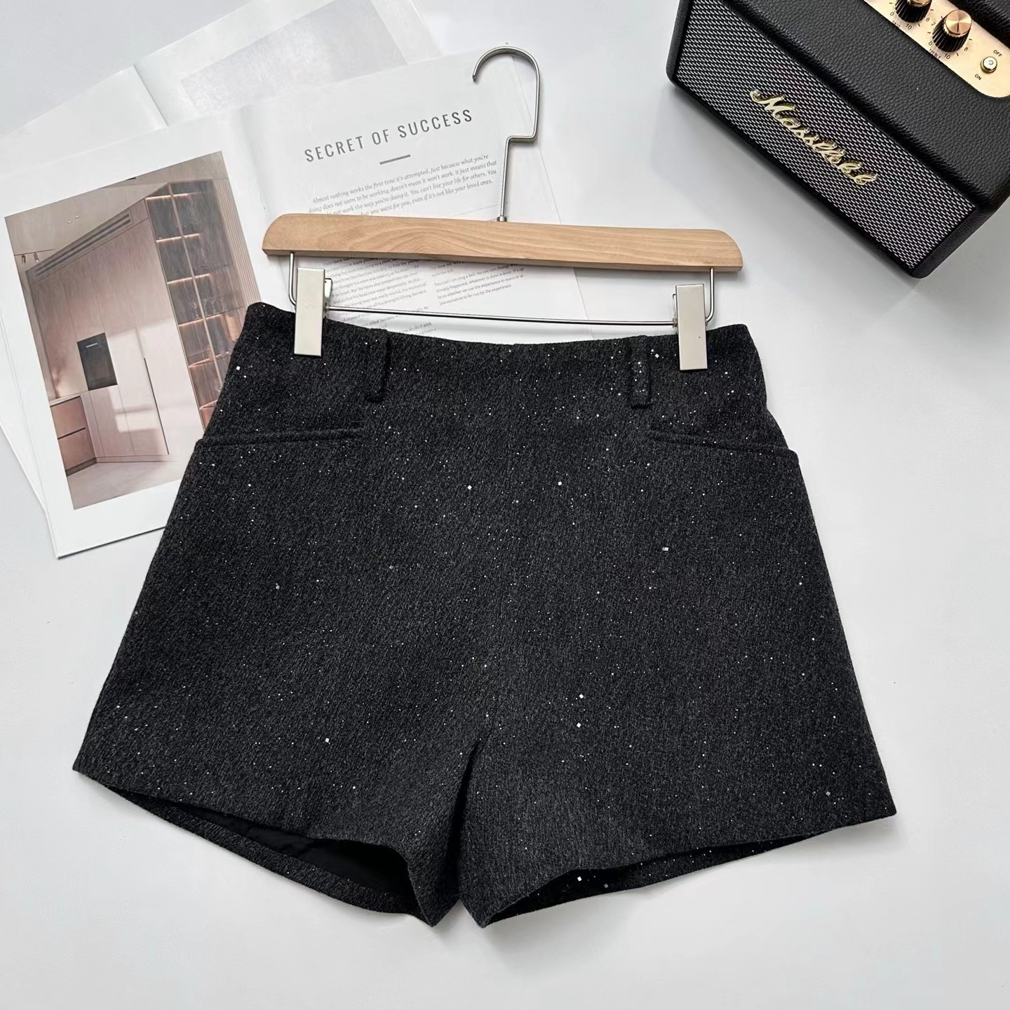 圣诞 年会单品~冬季老钱风亮片羊毛毛呢高腰A字加厚短裤 优雅老钱腔调黄 金臀腿高腰亮片呢短裤~挺括包臀裤型,合体修腿,轻松穿出高挑好比例!多根纱线横竖交织,形成凹凸不平的不规则纹理,呢面带有轻微毛感,手感丰富立体,内里粘衬更挺阔。通过高温压烫后处理工艺,添加不规则大小银片颗粒,使得面料自带特别的闪光效果,保暖高阶,吸睛亮眼!解构感连腰,后松紧腰,对称剪裁塑造连腰门襟造型,修饰腰腹,隐匿肉感,侧边拉链便于日常穿脱,轻松实用,更显腰腹身型纤薄。前片双插袋满足日常置物刚需,亦可凹造型不寡淡,后臀无口袋线条利落,契合西装裤飒爽风格,质感有型。精典直筒裤型,上身带有适度富余松量,包臀修腿裤管微廓的设计,视觉上延伸腿部线条,更美化身型比例!
