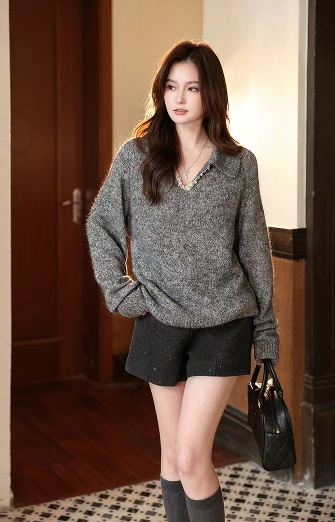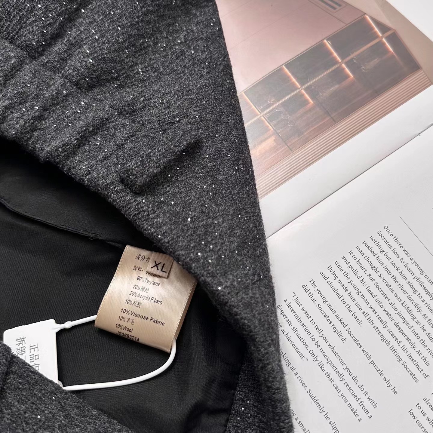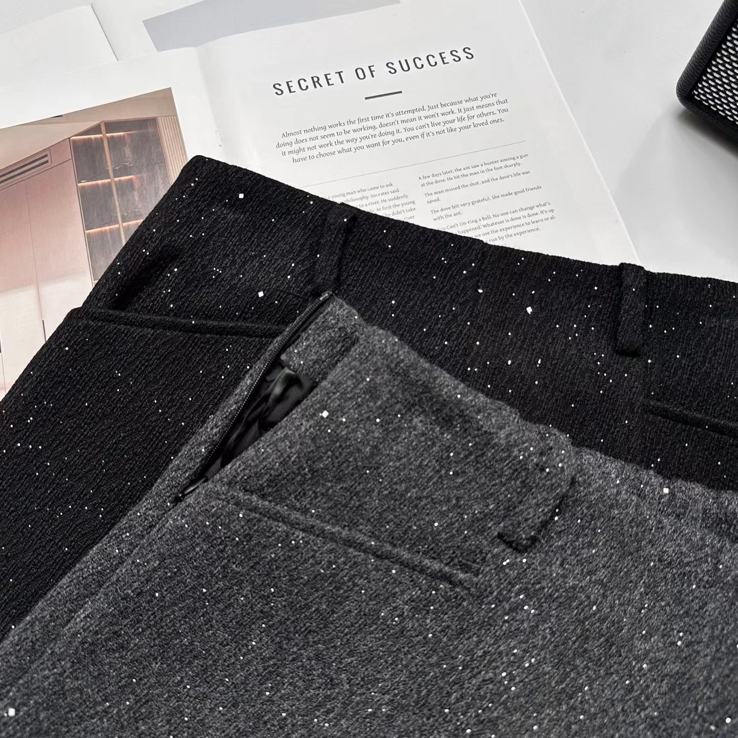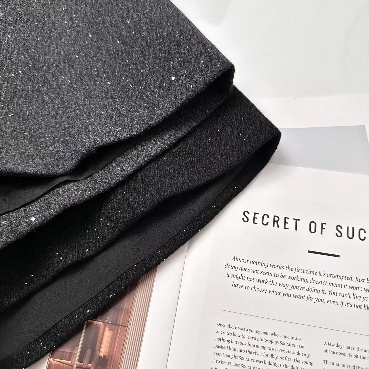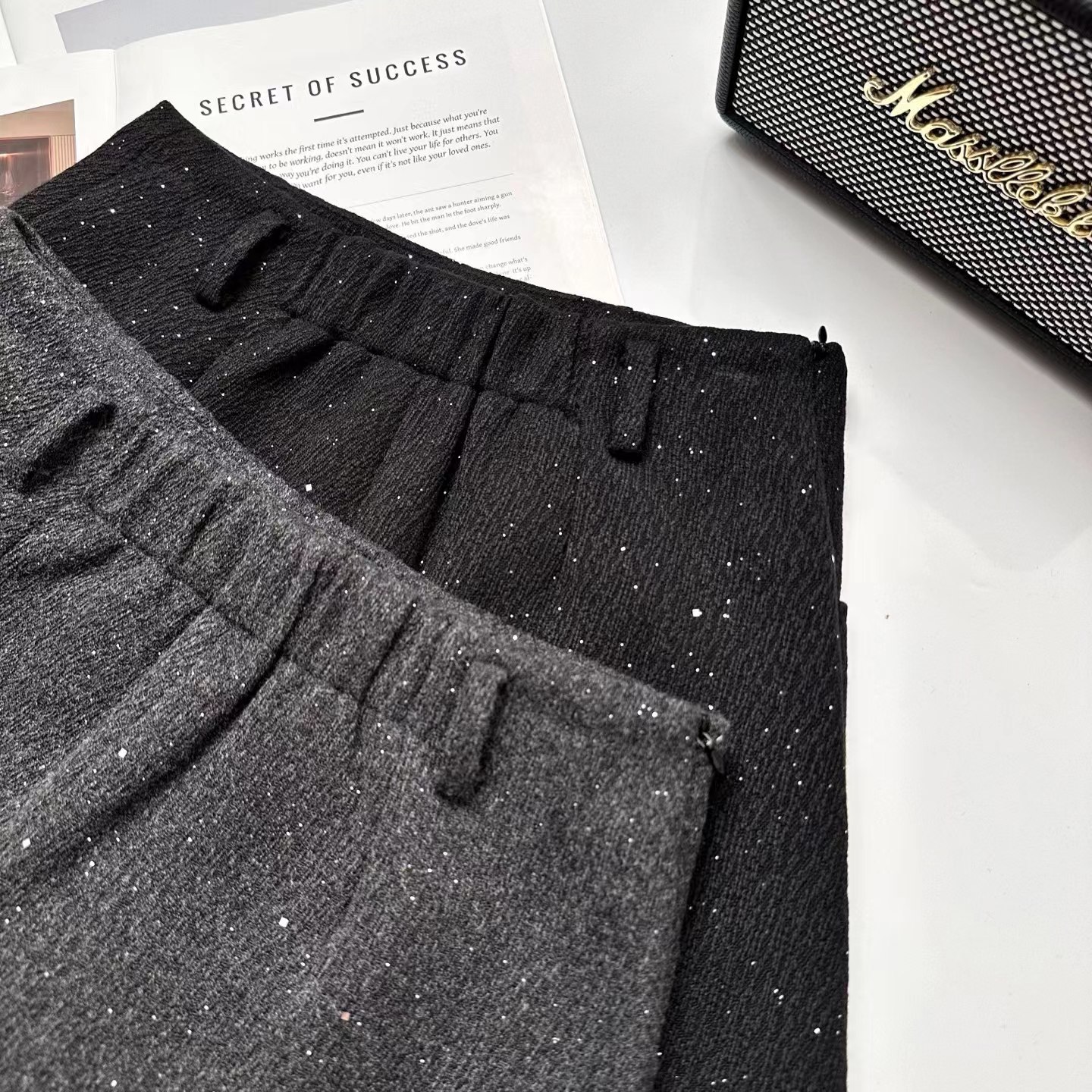 圣诞 年会单品~冬季老钱风亮片羊毛毛呢高腰A字加厚短裤 优雅老钱腔调黄 金臀腿高腰亮片呢短裤~挺括包臀裤型,合体修腿,轻松穿出高挑好比例!多根纱线横竖交织,形成凹凸不平的不规则纹理,呢面带有轻微毛感,手感丰富立体,内里粘衬更挺阔。通过高温压烫后处理工艺,添加不规则大小银片颗粒,使得面料自带特别的闪光效果,保暖高阶,吸睛亮眼!解构感连腰,后松紧腰,对称剪裁塑造连腰门襟造型,修饰腰腹,隐匿肉感,侧边拉链便于日常穿脱,轻松实用,更显腰腹身型纤薄。前片双插袋满足日常置物刚需,亦可凹造型不寡淡,后臀无口袋线条利落,契合西装裤飒爽风格,质感有型。精典直筒裤型,上身带有适度富余松量,包臀修腿裤管微廓的设计,视觉上延伸腿部线条,更美化身型比例!