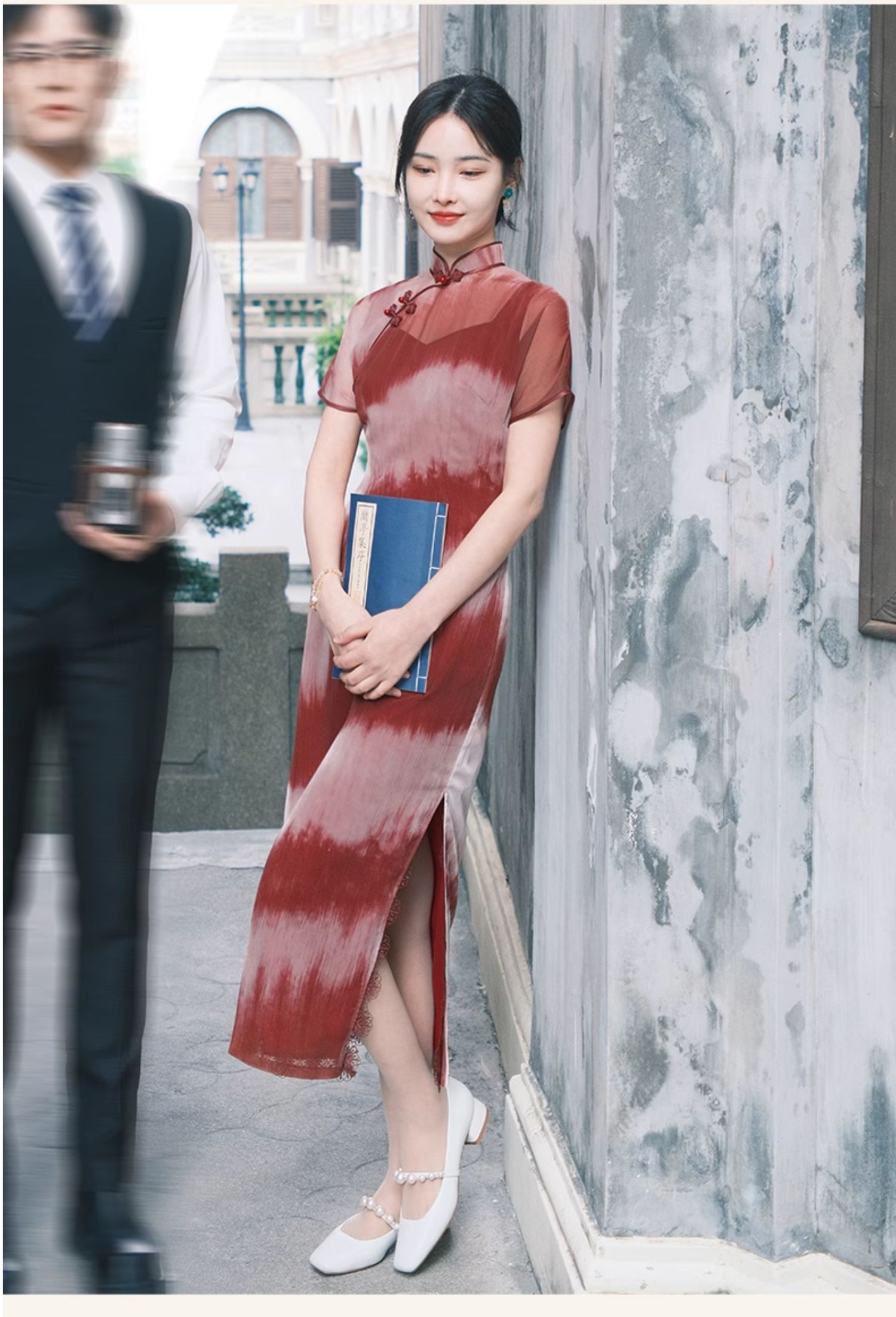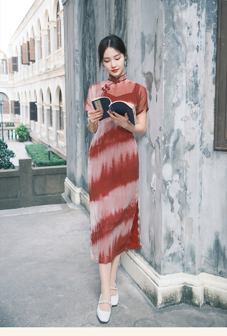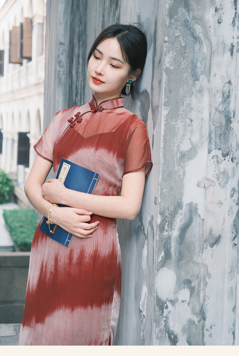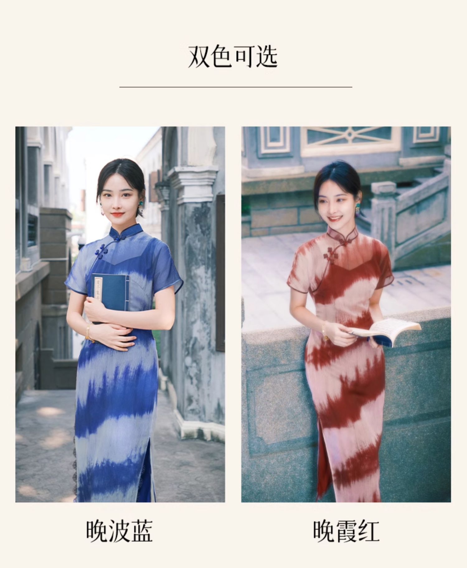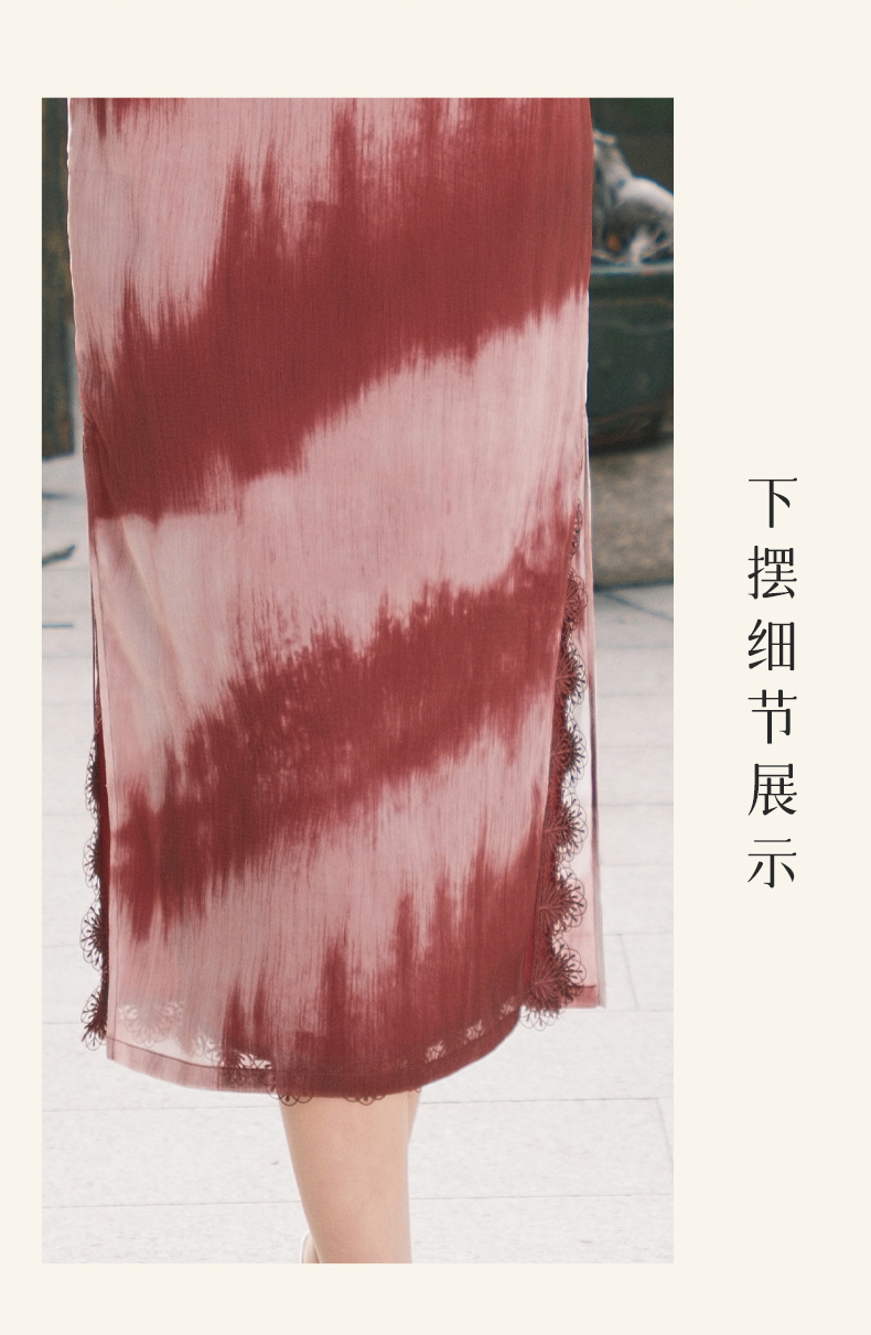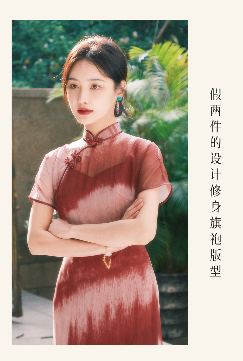 逸红颜夕霞2025夏新植物渐变染轻盈双绉雪纺蕾丝衬裙复古修身旗袍