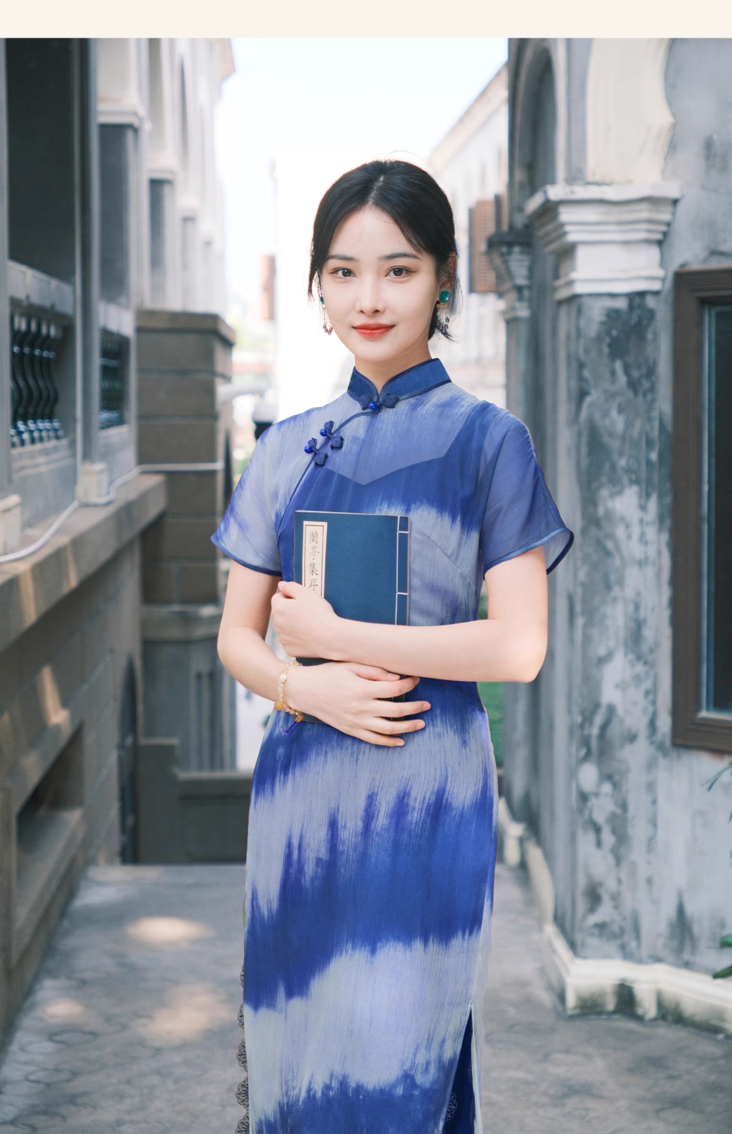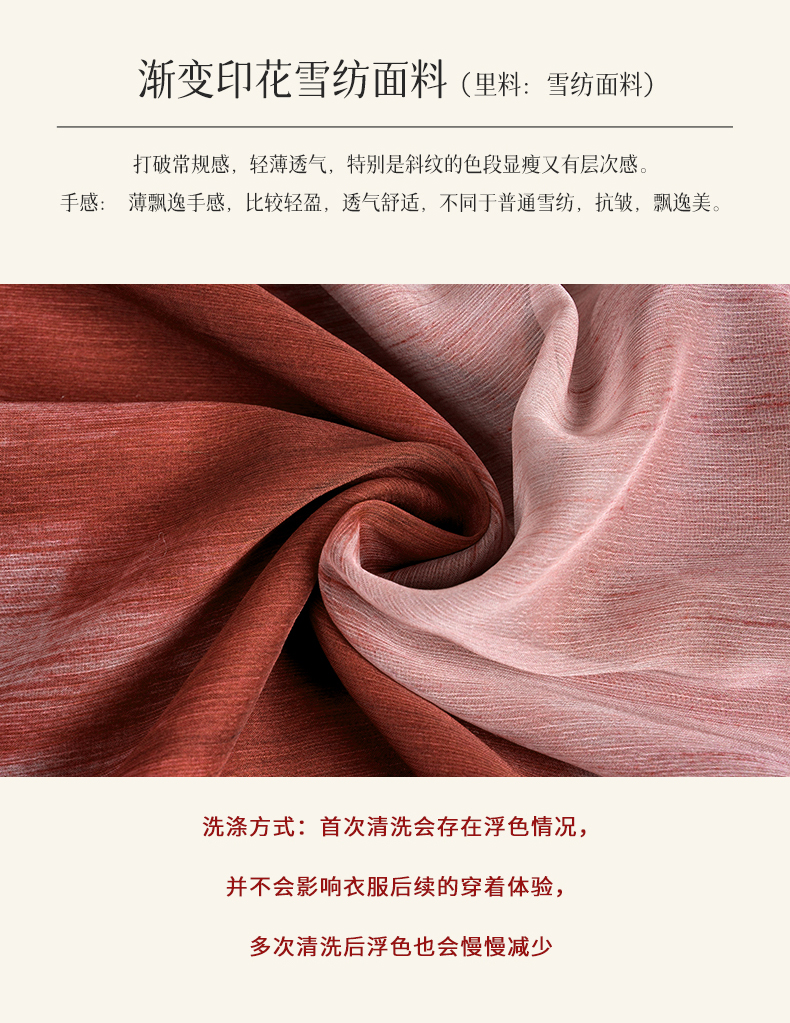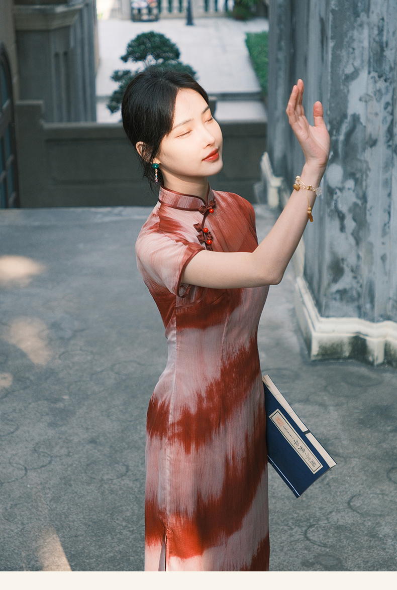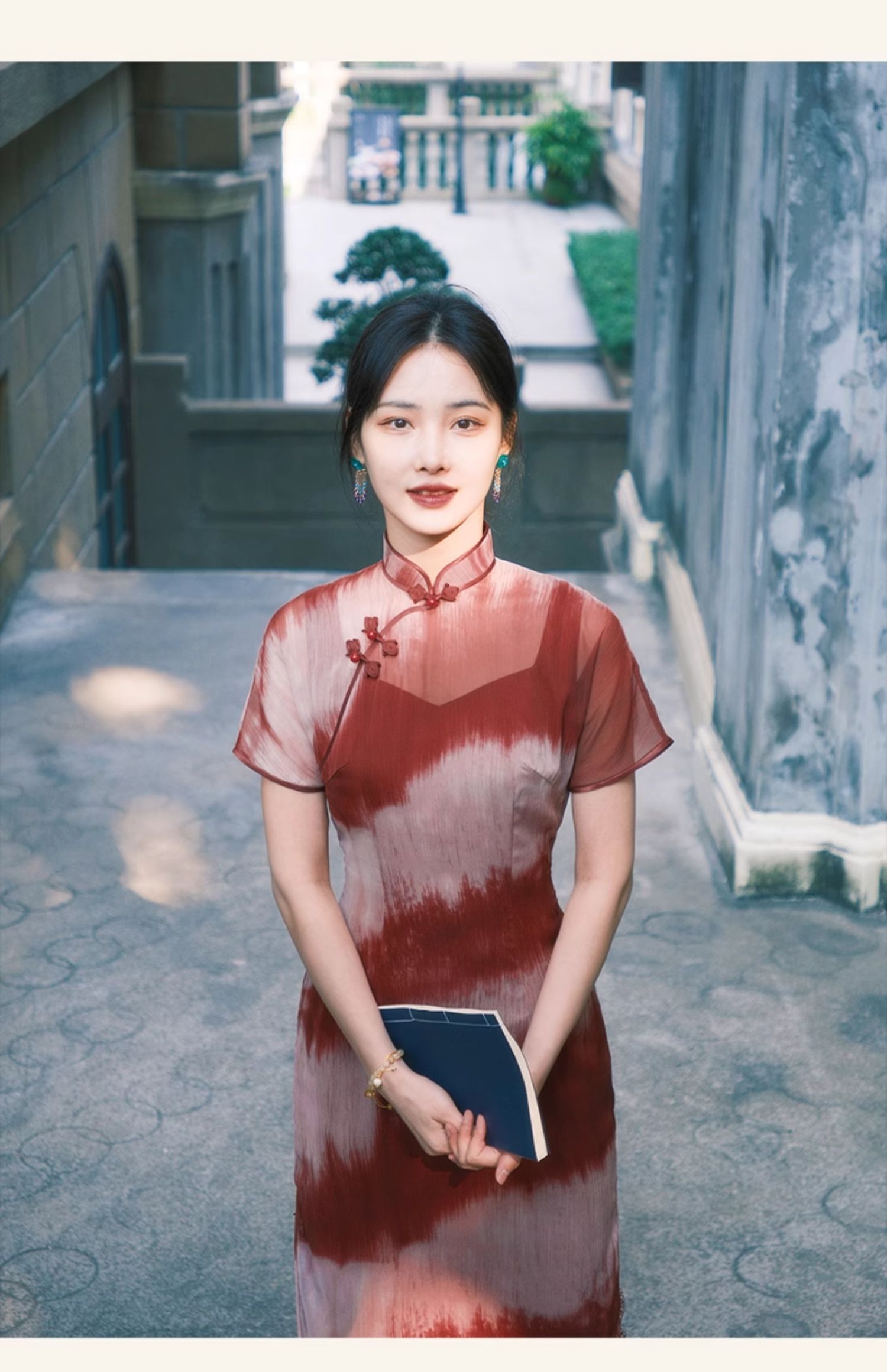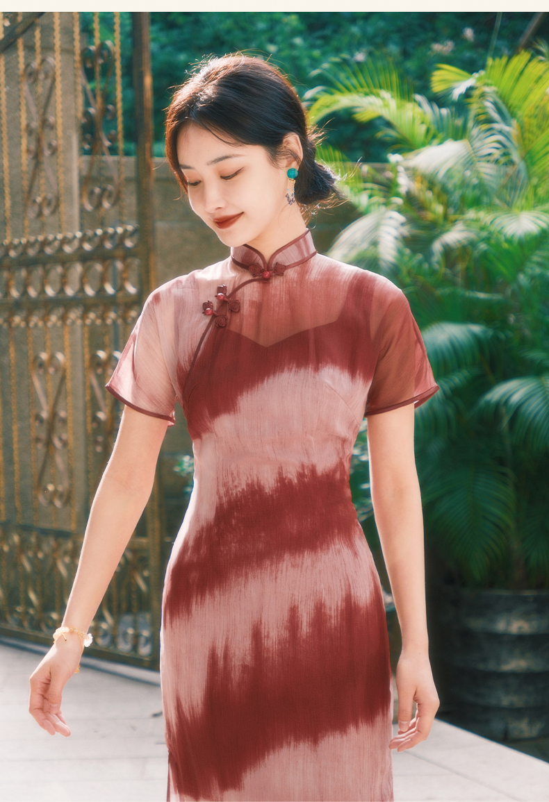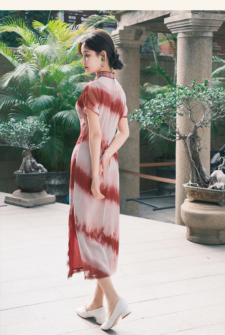逸红颜夕霞2025夏新植物渐变染轻盈双绉雪纺蕾丝衬裙复古修身旗袍