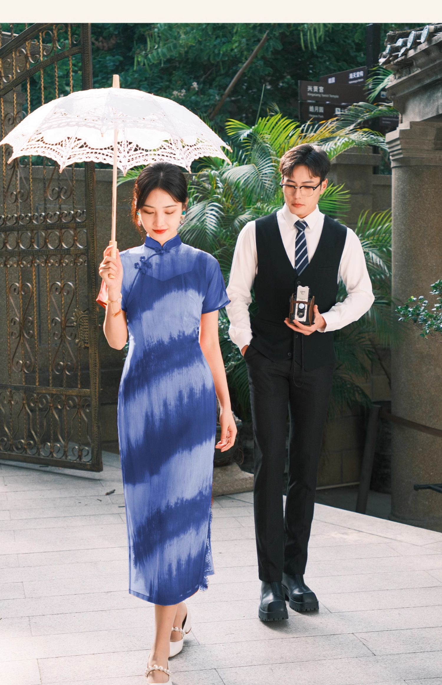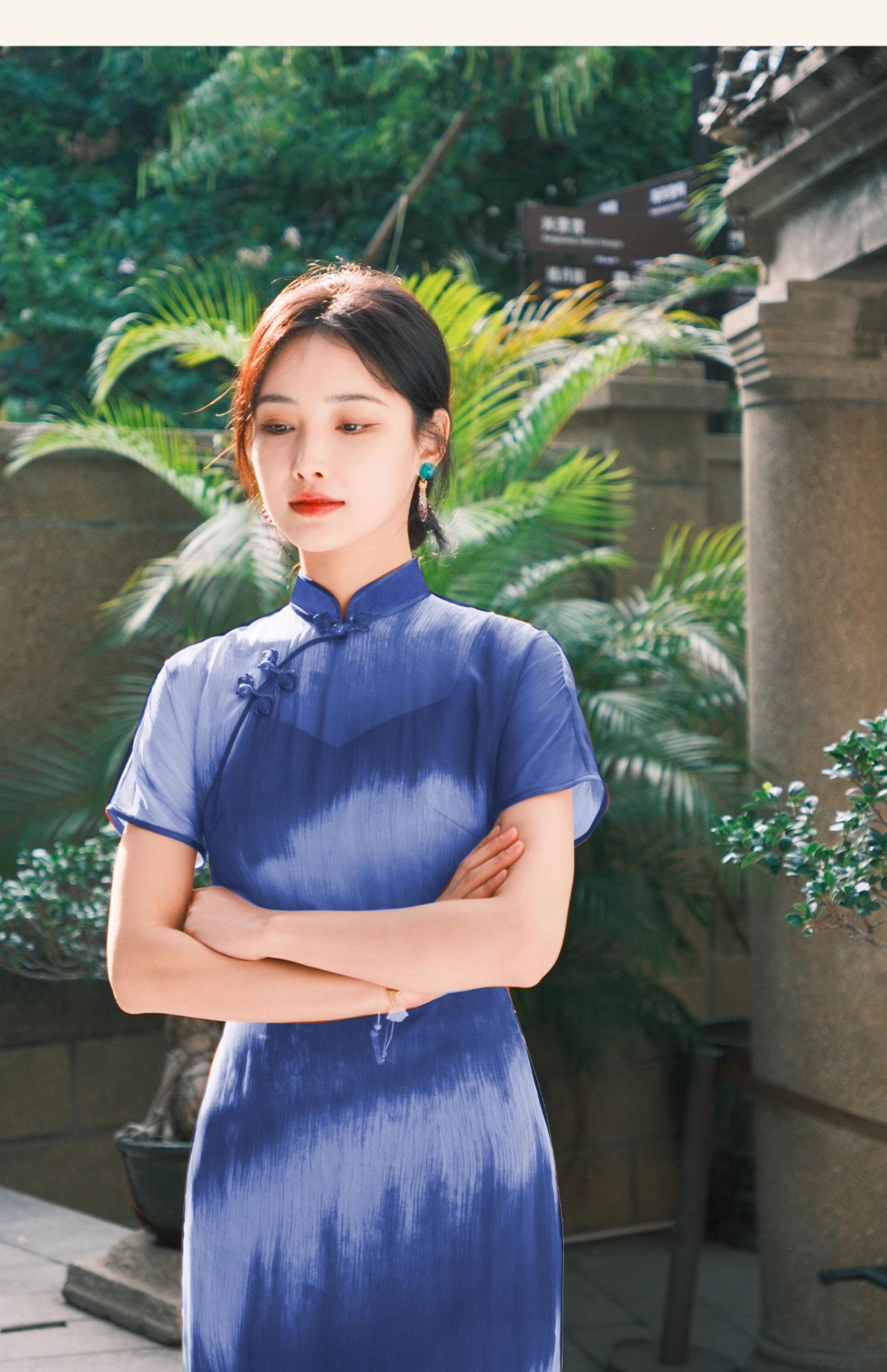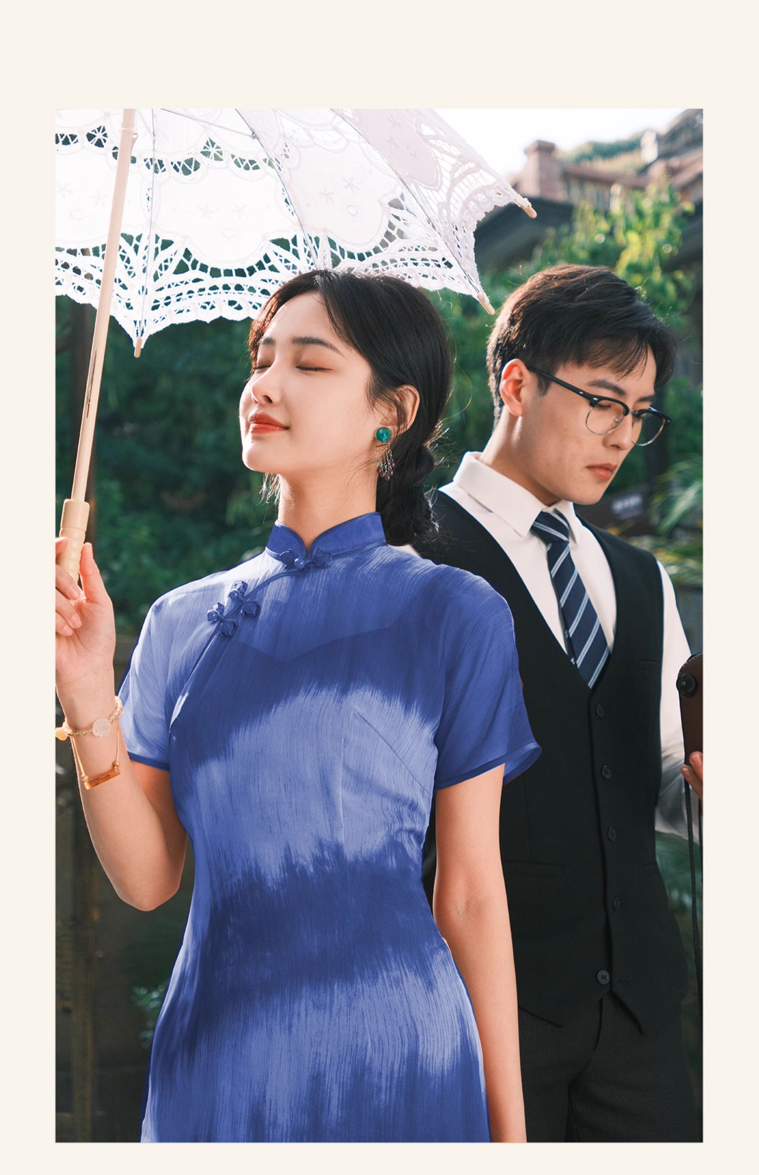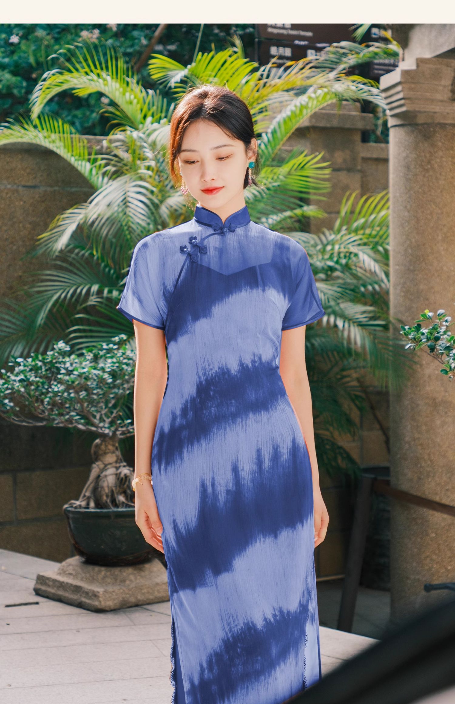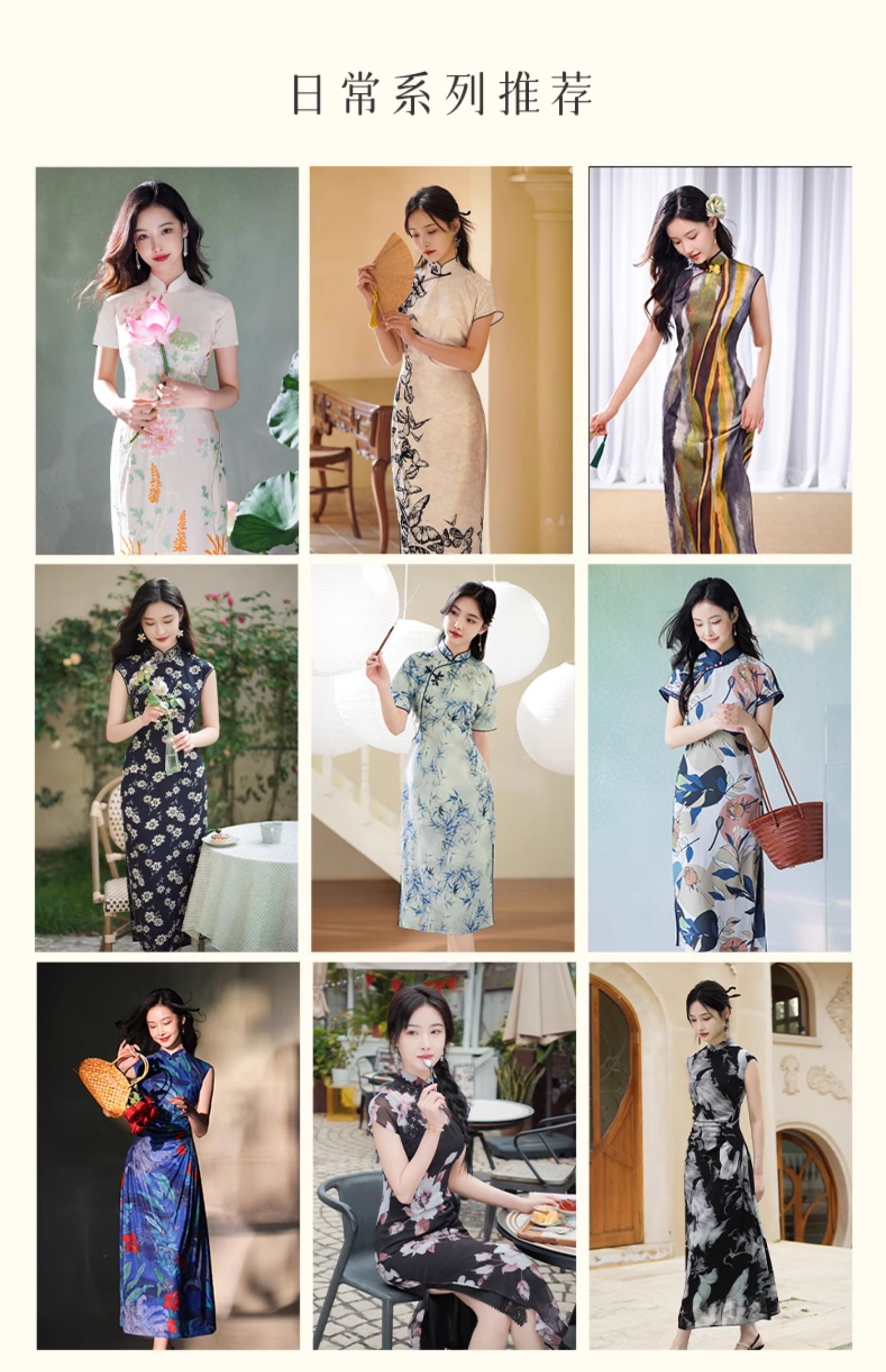 逸红颜夕霞2025夏新植物渐变染轻盈双绉雪纺蕾丝衬裙复古修身旗袍
