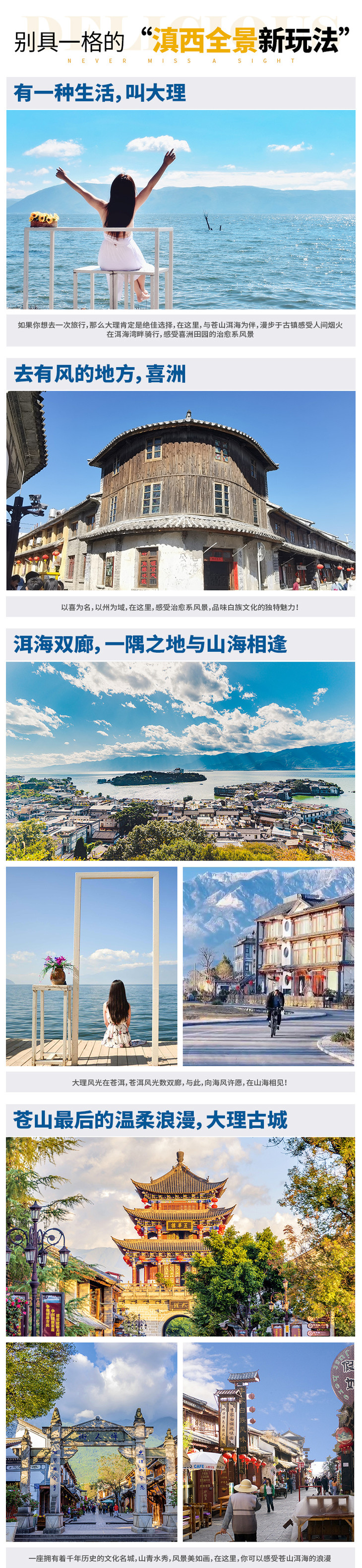 早餐后统一出发前往以风花雪月著称的大理,沿楚大新高速约4小时抵达苍海风光第一镇【双廊古镇】。苍山不墨千秋画,洱海无弦万古琴,当您亲临此地,苍洱风光尽收眼底,水天一色,碧波万顷,鸥鸭翔集,只疑是天上人间。午餐后前往喜洲古镇,游览喜洲田园风光,打卡转角楼,漫步在古镇里尽享闲暇时光。游览古镇后我们前往【洱海生态走廊】,这里是当下大理最为火热的网红打卡之地,到大理必打卡之地,我们漫步前往磻溪村S湾,尽情美拍,或可骑行于生态走廊,欣赏洱海无限风光,绝对让您不虚此行。这里纯净的蓝天,清澈的洱海,走进这里,你不用去爱琴海,也可以感受一样的浪漫。下午适时沿洱海环海路前往大理古城区入住酒店或客栈。