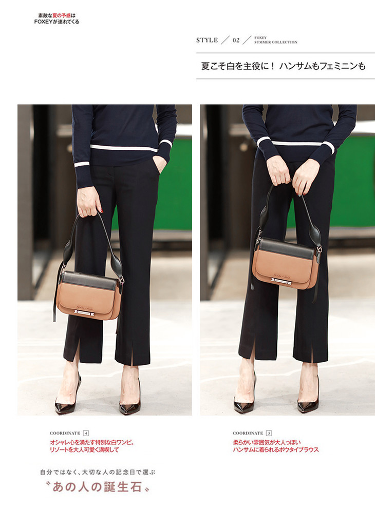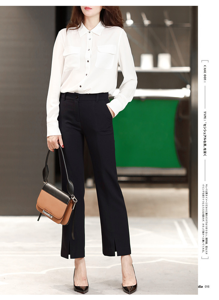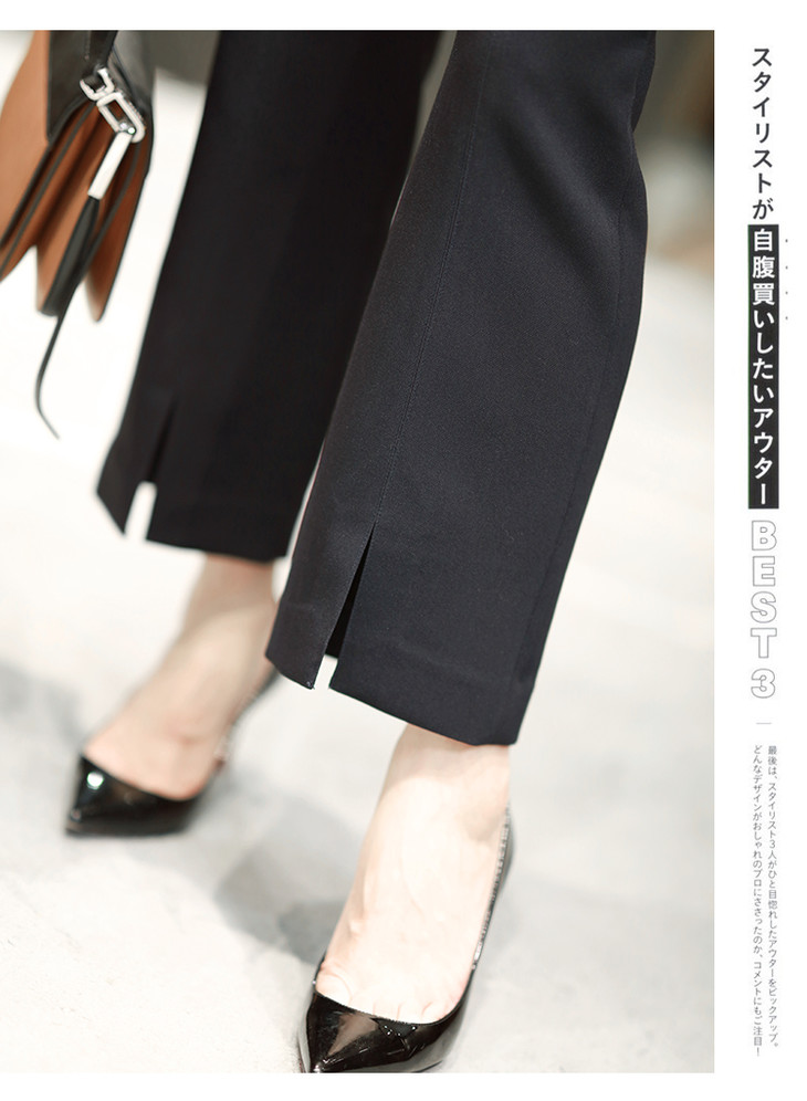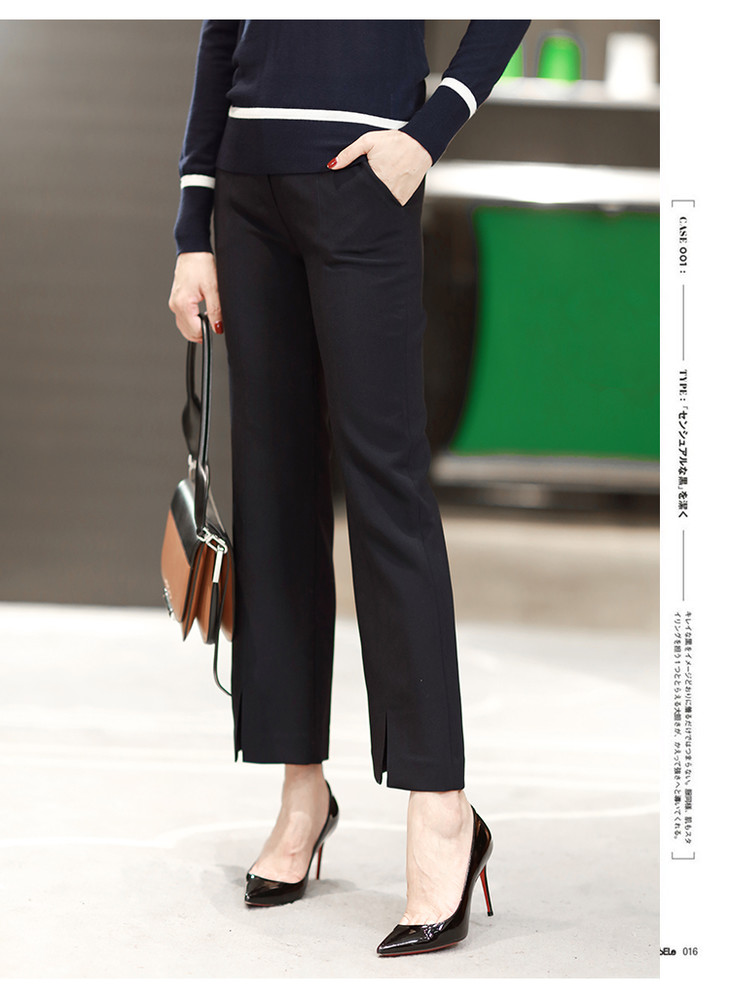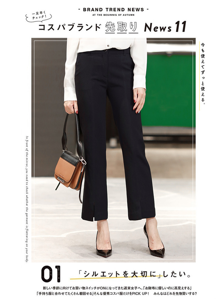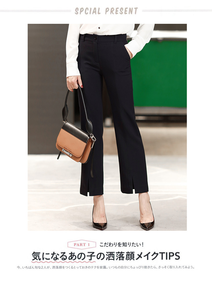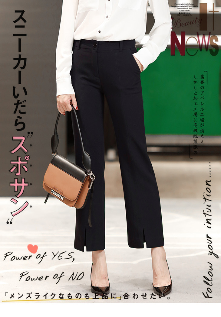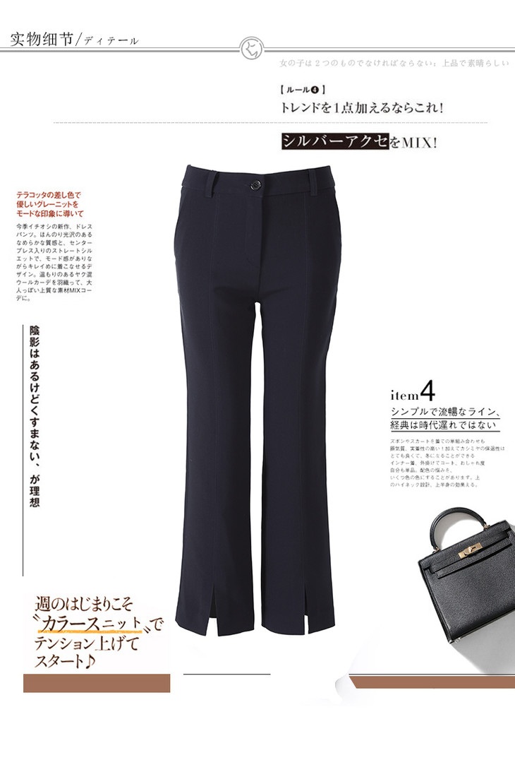 有气场又女人的小微喇,裤子是烟管西装裤的改良版本,裤脚是微喇,这就是这件西装裤不一样的地方,小腿TE别显细,而且很有女人味,又有气场;前后中缝明线,走线清晰笔直,一眼就能看出做工的高下,还有个别致的地方,就是裤脚的前开叉设计,跟前中缝浑然天成的衔接,九分的裤长,通勤着装好搭款。