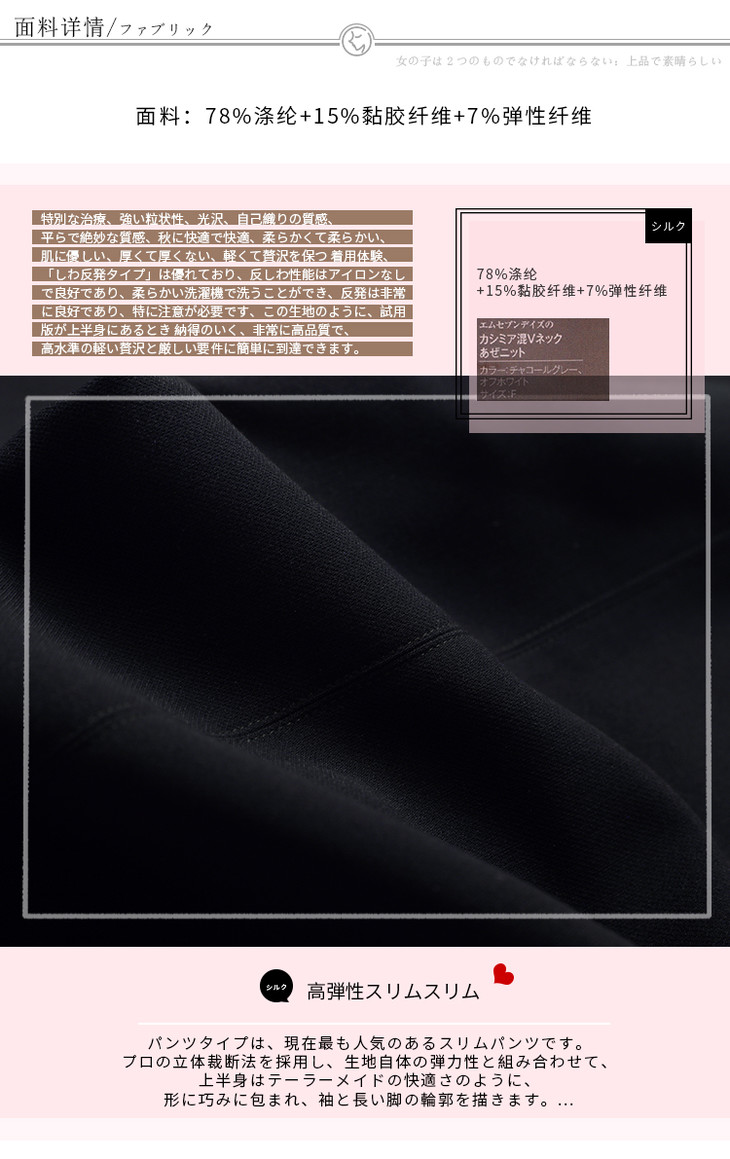 特殊工艺处理,布面颗粒感强,光泽、自带针织肌理,外观平整精美有质感、秋季穿着恒温舒适,手感垂软、挺括柔软又亲肤、有厚度但不厚重、保持着轻质高奢的穿着体验,《抗皱 回弹 保型》都出SE,抗皱性能好 无须熨烫,可轻柔机洗,回弹很好,又TE别好打理,CHAO喜欢这款面料,试版的时候一上身就折服了,非常有品质感,轻松到达轻奢舒适的高标准严要求。